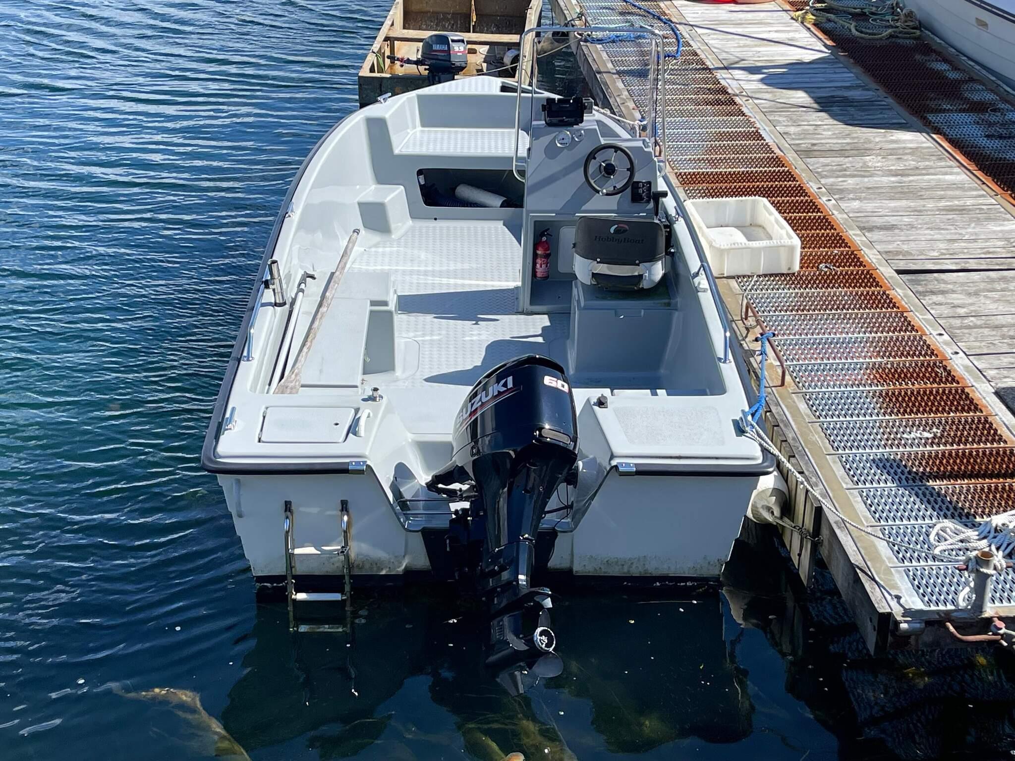 Båt til leie av typen Hobby 555, med 60 HK Suzuki utenbords 4 takts motor.