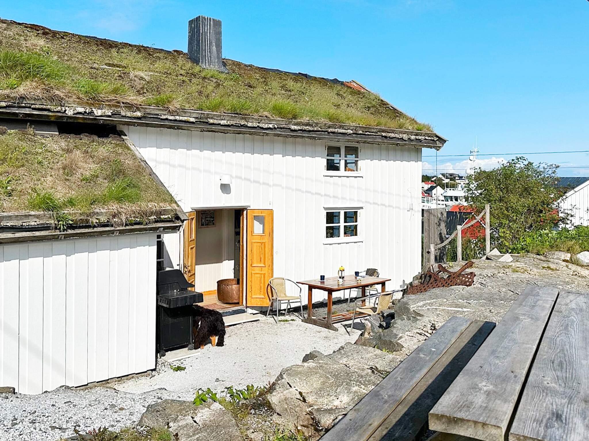 Lun uteplass ved inngangen til feriehuset. Flott sjøutsikt mot Reksundet og solnedgangen fra tomten. Ved huseiers naust, der utleiebåten ligger ved flytebryggen, er det en fin uteplass med utsikt utover sjøen. Kort vei til butikken.