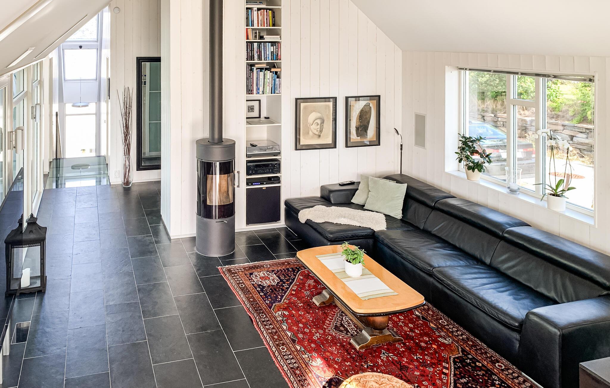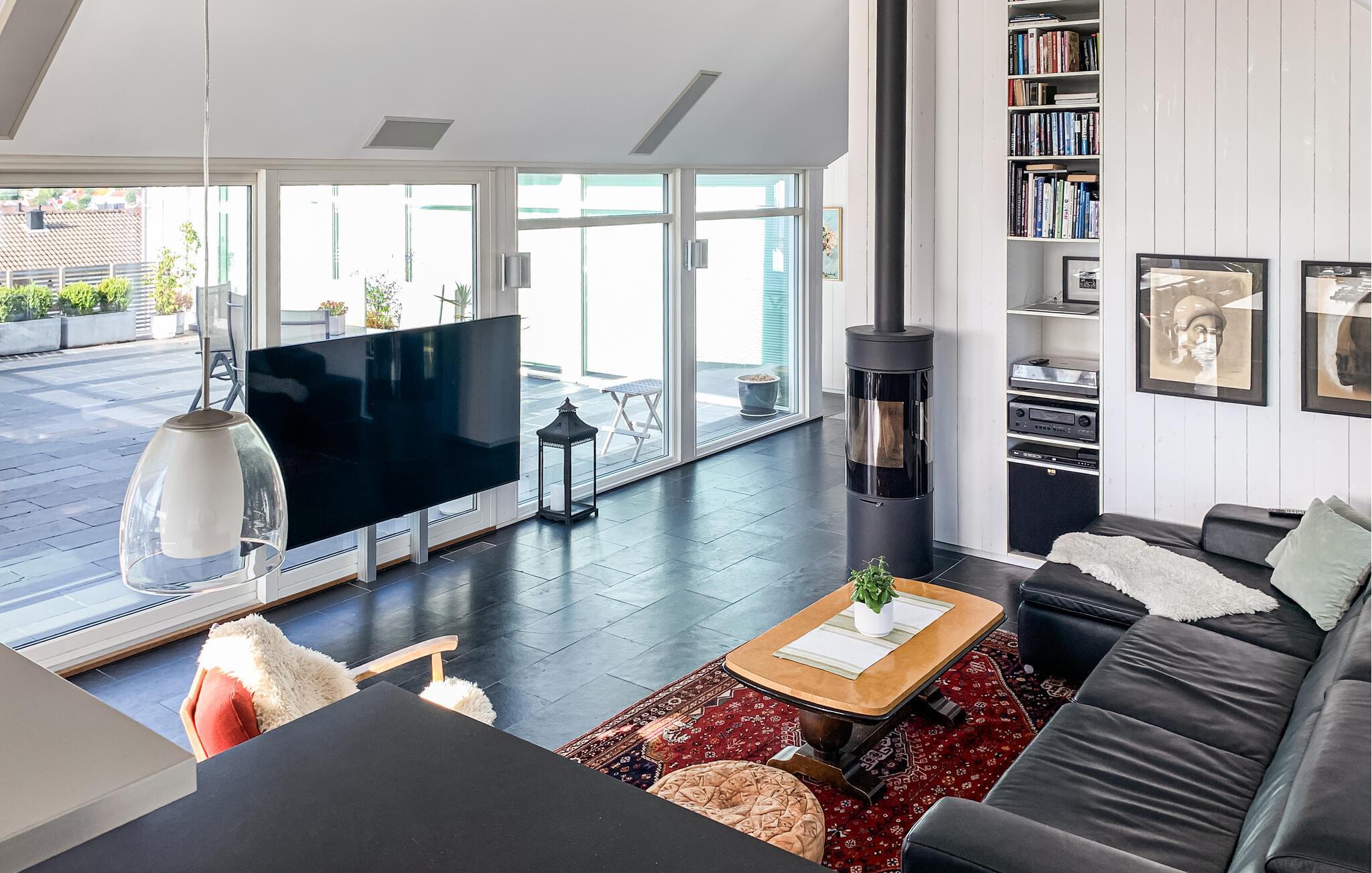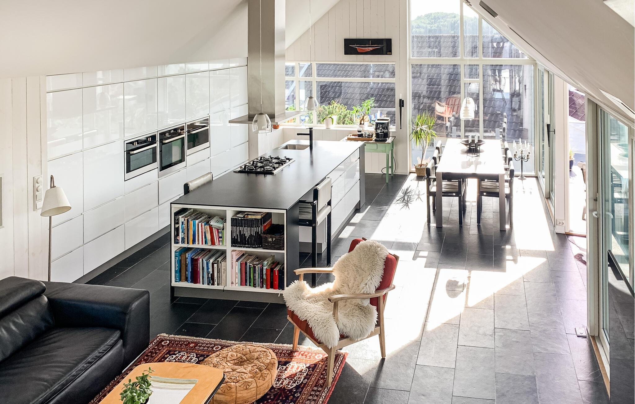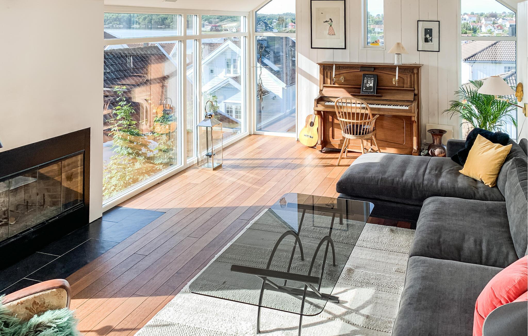 Hold ubekymret ferie i dette stilfulde feriehus, som er noget særligt med smukt designede værelser og højt til loftet. Træd ind og føl jer straks hjemme i den åbne planløsning, som er udstyret med store vinduespartier, elegante møbler og brændeovn. Spil på klaver, slap af på den komfortable sofa eller nyd hyggelige madlavningsaftener i det moderne køkken, som har en rummelig kogeø. Den smagfulde indretning skaber en behagelig atmosfære.