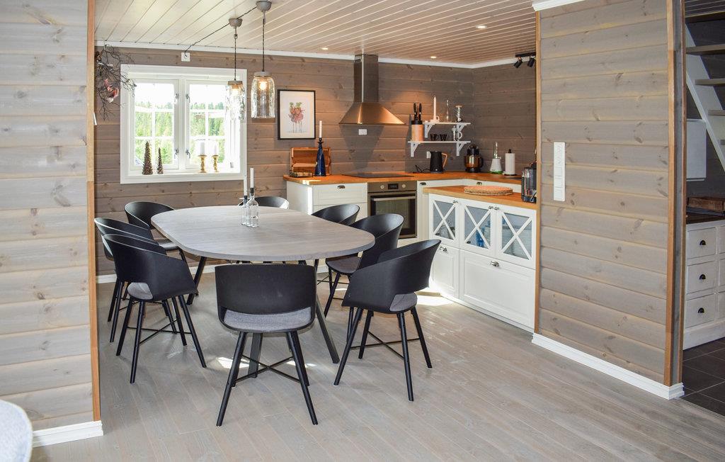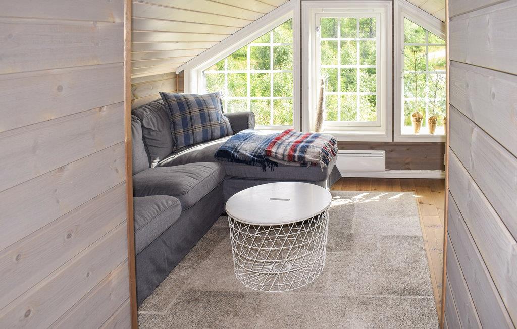 Jeres hyggelige feriehus, beliggende i den imponerende natur ved Omholtfjellet og tæt på naturreservatet Skrim, inviterer jer til et uforglemmeligt ophold. Med sin elegante minimalisme og typiske hyttestil skaber det en varm og indbydende atmosfære. Den åbne boligindretning giver en rummelig følelse, og de mange sprossevinduer lader masser af dagslys strømme ind, samtidig med at I får en skøn udsigt til naturen. Det veludstyrede køkken gør madlavning til en fornøjelse, og ved det store spisebord kan I afslutte aftenerne med hjemmelavede lækkerier eller sjove brætspil. På enten den åbne eller den overdækkede terrasse kan I nyde jeres måltider midt i det idylliske bjerglandskab.