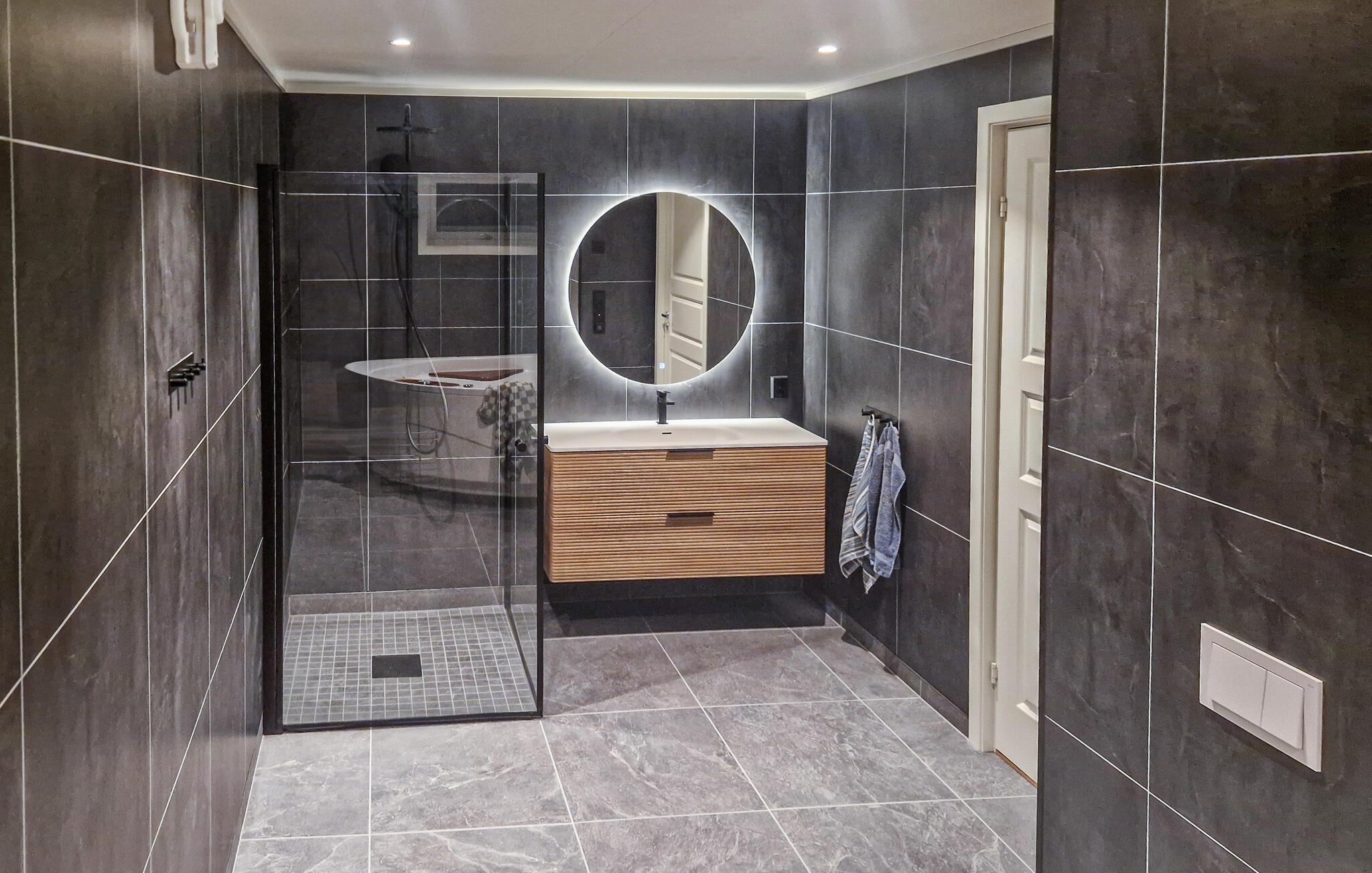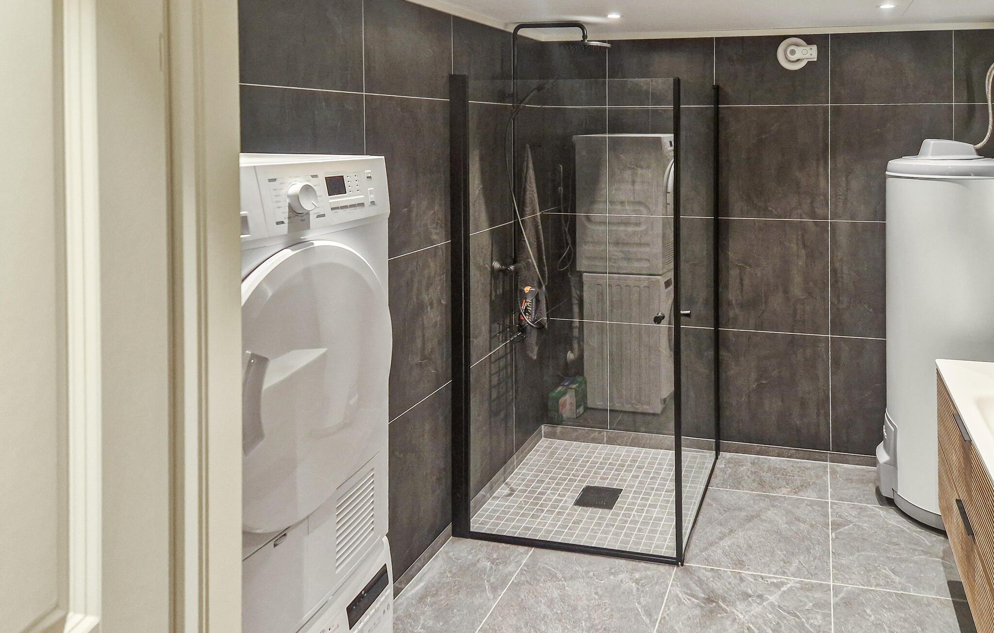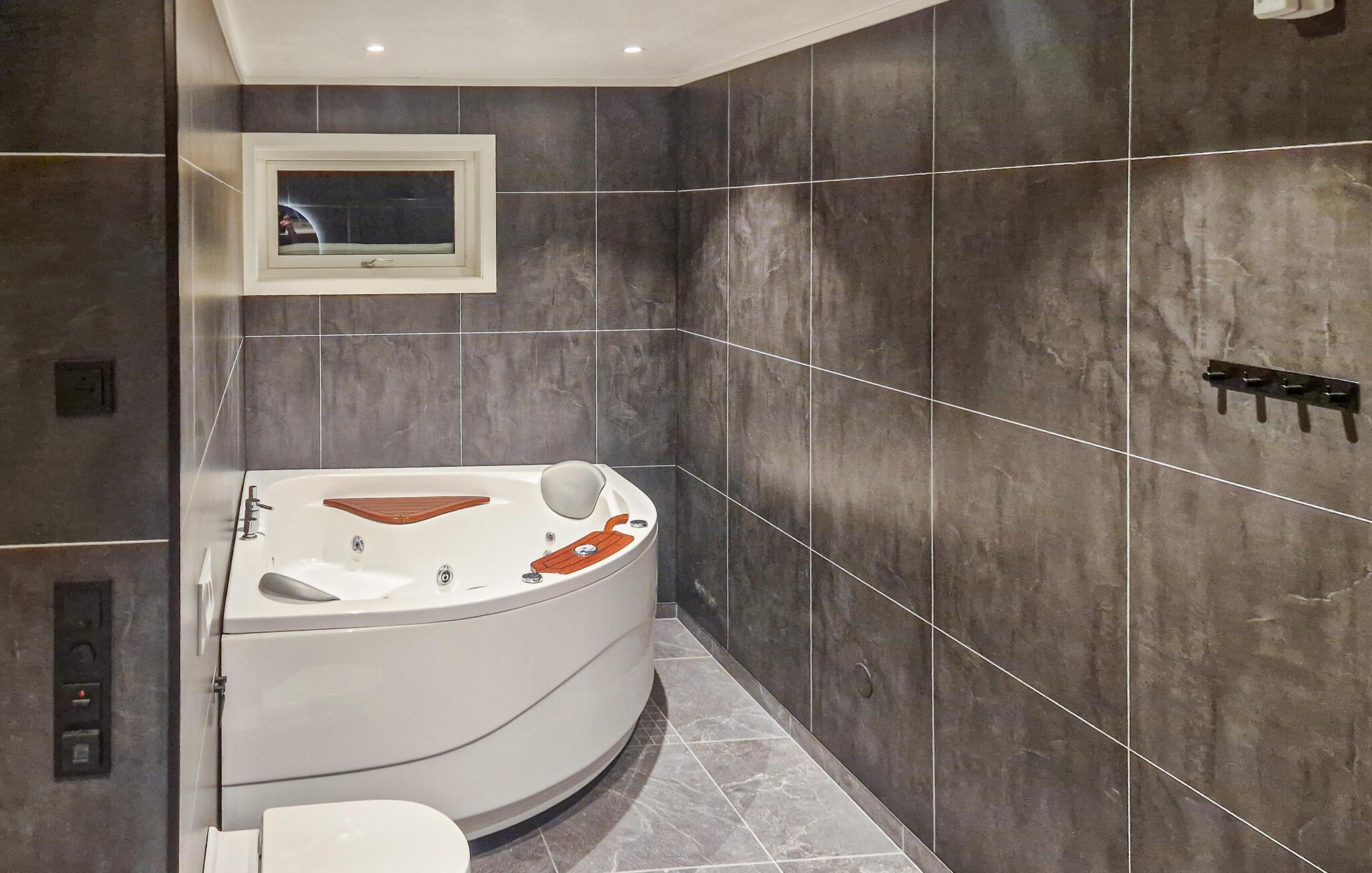 Slap af i den store stue på den rummelige sofa eller i de komfortable lænestole, og tilbring aftenerne sammen med at se fjernsyn. Tilbered jeres måltider i det åbne, elegante køkken udstyret med moderne installationer. Samles omkring det lange spisebord og nyd hinandens selskab i en behagelig atmosfære. Træk jer af og til tilbage til stuen ovenpå for at læse eller se fjernsyn. Forkæl jer selv med afslapning i det stilfulde badeværelse med spabad og lad dagen slutte fredeligt.