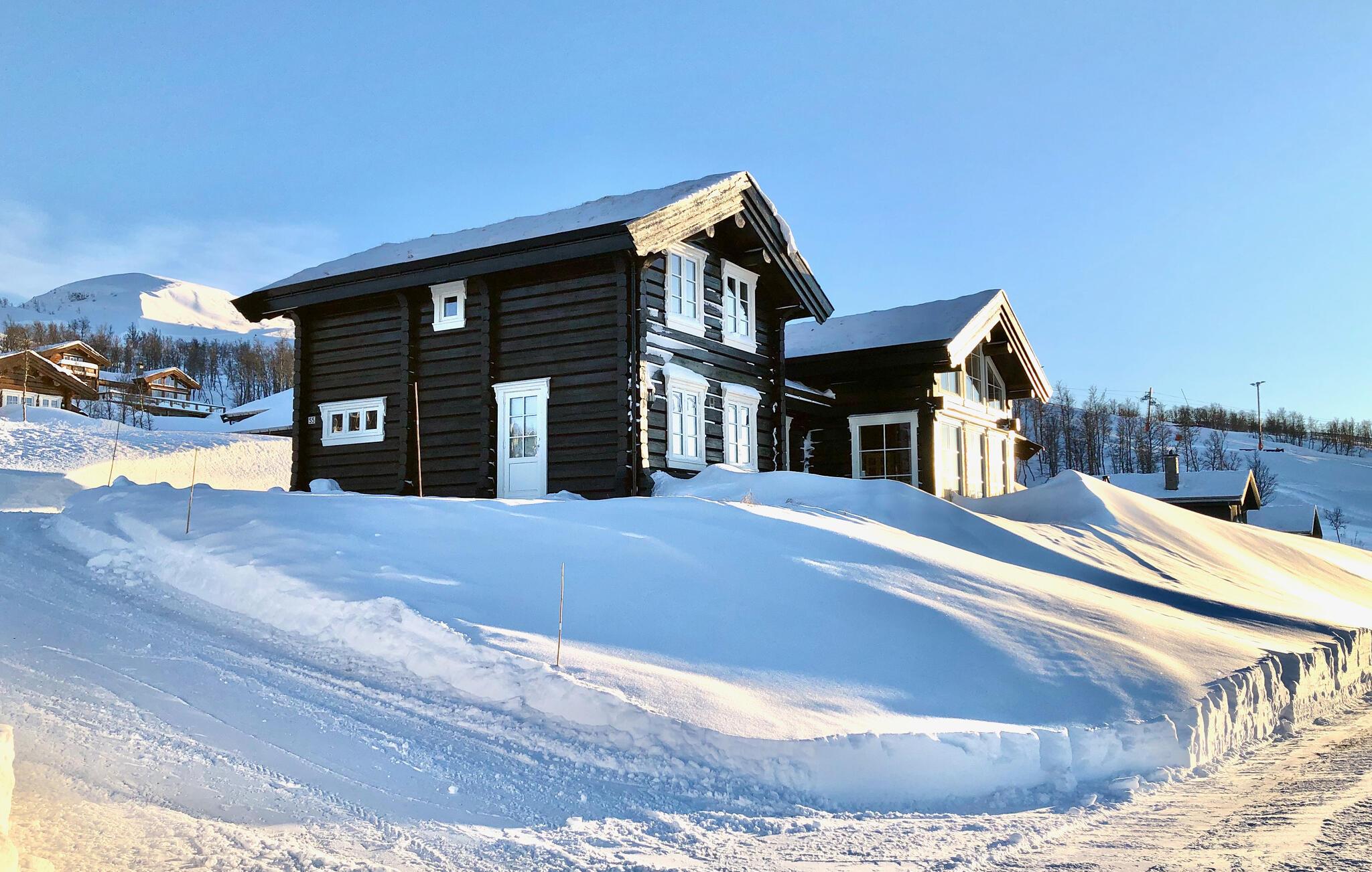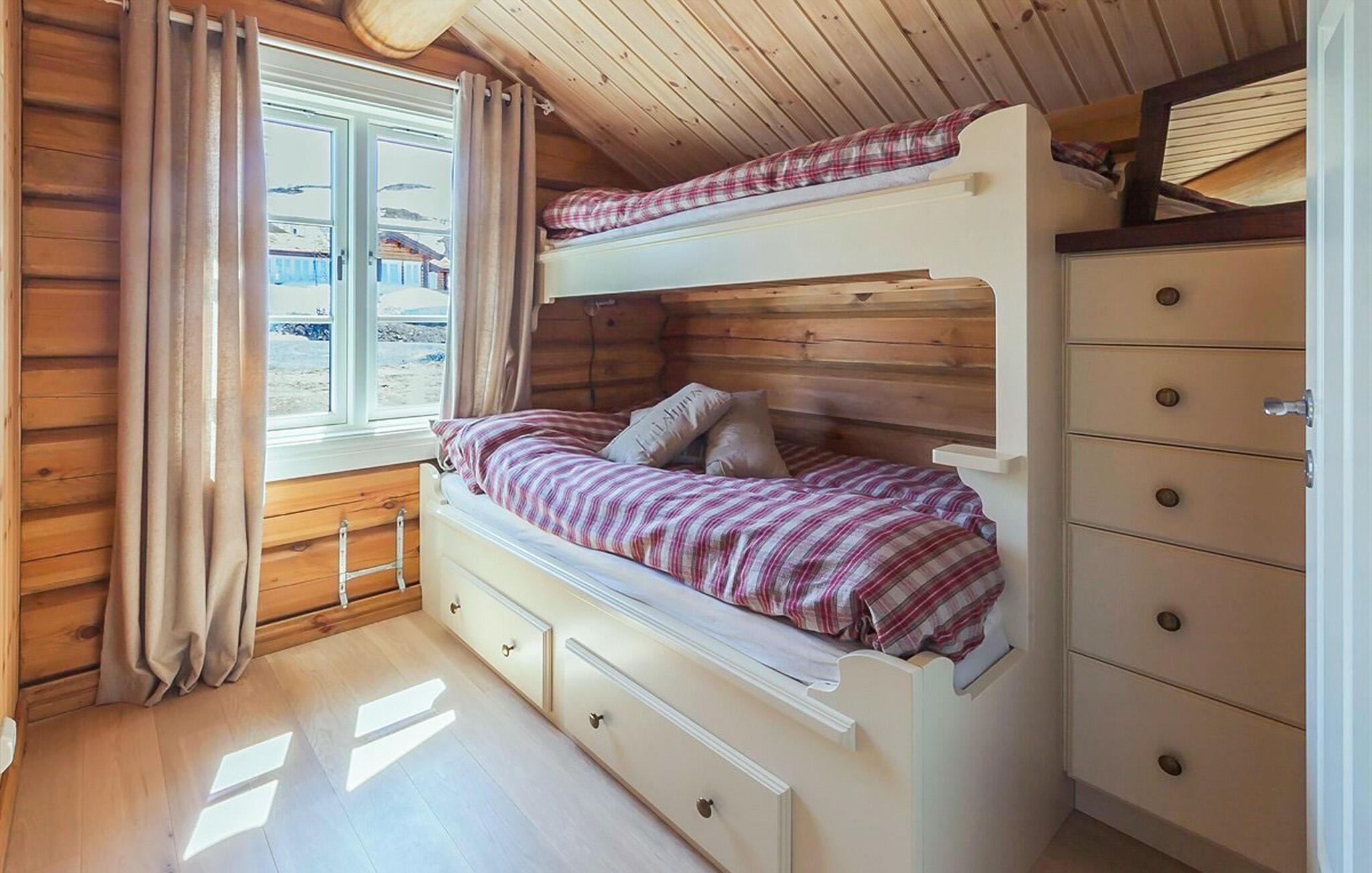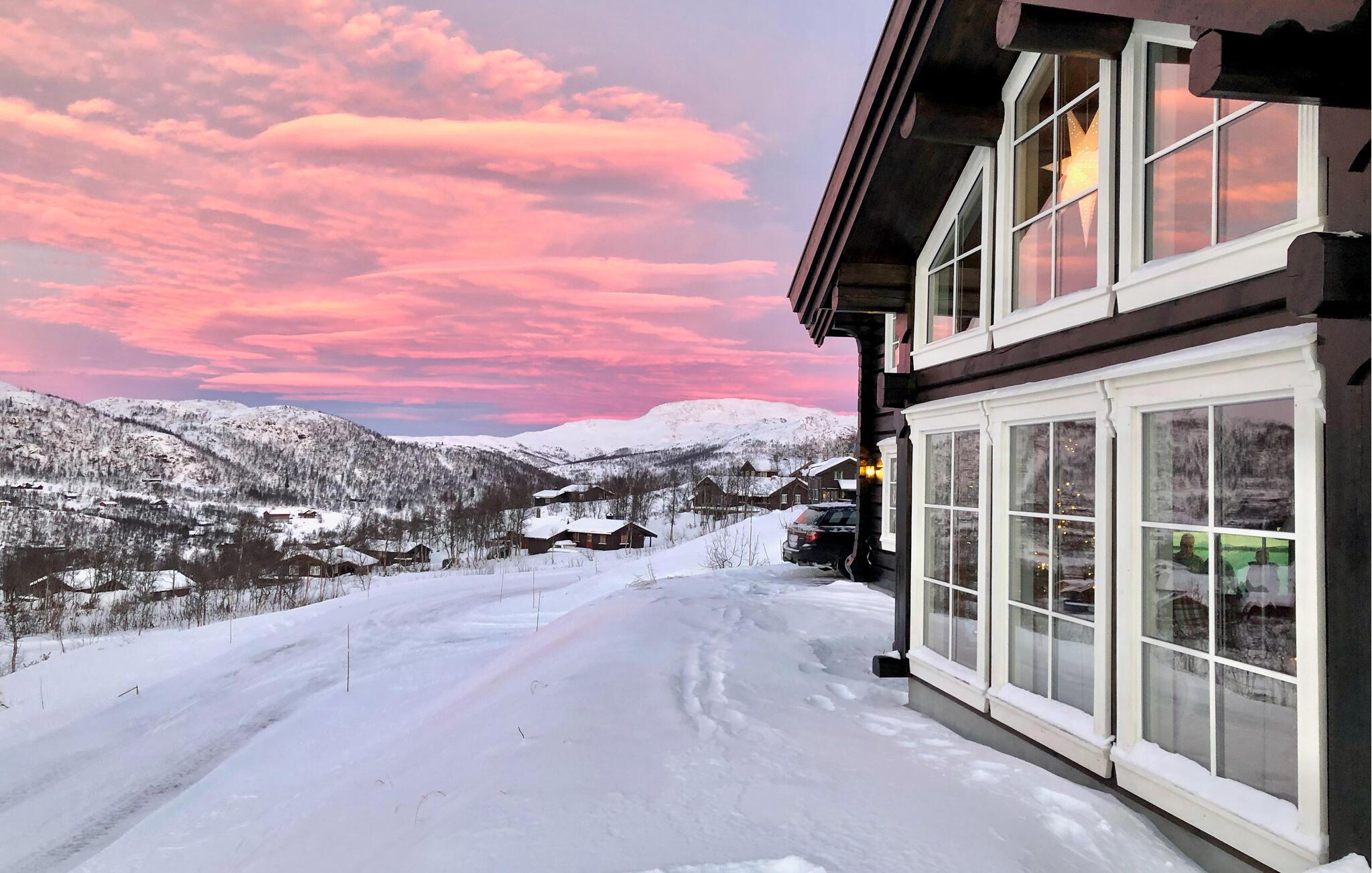 Dette indbydende feriehus ligger 1.000 meter over havets overflade og byder på en fantastisk udsigt over Raulandsfjell og Hardangervidda. Den hyggelige og smagfulde indretning og den varme atmosfære skaber det ideelle sted for en afslappende ferie. Sammen med jeres store familie kan I nyde jeres feriehverdag fuldt ud her, lave mad, spise eller lege sammen. Tilbring afslappende aftener i stuen, slap af foran pejsen eller nyd bjergluften på terrassen. Nærheden til alpine pister og langrendsløjper gør dette hjem perfekt til vinteraktiviteter.