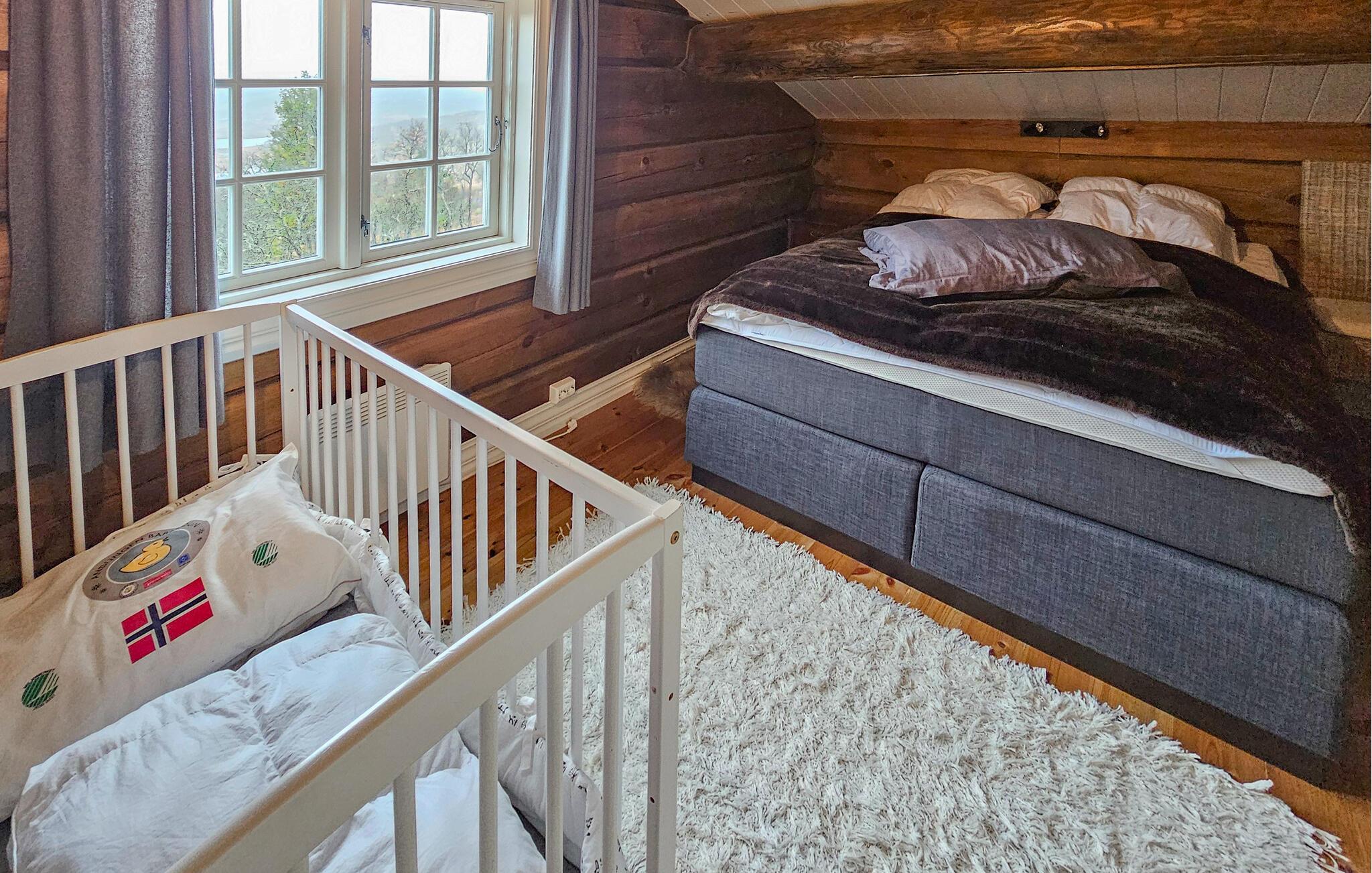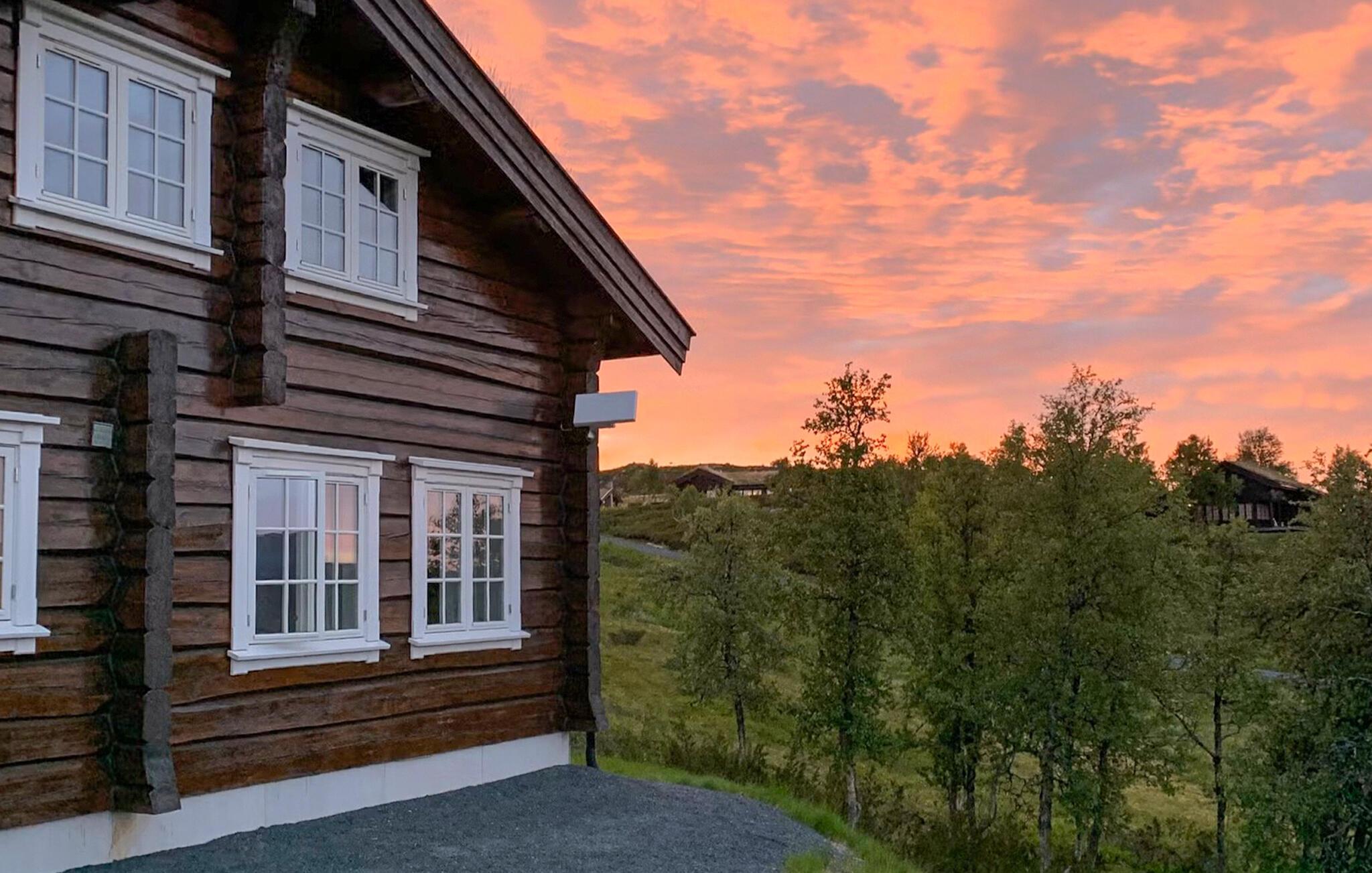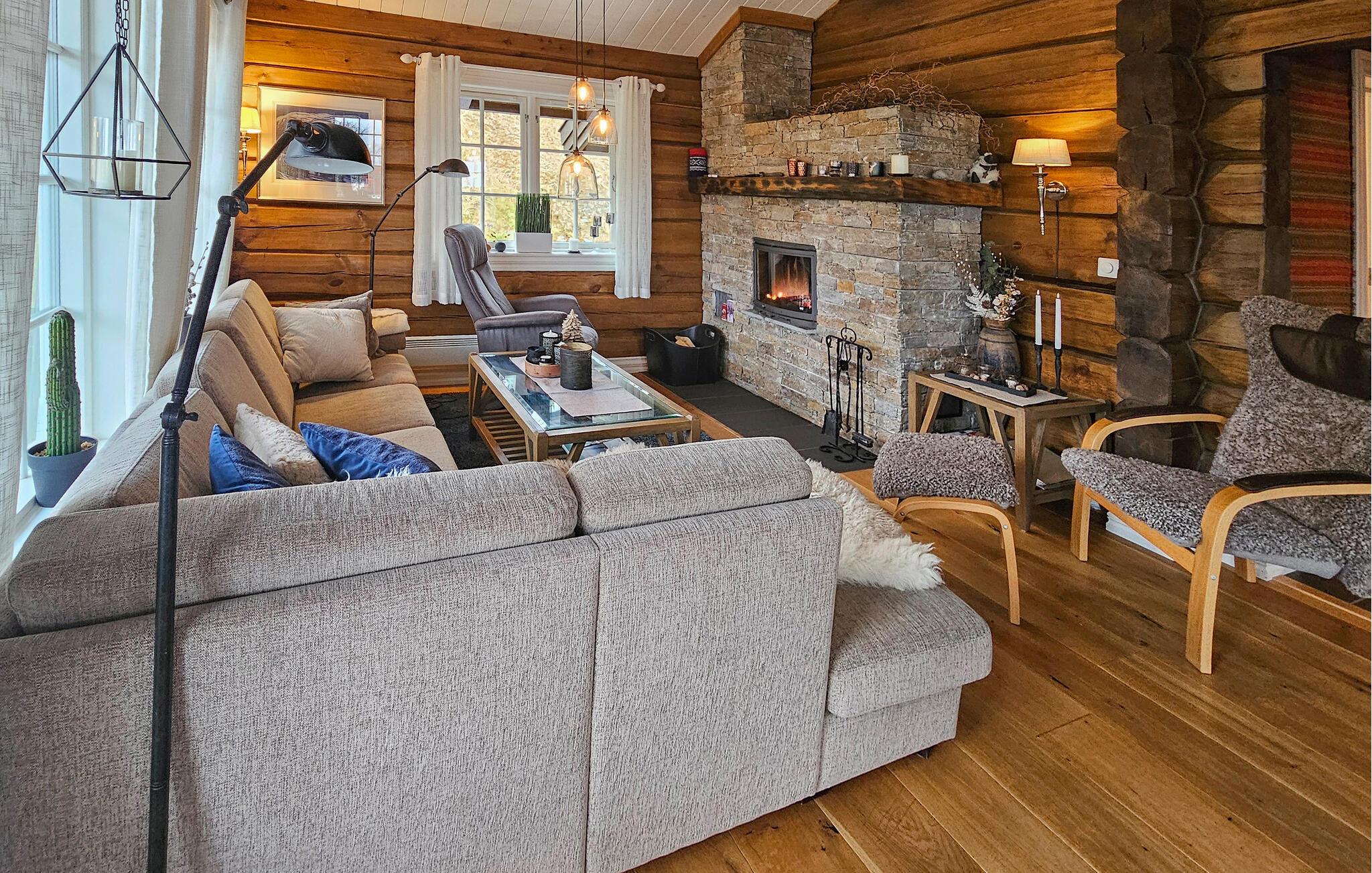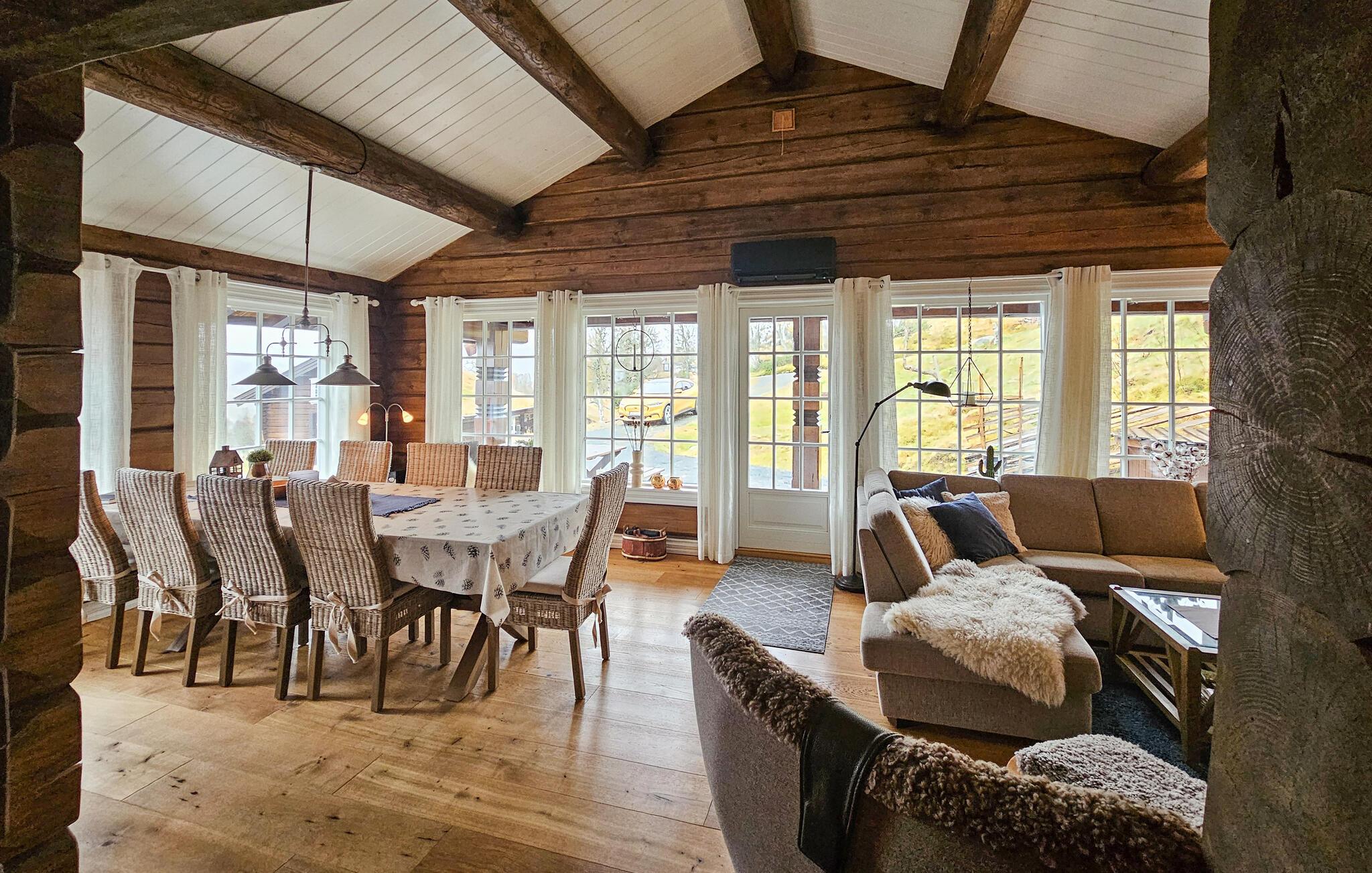 Denne naturskønne bjælkehytte er perfekt til en pause fra hverdagen. Stuen med trævægge, hyggelig pejs og bløde pelse lægger op til at slappe af i timevis efter en dag udendørs. Nyd måltider sammen ved det store spisebord med udsigt over landskabet, mens det hyggelige siddeområde ovenpå lægger op til at læse eller snakke.