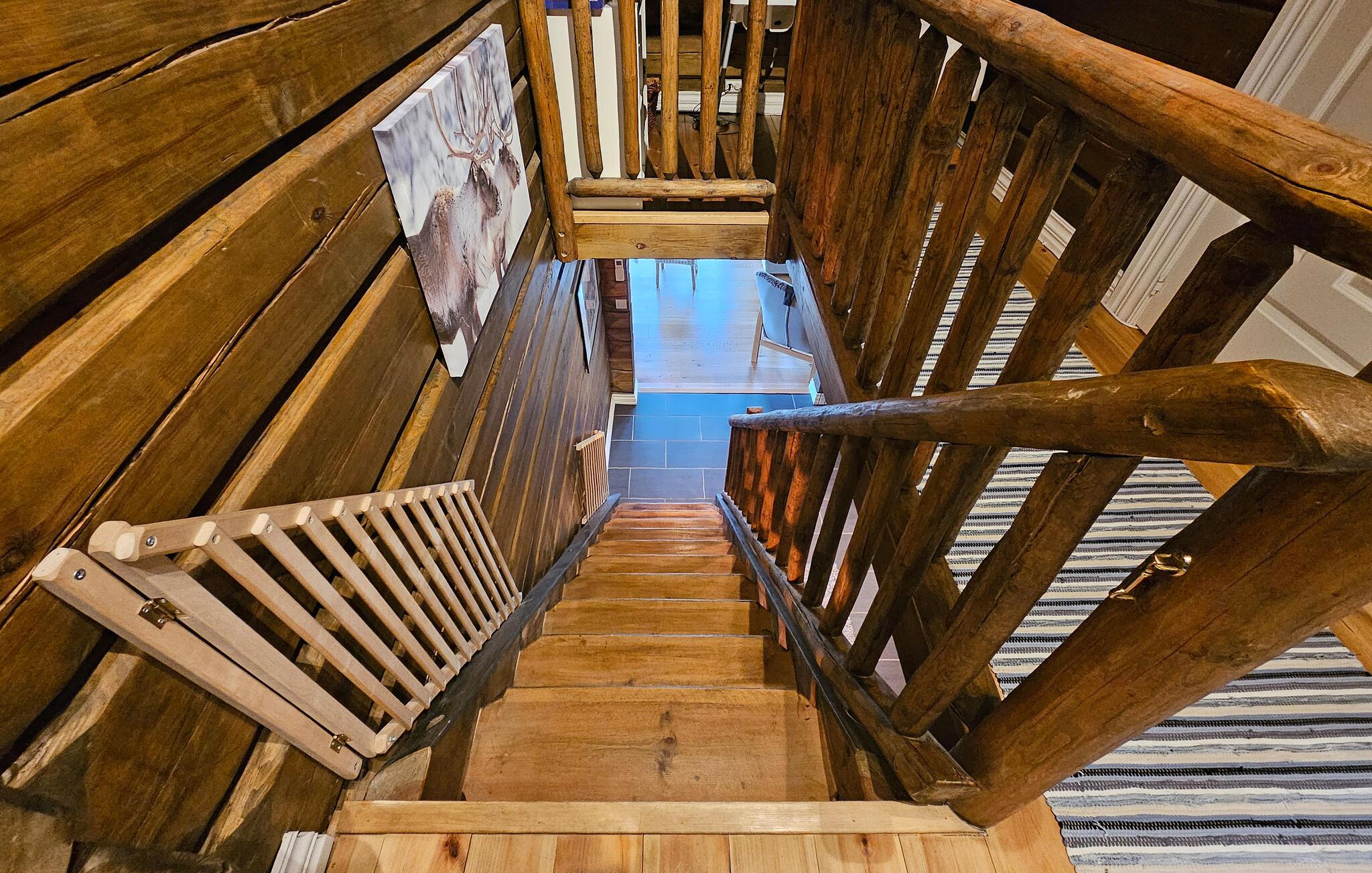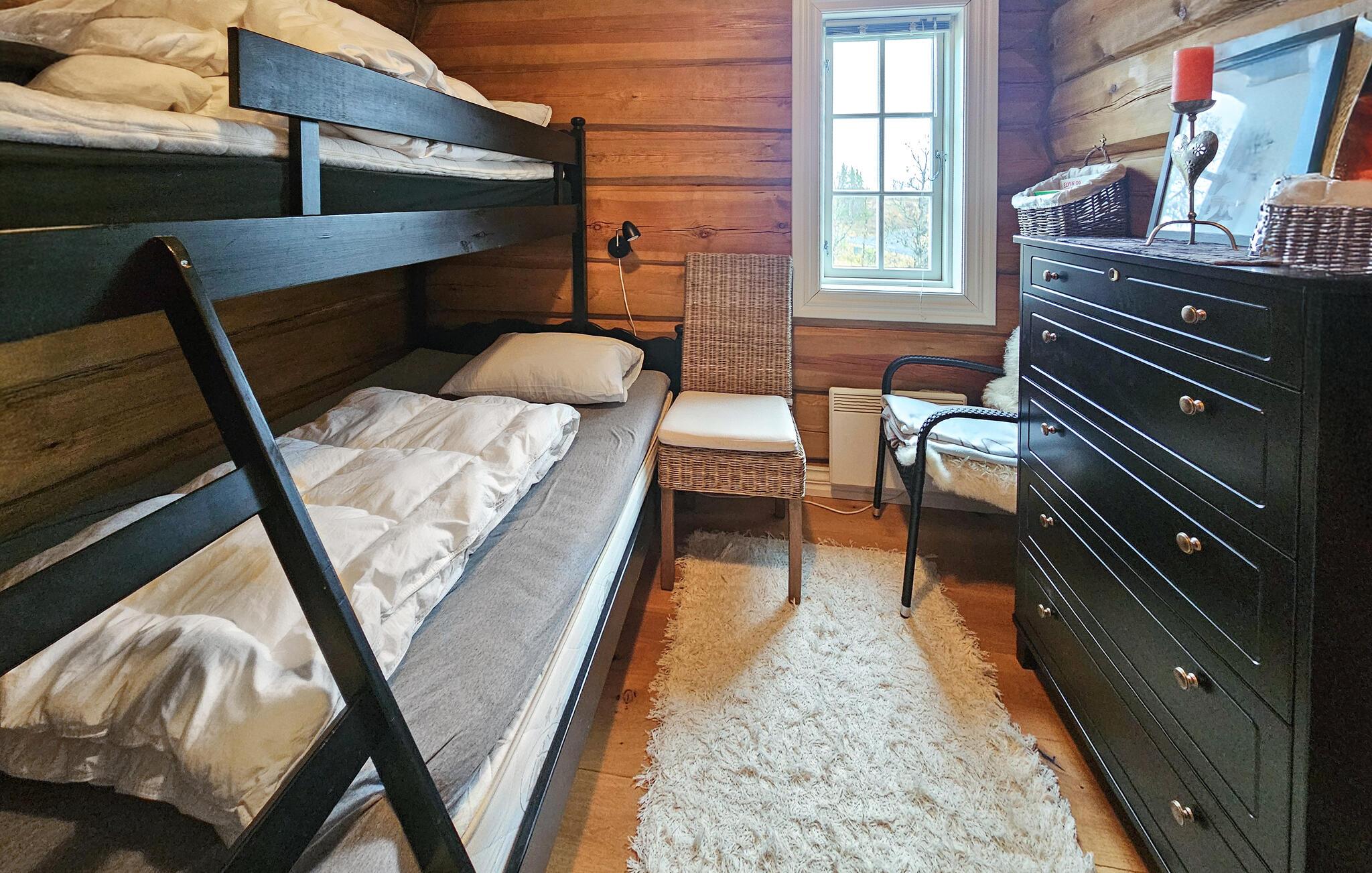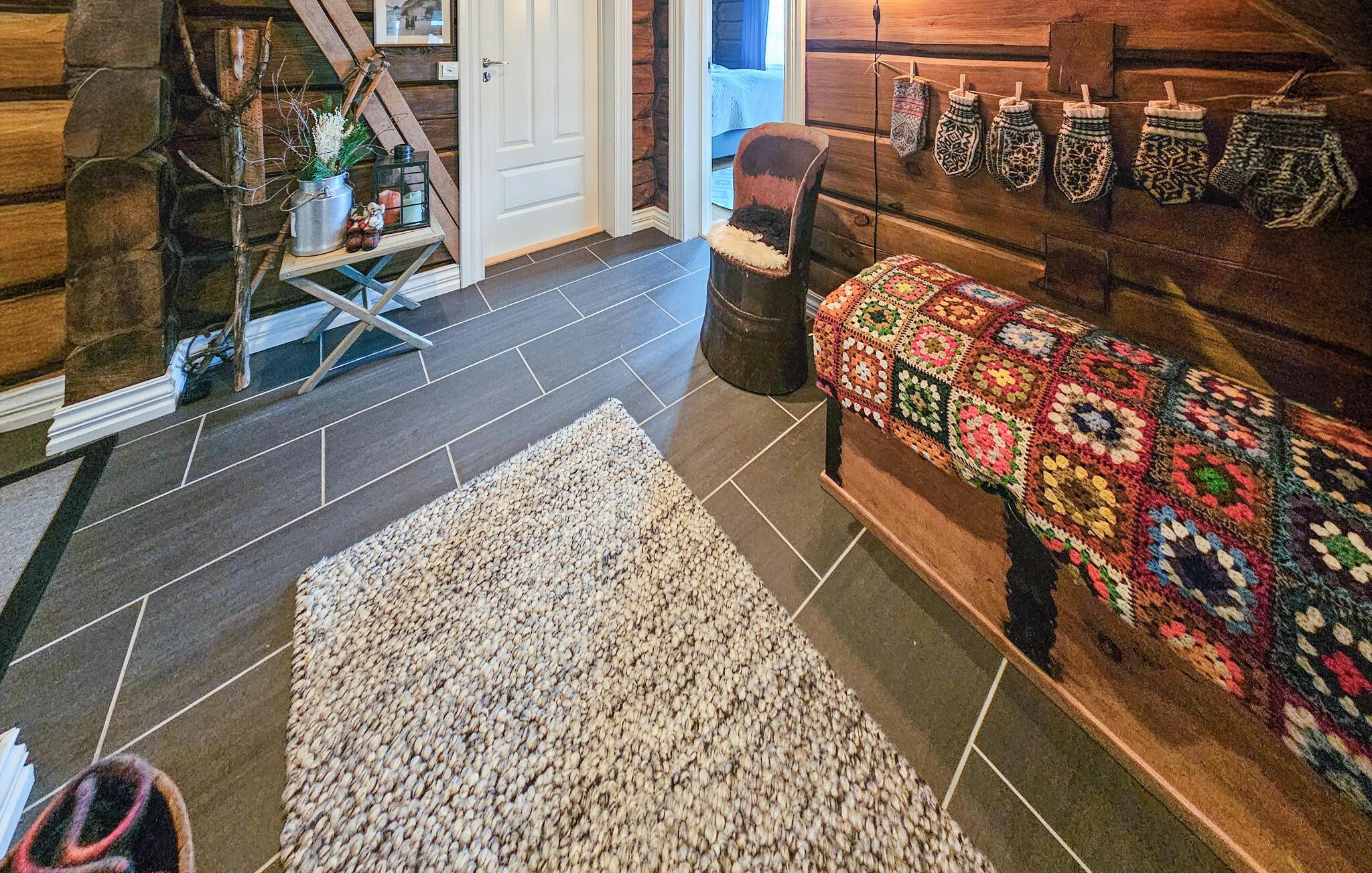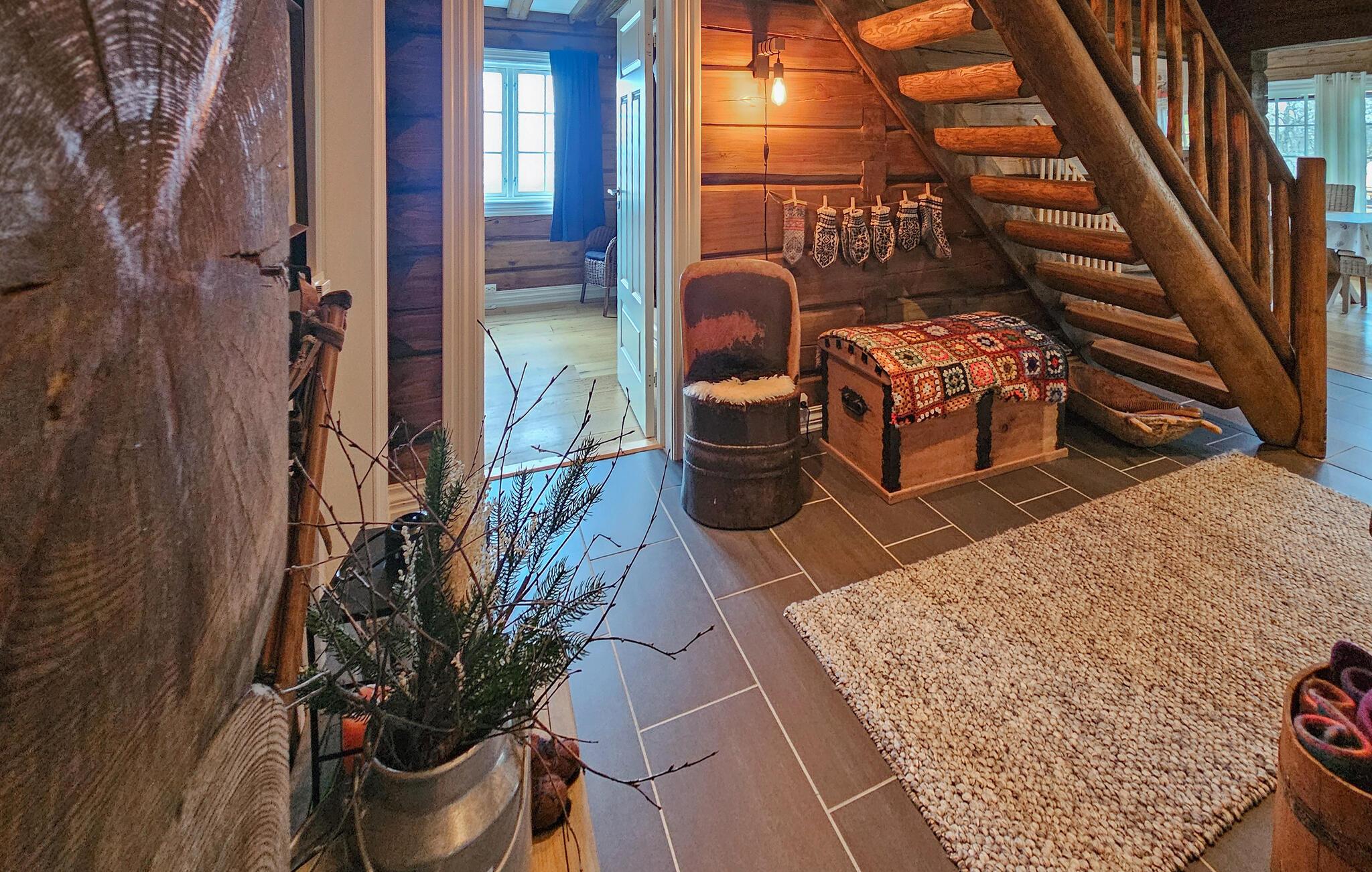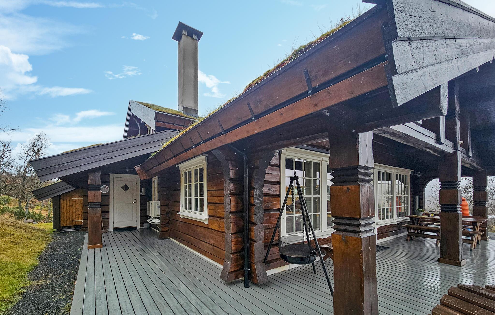 Denne naturskønne bjælkehytte er perfekt til en pause fra hverdagen. Stuen med trævægge, hyggelig pejs og bløde pelse lægger op til at slappe af i timevis efter en dag udendørs. Nyd måltider sammen ved det store spisebord med udsigt over landskabet, mens det hyggelige siddeområde ovenpå lægger op til at læse eller snakke.