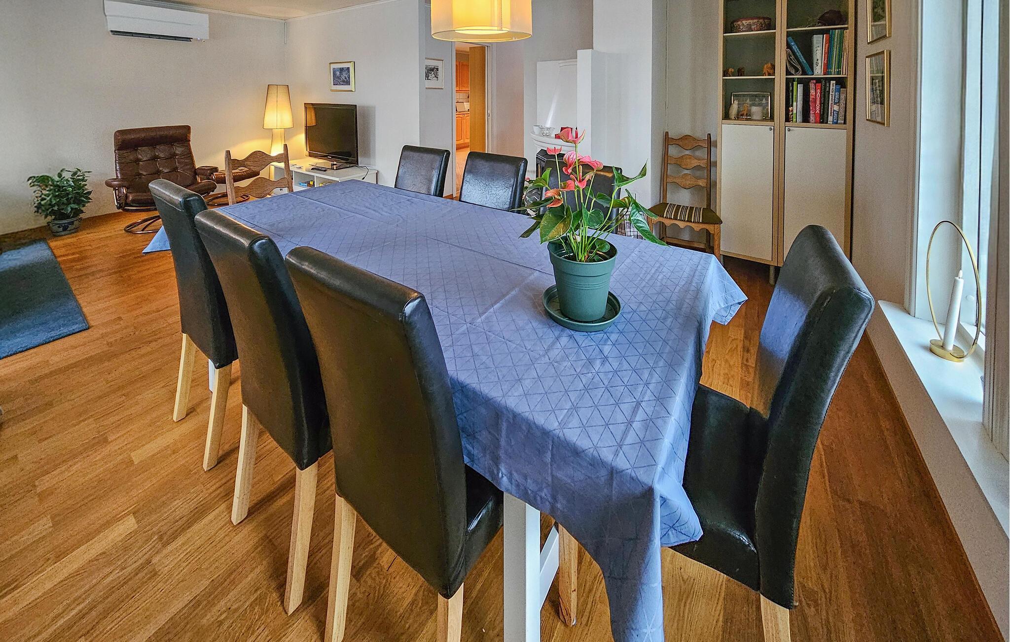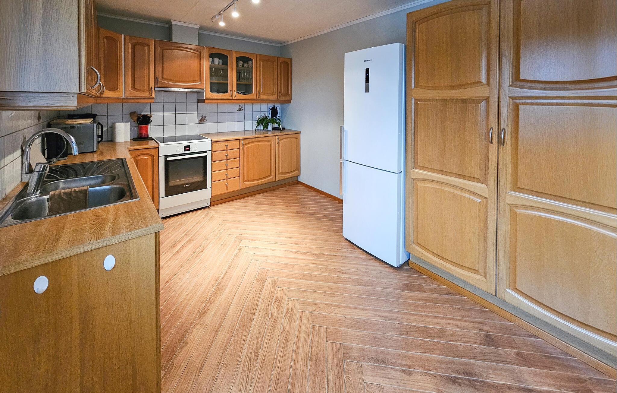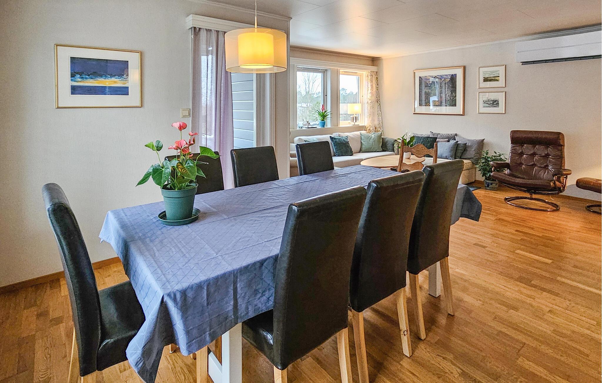 Dette charmerende feriehus, lige syd for Sandefjord, tilbyder jer en ideel blanding af komfort, natur og afslapning. Uanset om I planlægger en badeferie, udforsker kystlandskabet eller bare vil slappe af, er I kommet til det rette sted. Husets indretning er hyggeligt og stilfuldt indrettet. Den lyse opholdsstue lægger op til gode hyggestunder med komfortable sofaer, et stort fjernsyn og kærlige detaljer. Nyd den varme atmosfære ved brændeovnen i spisepladsen, og tilbring hyggelige aftener sammen med familien eller venner. Det veludstyrede køkken med en generøs arbejdsflade byder på alt, hvad I behøver for at tilberede lækre måltider. I den rummelige spisestue er der plads til fælles måltider.