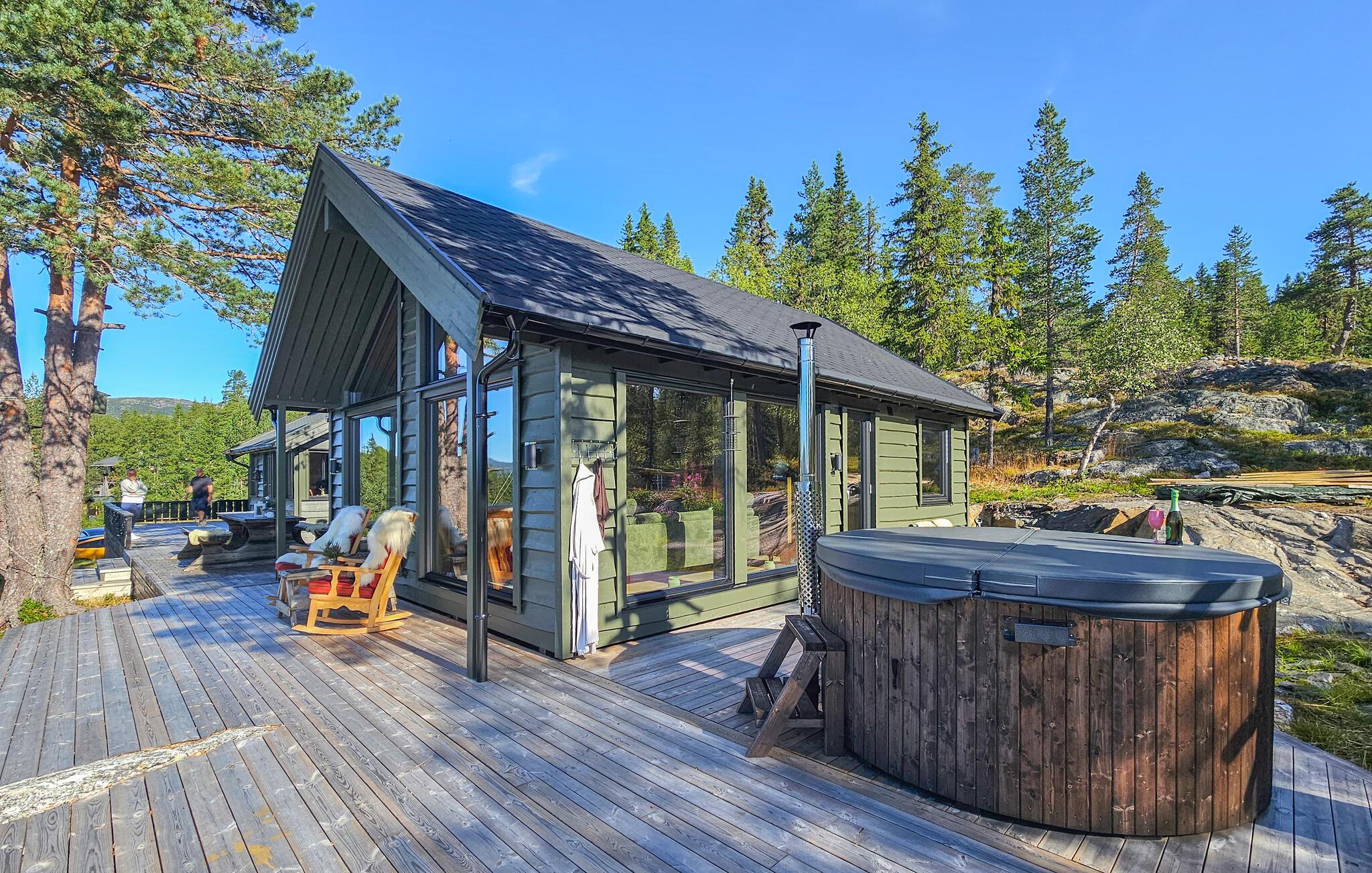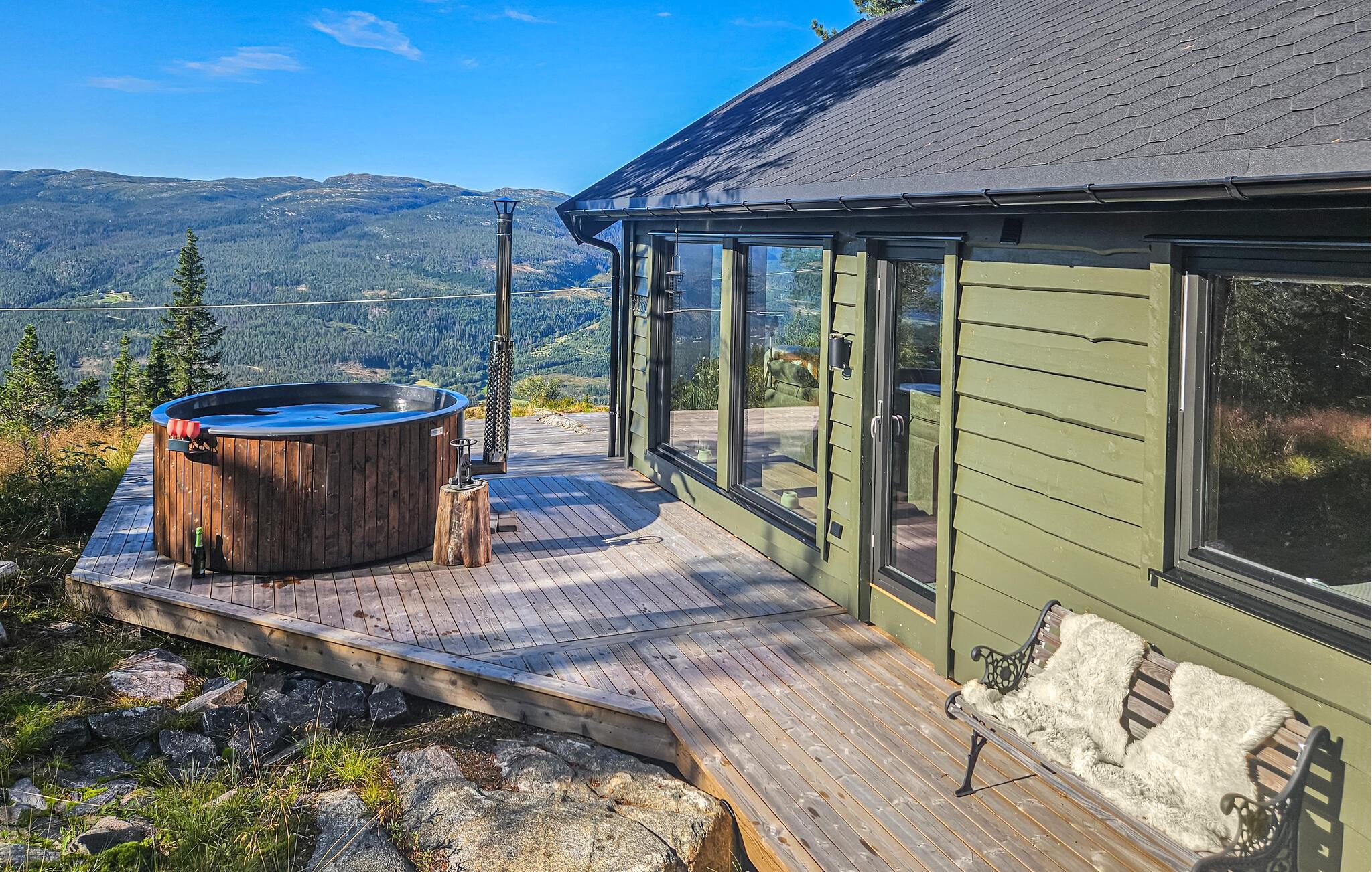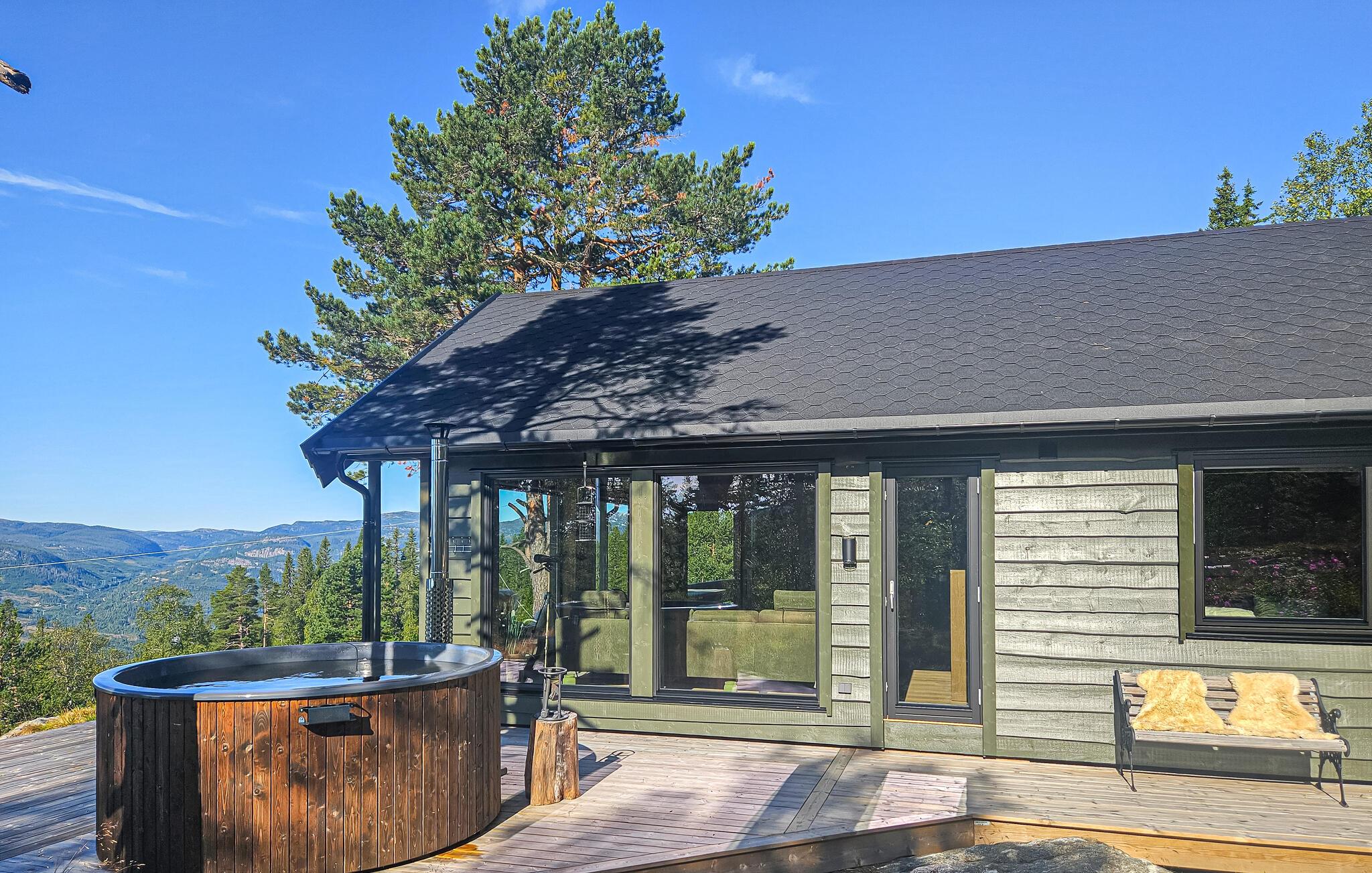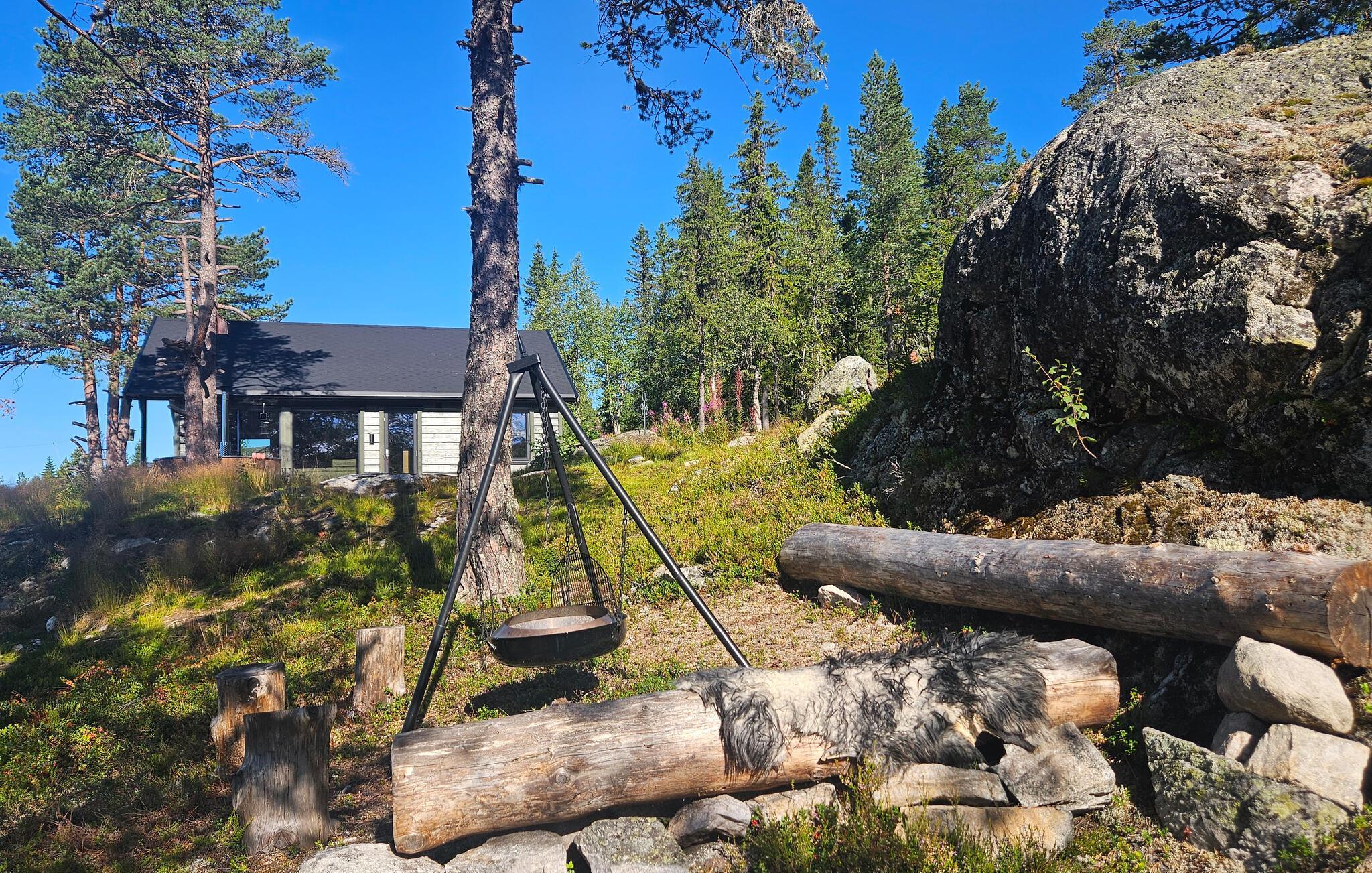 Udenfor kan I nyde den vidtrækkende udsigt over naturen. Også i vildmarksbadet kan I lade blikket glide over bjergene.