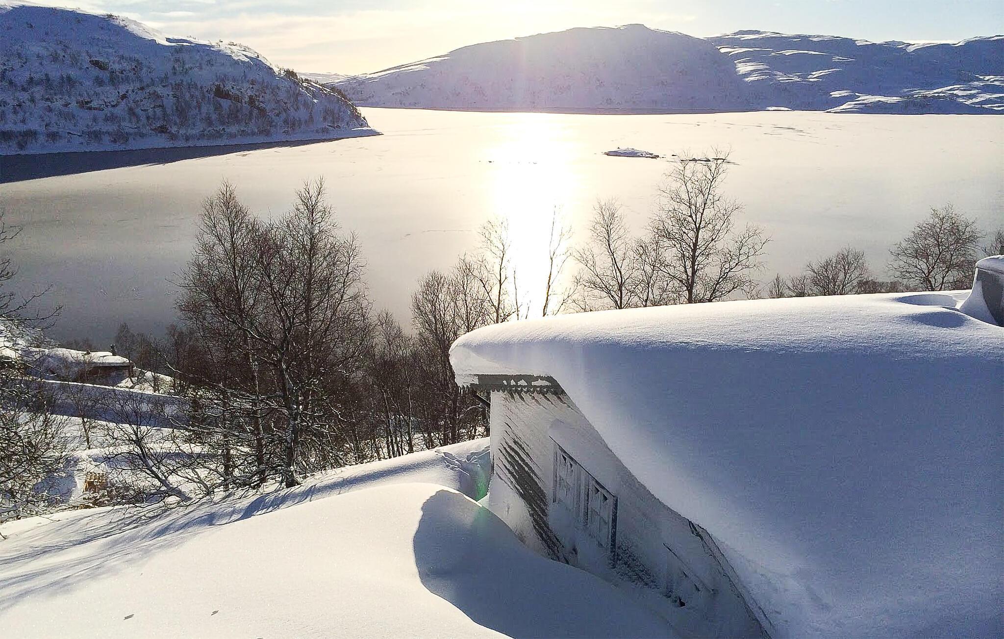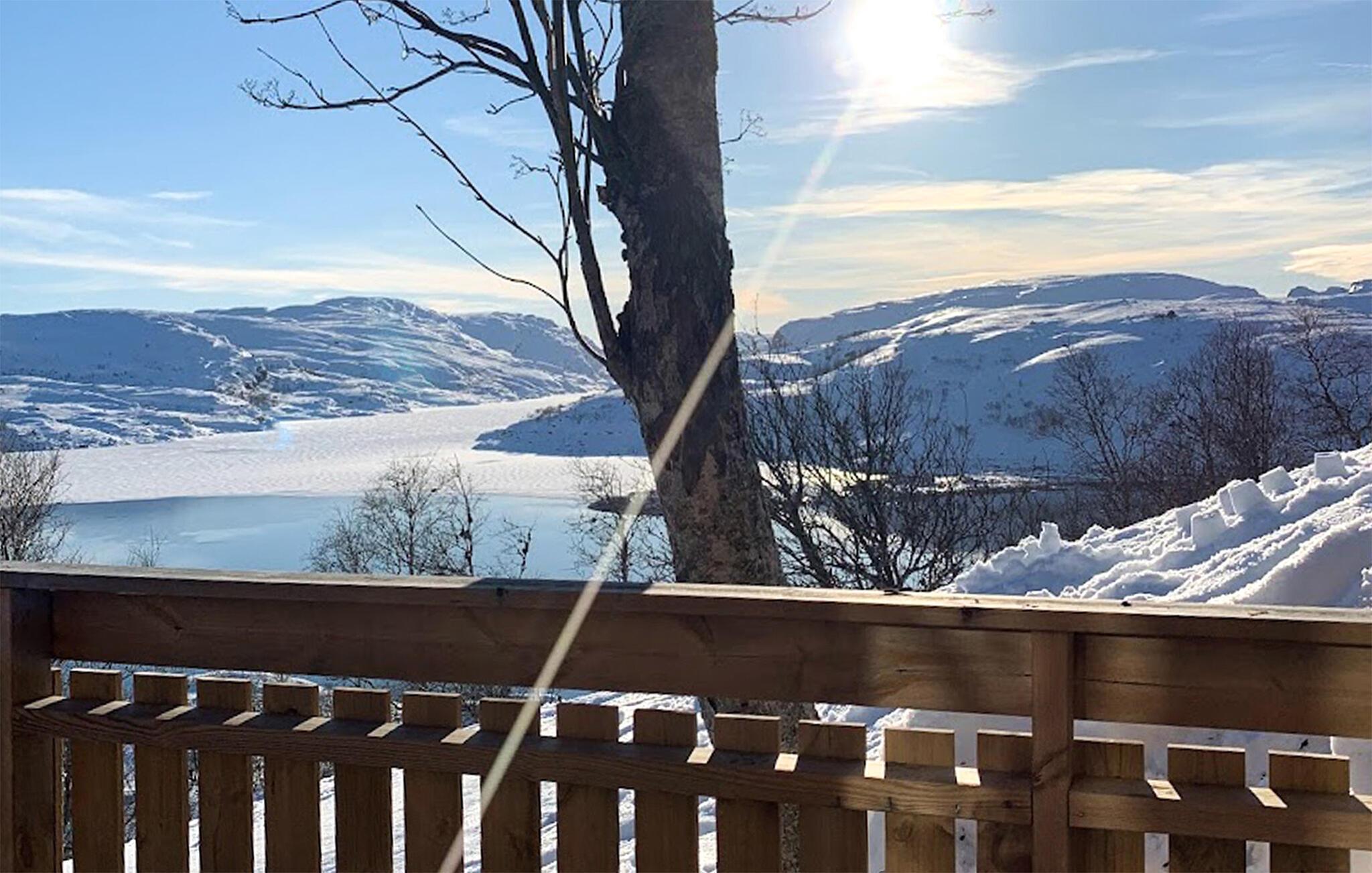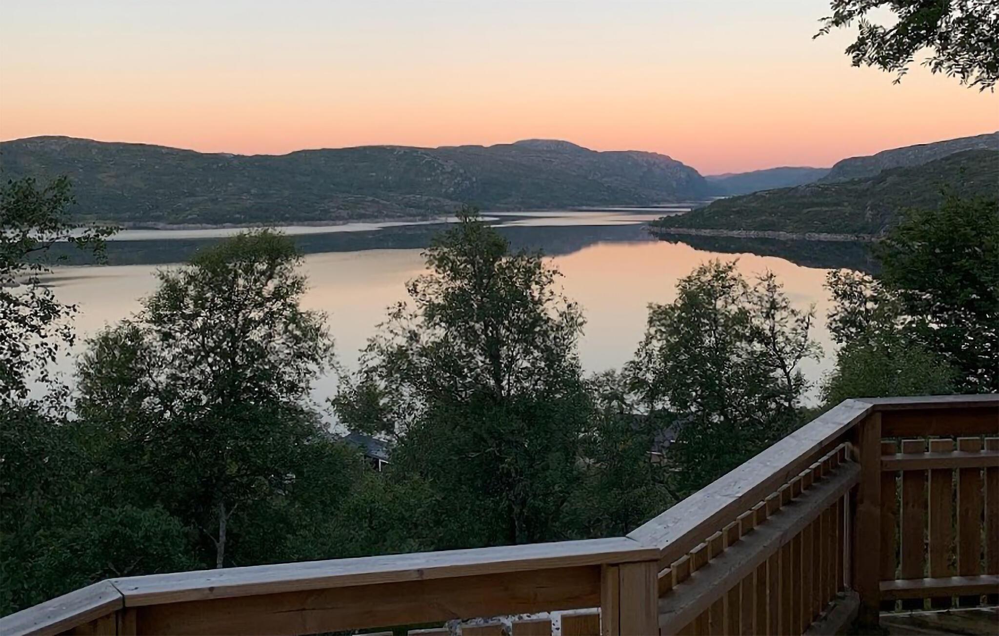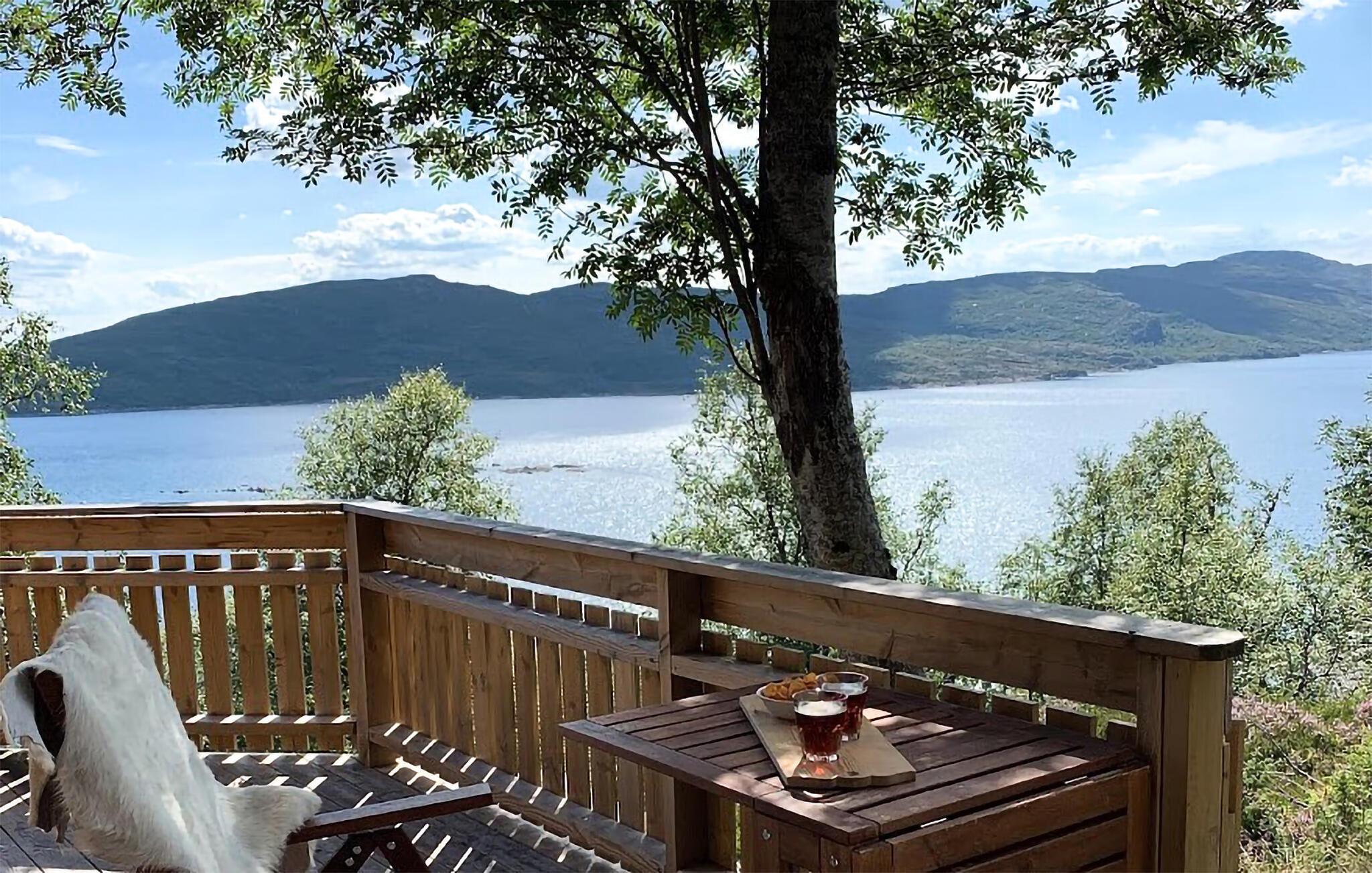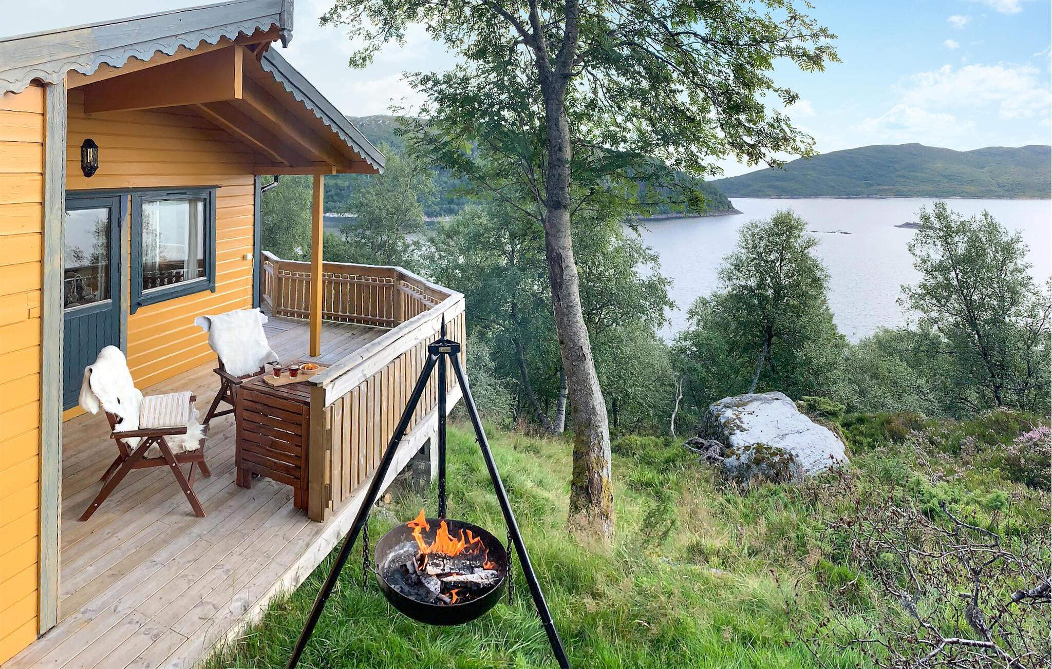 Den rummelige terrasse byder på en betagende udsigt over fjorden og de omkringliggende bjerge. Nyd jeres morgenkaffe i den friske luft, slap af i en liggestol, eller grill over åben ild. Gå direkte fra hytten ud på eventyrlige vandreture i den imponerende natur.