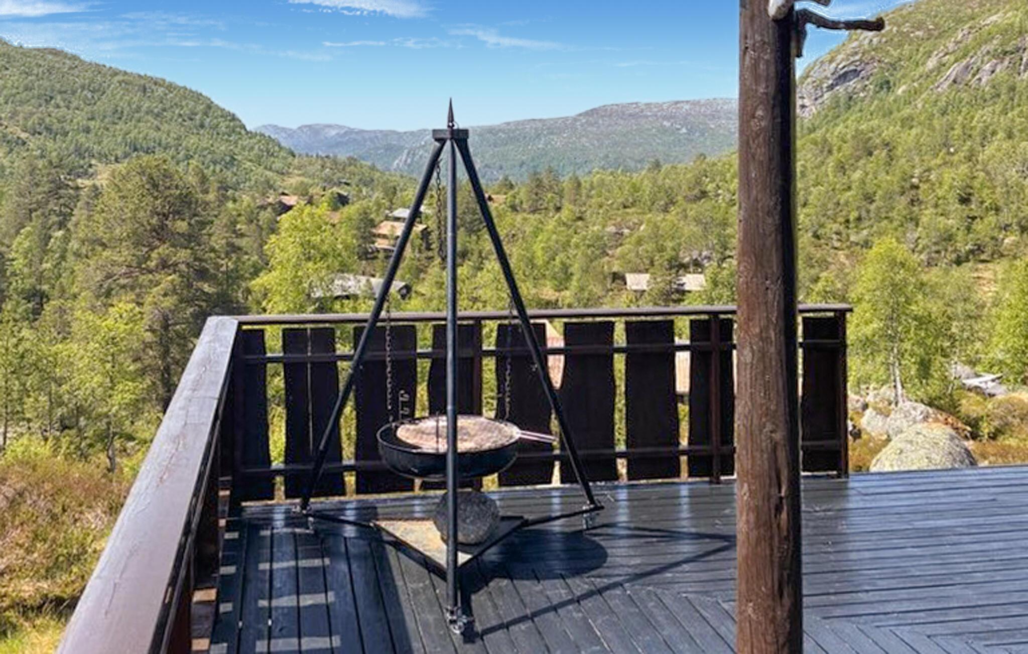 Træd ud på den store terrasse om morgenen og se den fantastiske udsigt over det skovklædte landskab. Find et solrigt sted og nyd en solid morgenmad. Om aftenen kan I samles med familie eller venner til en grillmiddag eller varme jer ved bålstedet, når solen går ned.