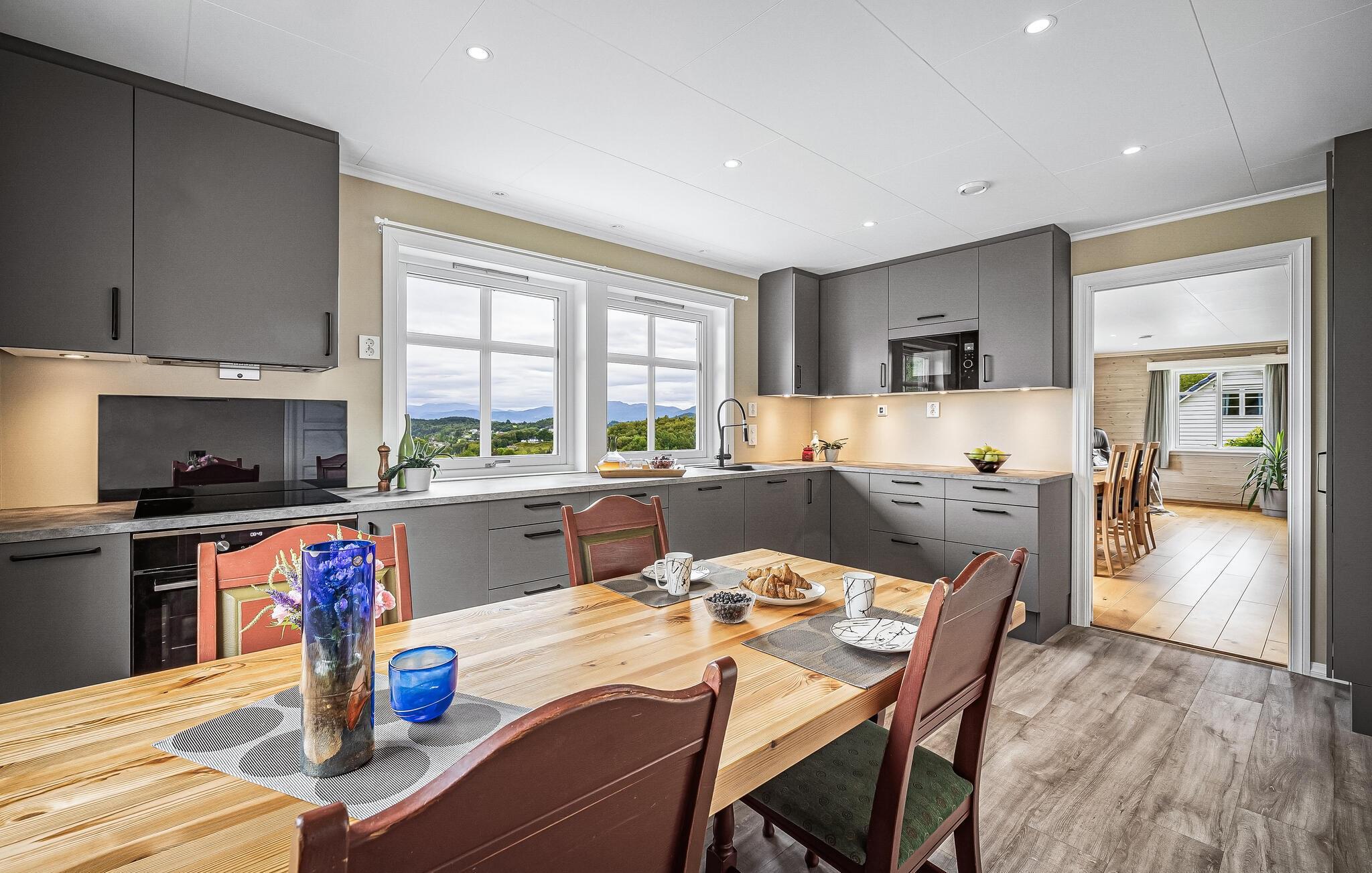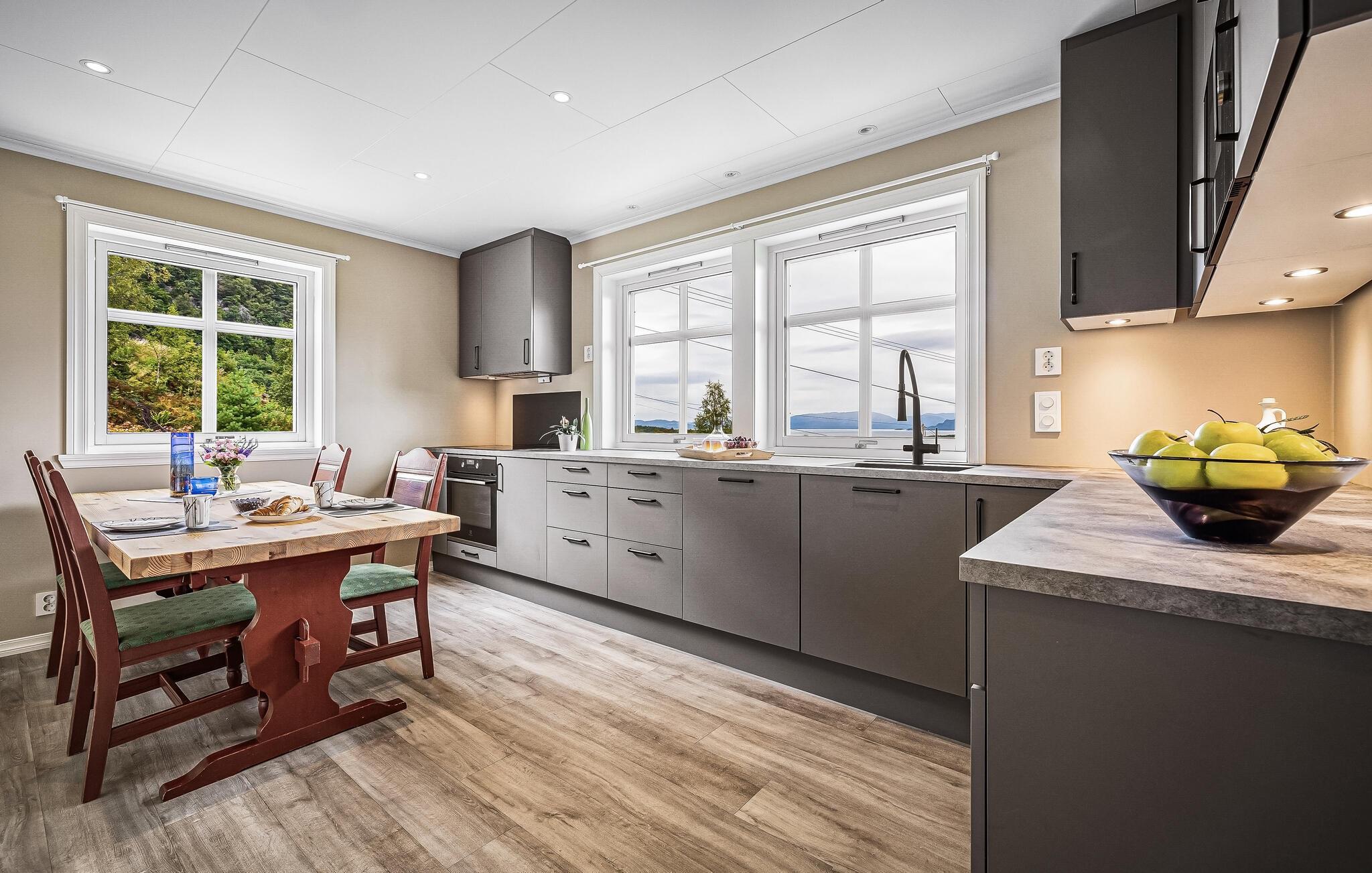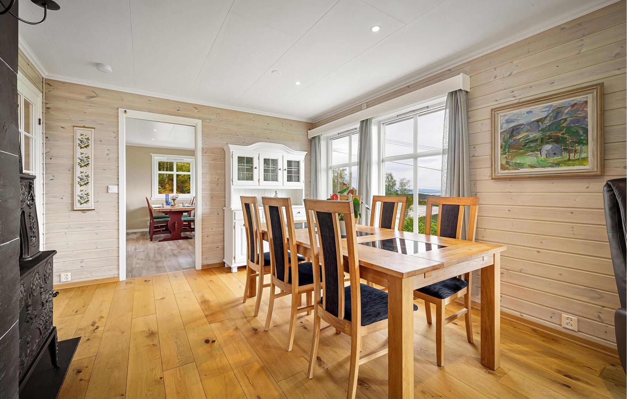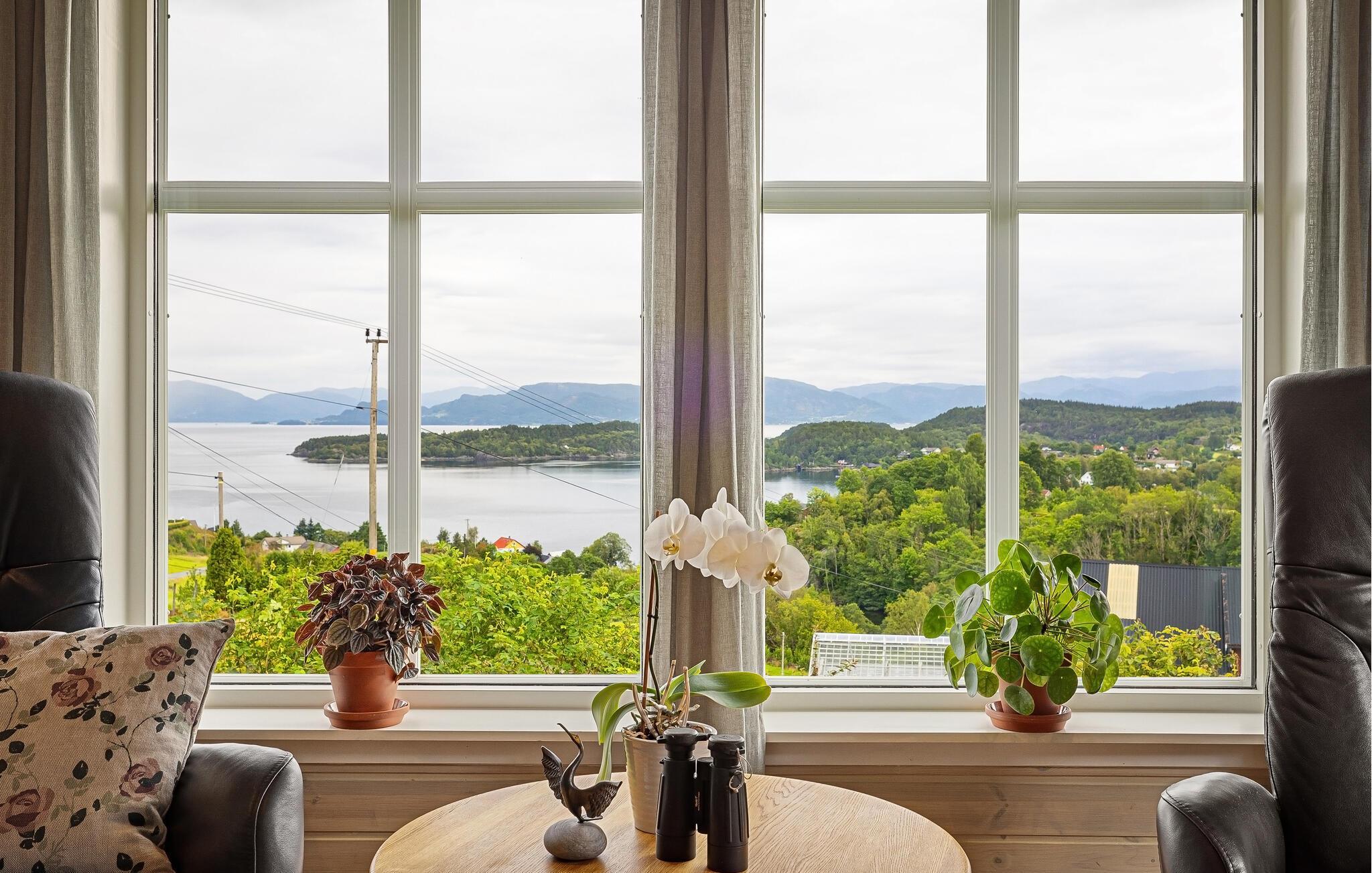 Nyd afslappende dage i rolige omgivelser, langt væk fra hverdagens travlhed. Dette stilfulde feriehus giver jer den ideelle kombination af komfort, natur og panoramaudsigt. Den rummelige opholdsstue byder jer velkommen med lyse trævægge, store vinduer og komfortable siddeområder. Slap af i en behagelig lænestol med udsigt over fjorden, eller tilbring aftenerne med at lave mad sammen i det store køkken med spisebord.