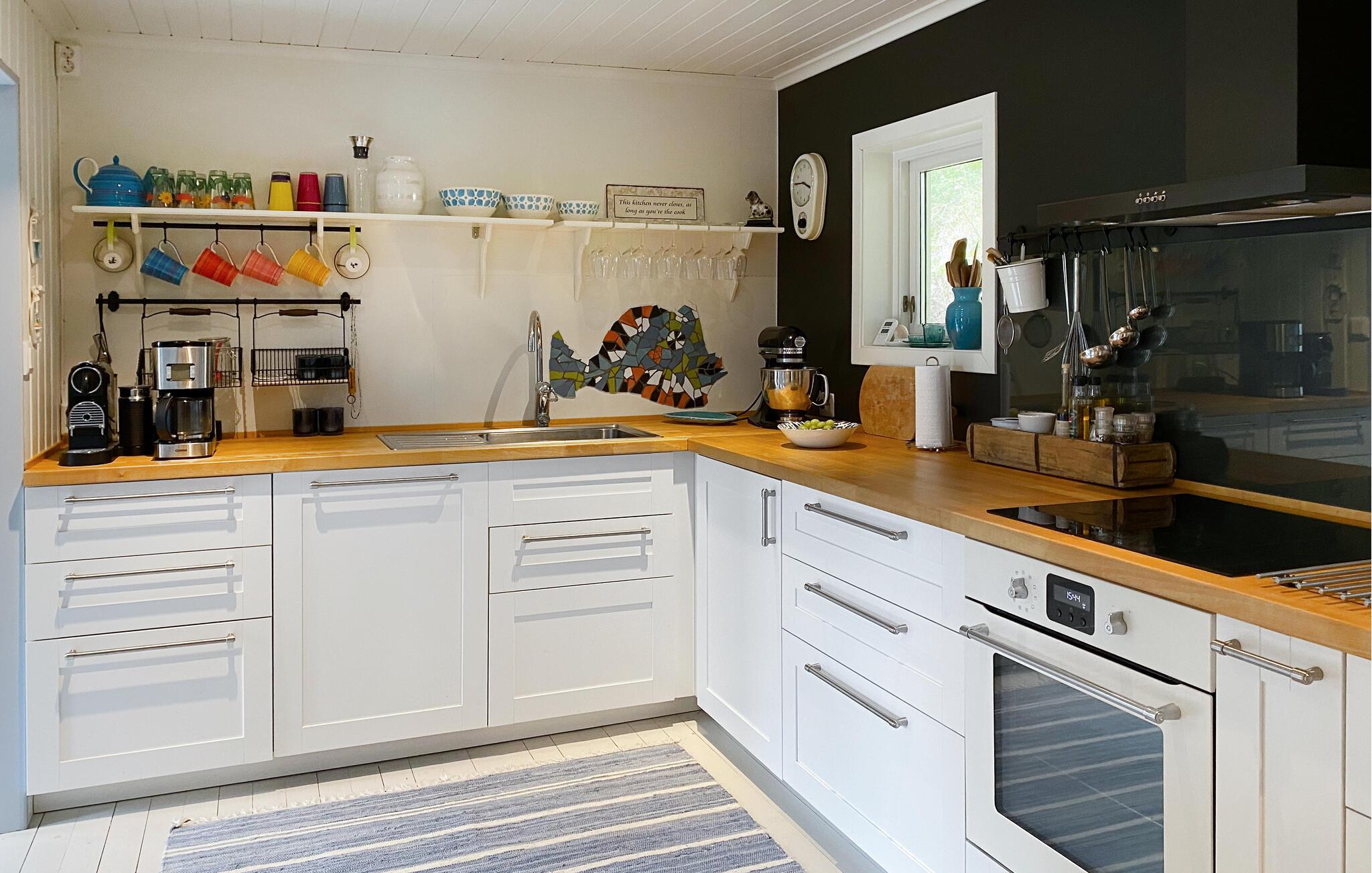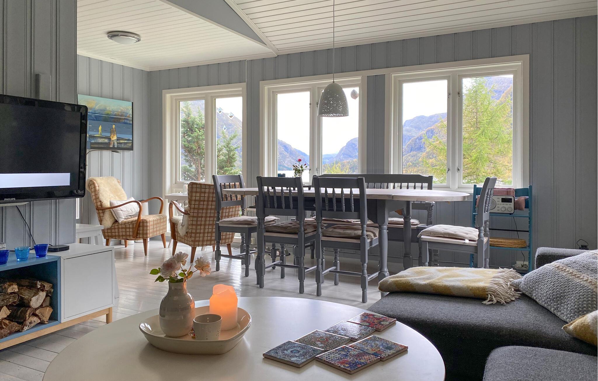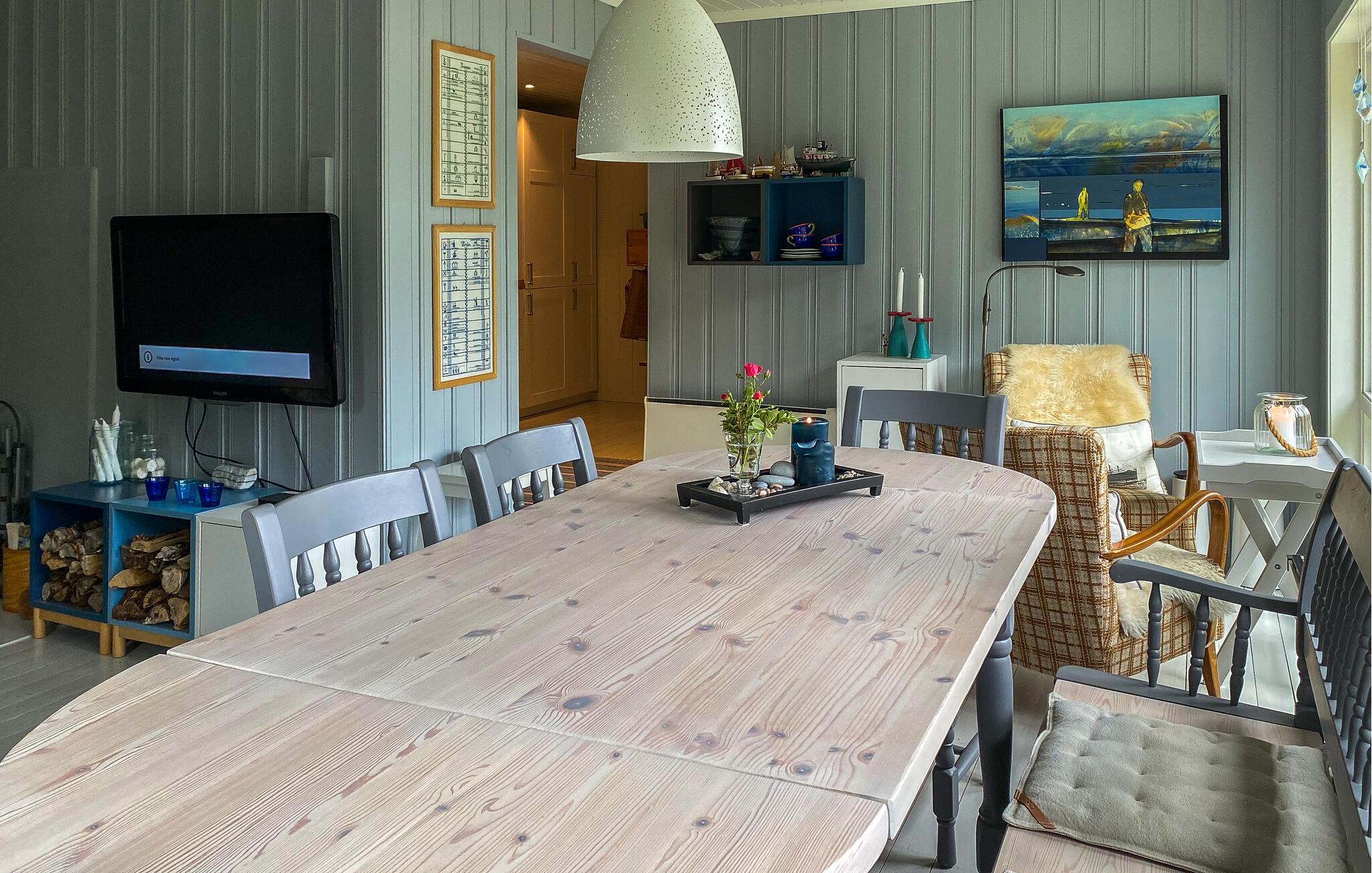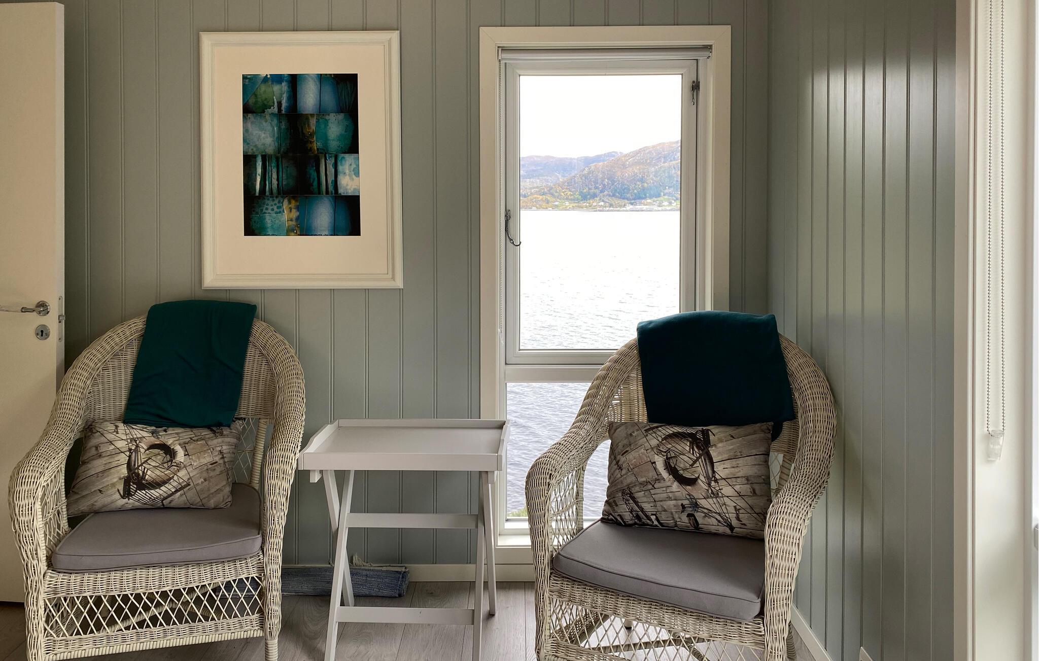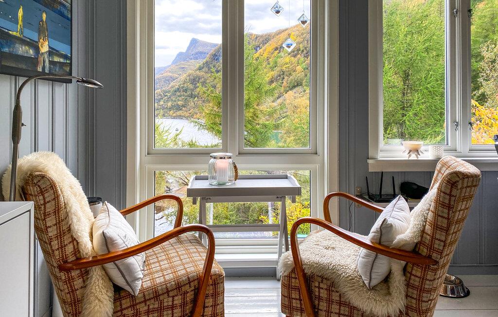 Den indbydende stue tilbyder et hyggeligt tilflugtssted med en rummelig sofagruppe og charmerende lænestole, der er perfekte til at læse en bog eller nyde udsigten. De store vinduer lader den omkringliggende natur strømme ind i rummet. Brug spisepladsen ved vinduet til fælles måltider og hyggelige stunder med familien eller vennerne.