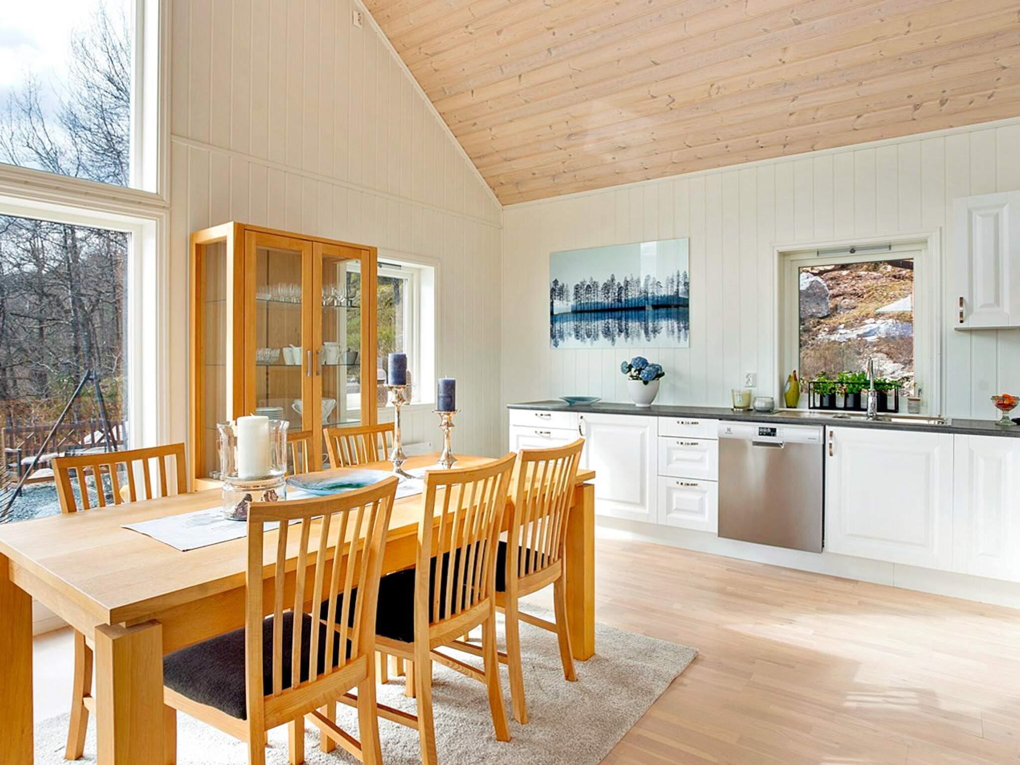 Det er utgang fra stuen til terrassen. Hytten er pent og praktisk innredet med en flott salong i stuen med store vinduer og utsikt over vannet. Rikelig med utstyr på kjøkkenet. Rammemadrasser på alle soverommene hvor noen kan brukes i en kombinasjon av dobbelt eller enkelt senger. Parabolen tar inn en rekke internasjonale kanaler, også tyske. Badet er stort med mye skapplass. Bod med fryseboks og vaskemaskin.