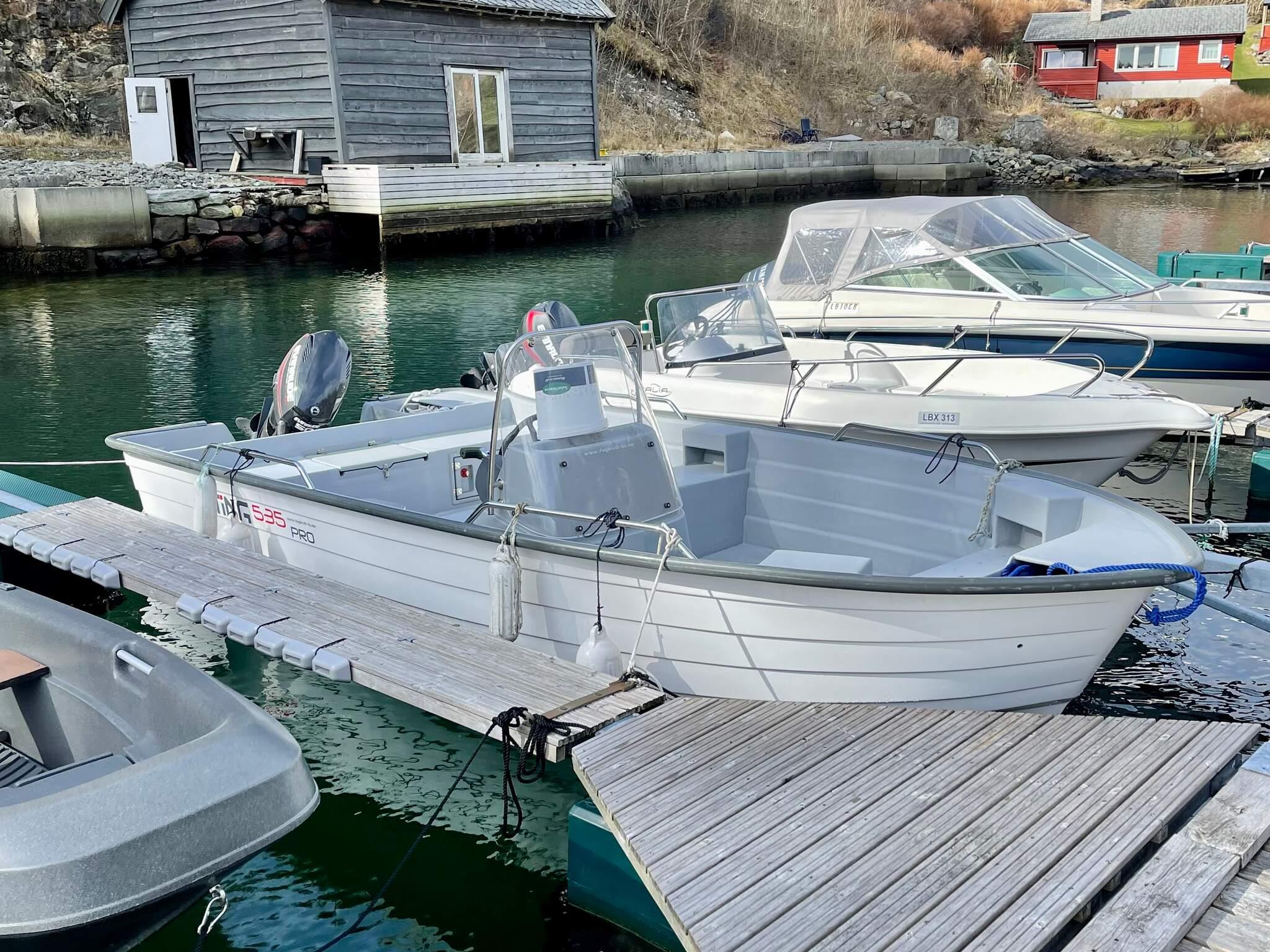 Båt til leie i privat båthavn og fileteringsplass for fiske ca. 450 m fra hytten. Det er parkeringsplass 80 meter fra båtplassen, de siste 30 m er bratt å gå, passer for de spreke. 18 fots båt Sting 535 med 50 HK Evinrude motor, Garmin 7-toms GPS, kartplotter og ekkolodd.