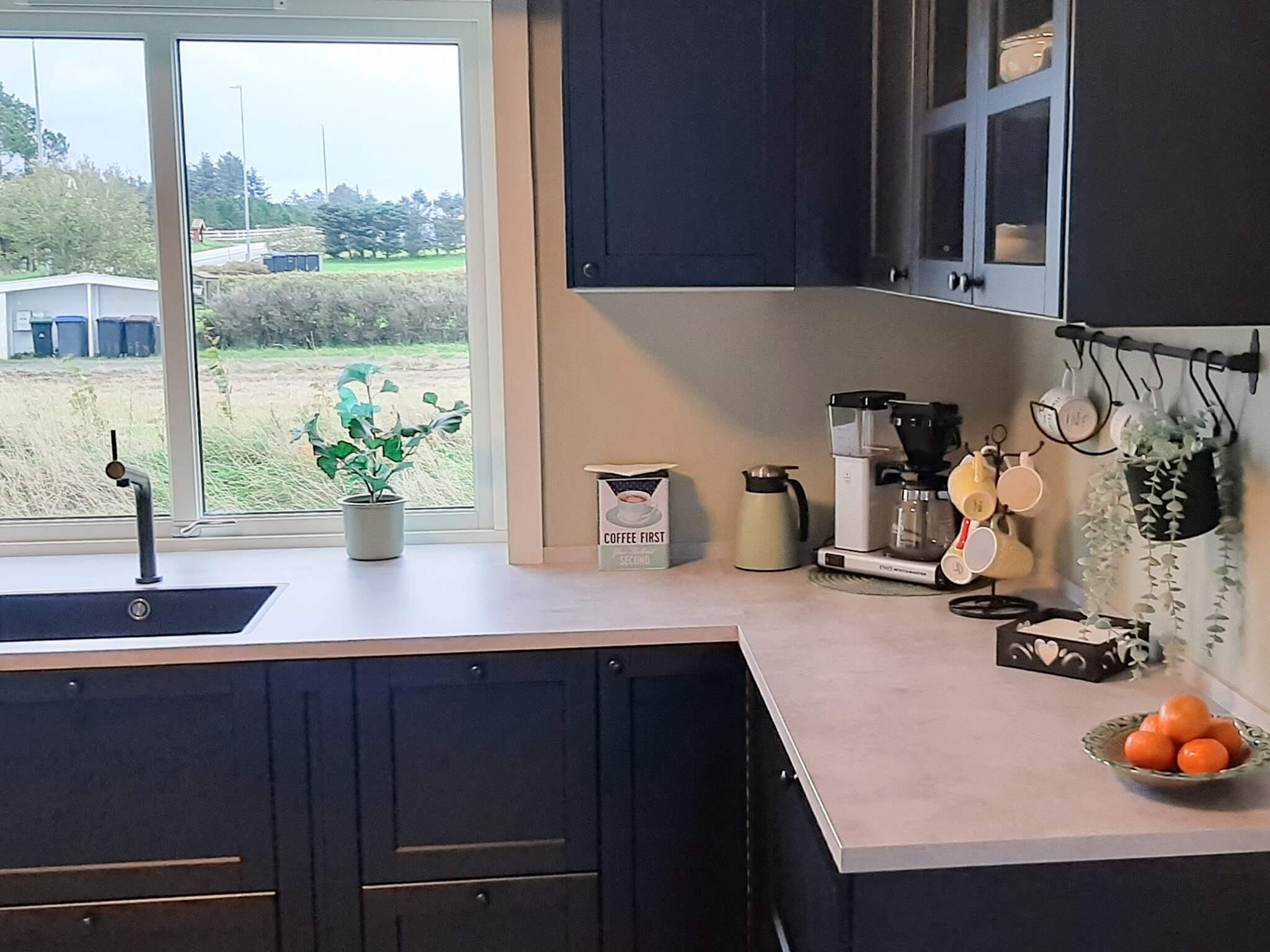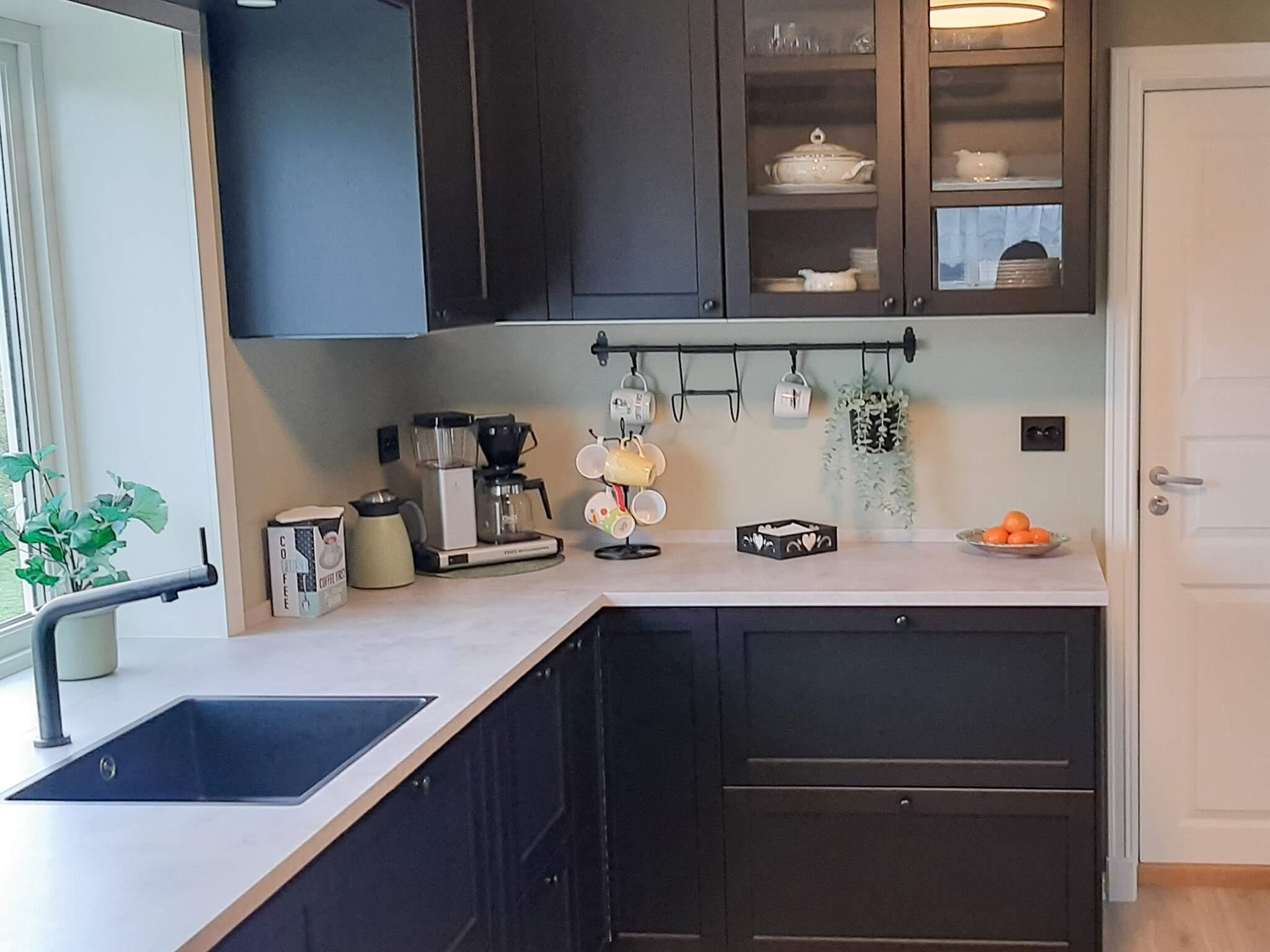 Køkken: Høj stol, el-komfur, køleskab, fryser 1 - 59 l, mikroovn, emhætte, opvaskemask., vaskemaskine, kaffetragt, vaffeljern