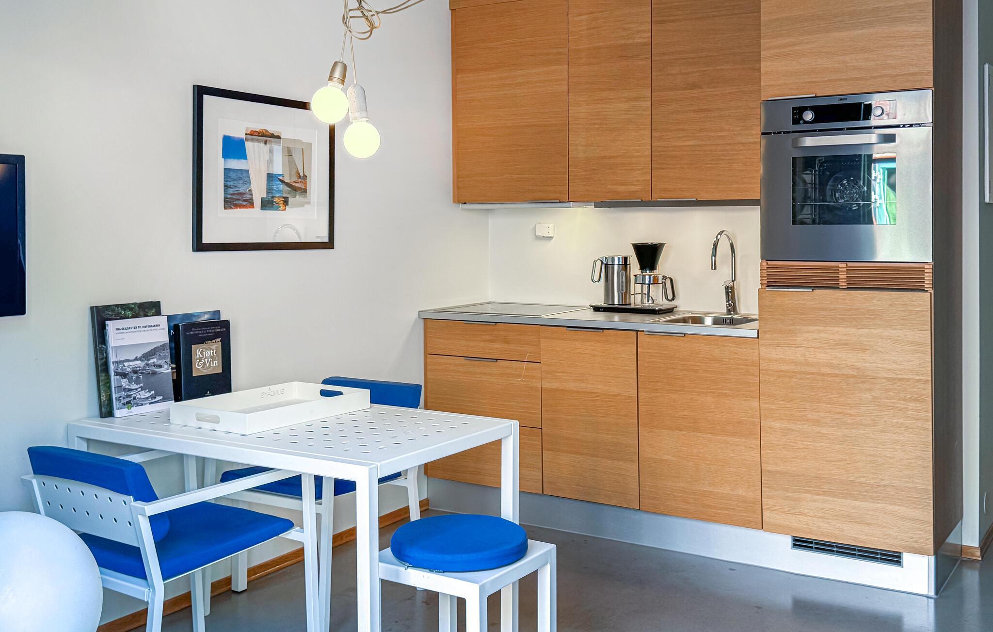 Denne lyse og luftige lejlighed har en beskyttet beliggenhed ved havnen på den smukke ø Ny-Hellesund og tilbyder jer et komfortabelt hjem væk fra hjemmet under en naturfyldt ferie ved havet. Tilbered solide måltider i det dejlige, åbne køkken og nyd fælles måltider ved det lyse spisebord. Hold hyggelige spilleaftener eller krøl jer sammen med en god bog i sofaen.
