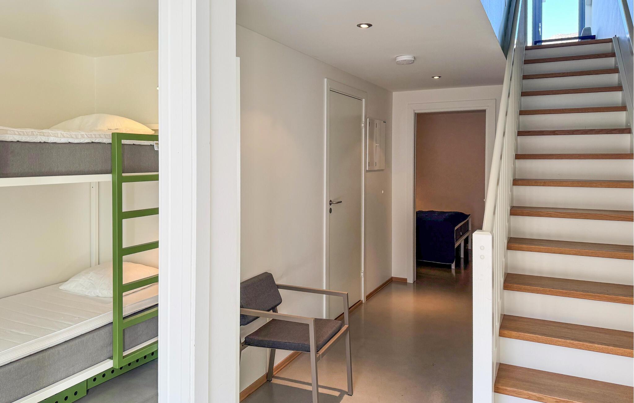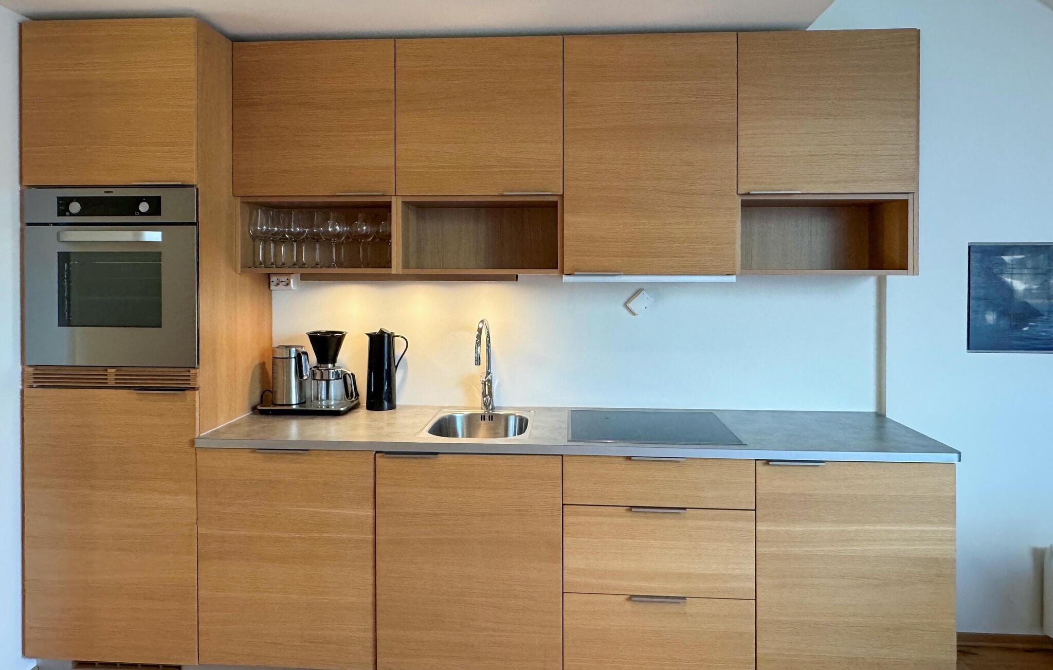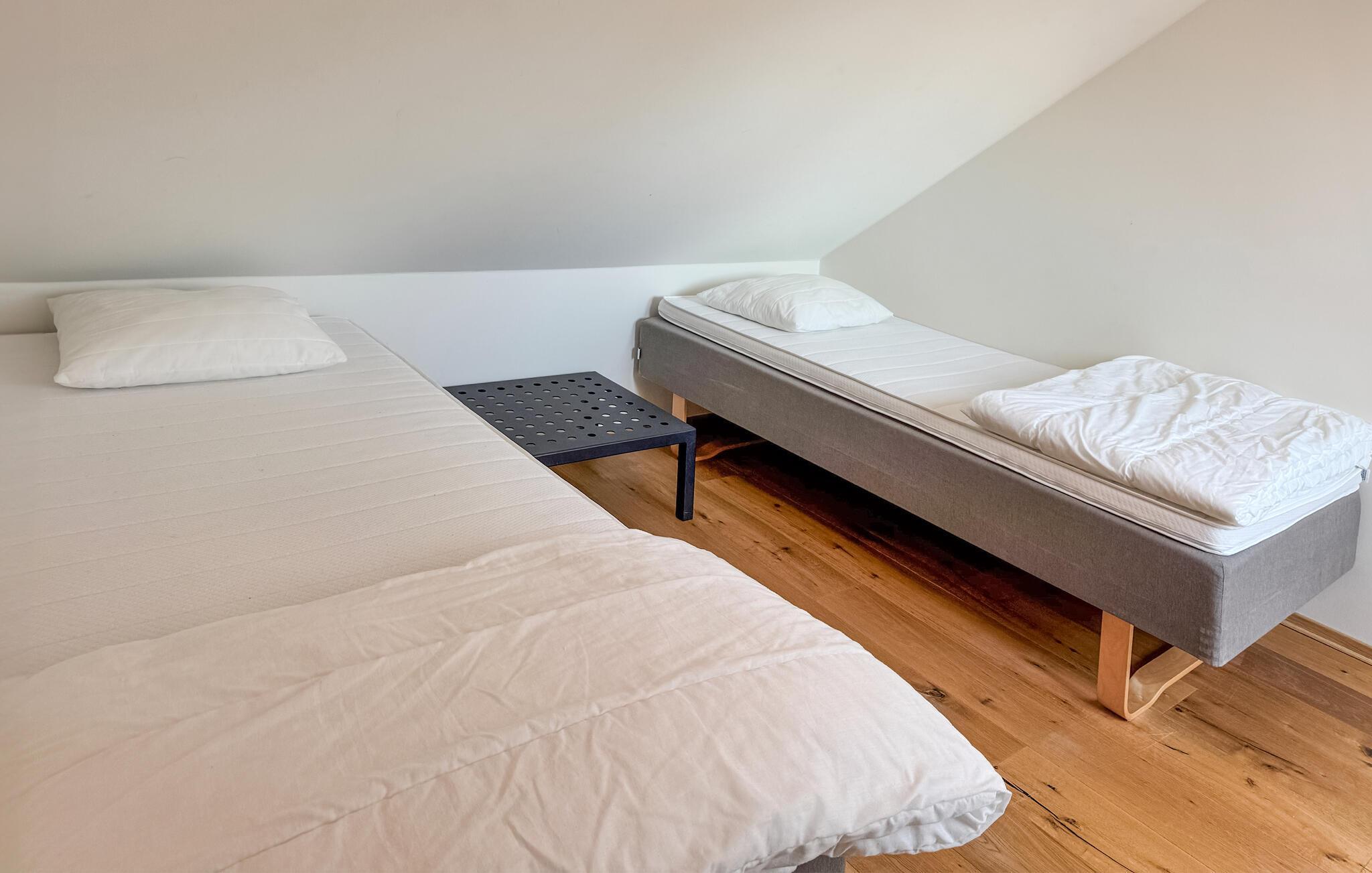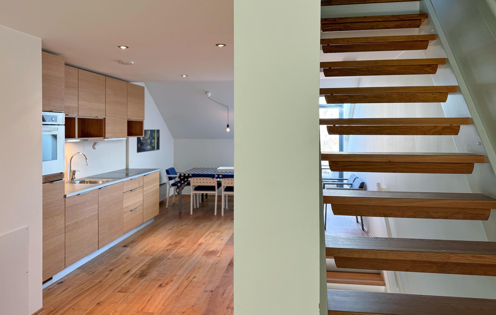 Jeres moderne og velindrettede lejlighed, beliggende direkte ved vandet, lægger op til at sætte hverdagen på pause. Nyd den lyse, indbydende atmosfære med naturlige materialer og rene linjer, der skaber en øjeblikkelig følelse af afslapning. Lav mad sammen i det smukke køkken og nyd jeres måltider ved det tilstødende spisebord. Opholdsstuen ovenpå, med sine komfortable siddepladser, tilbyder plads til afslappende timer, uanset om I læser, spiller spil eller nyder et glas vin om aftenen.