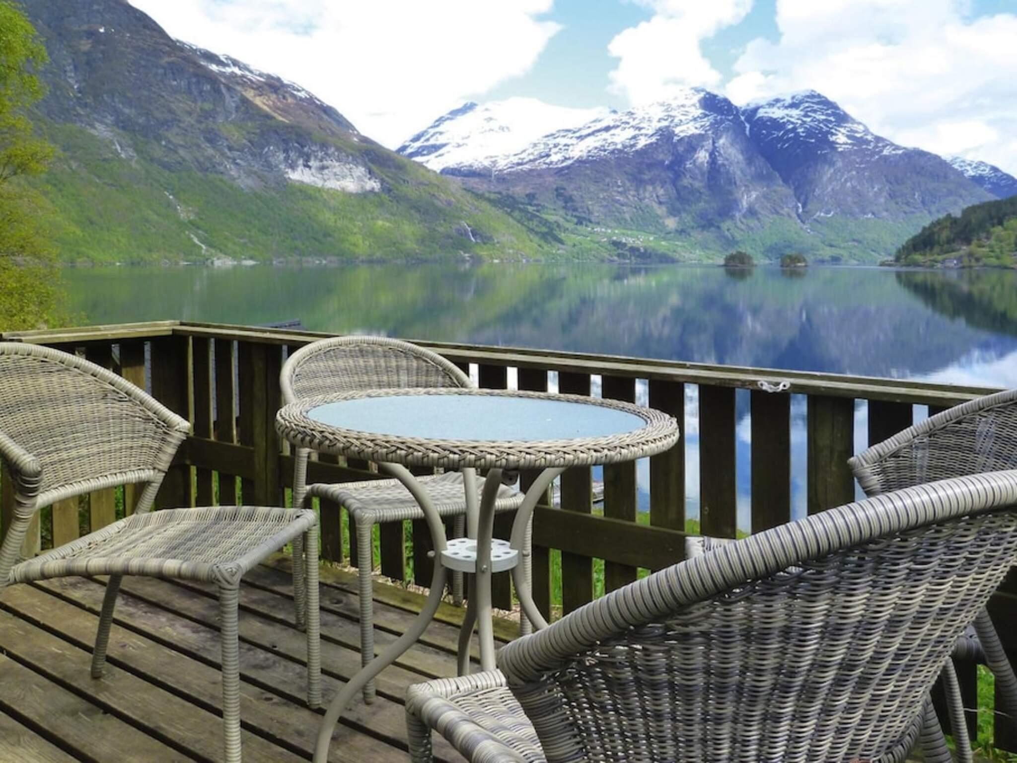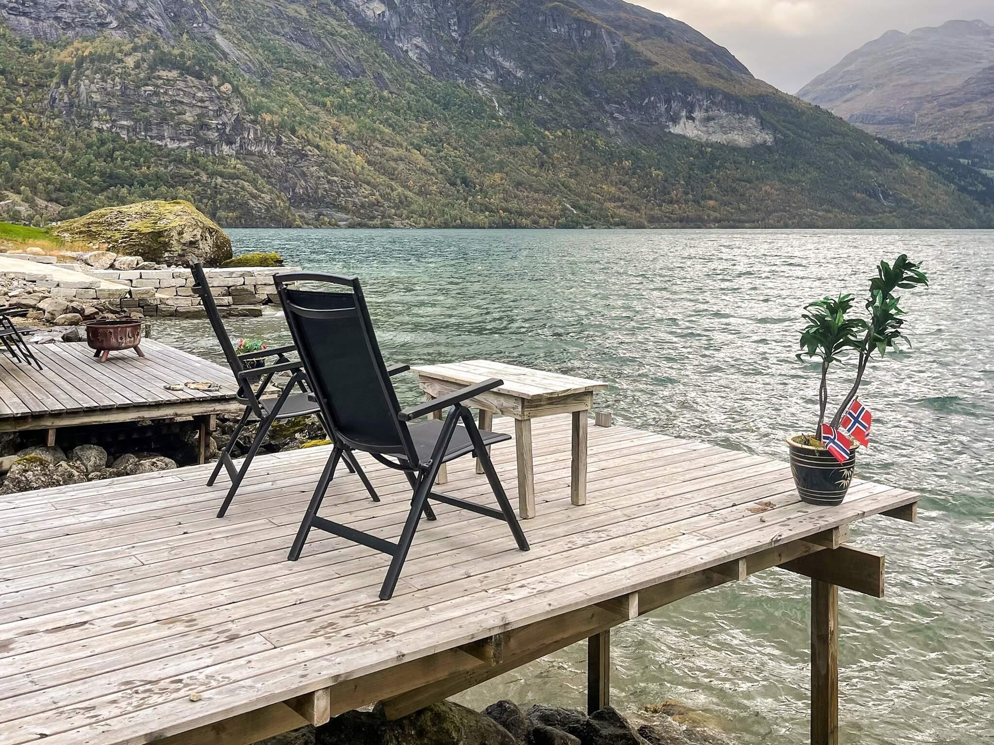 Koselig feriehus med panoramautsikt over Oppstrynsvatnet, naust, privat brygge og robåt.