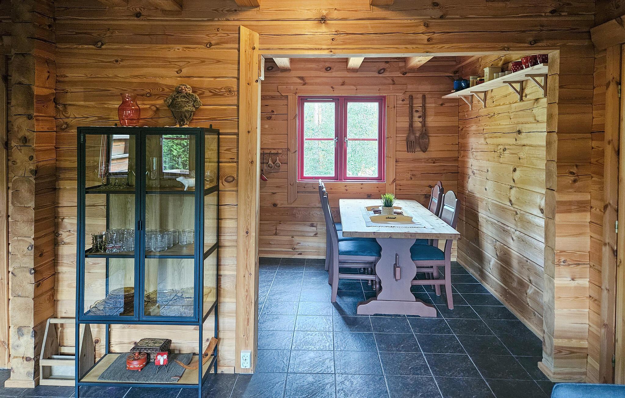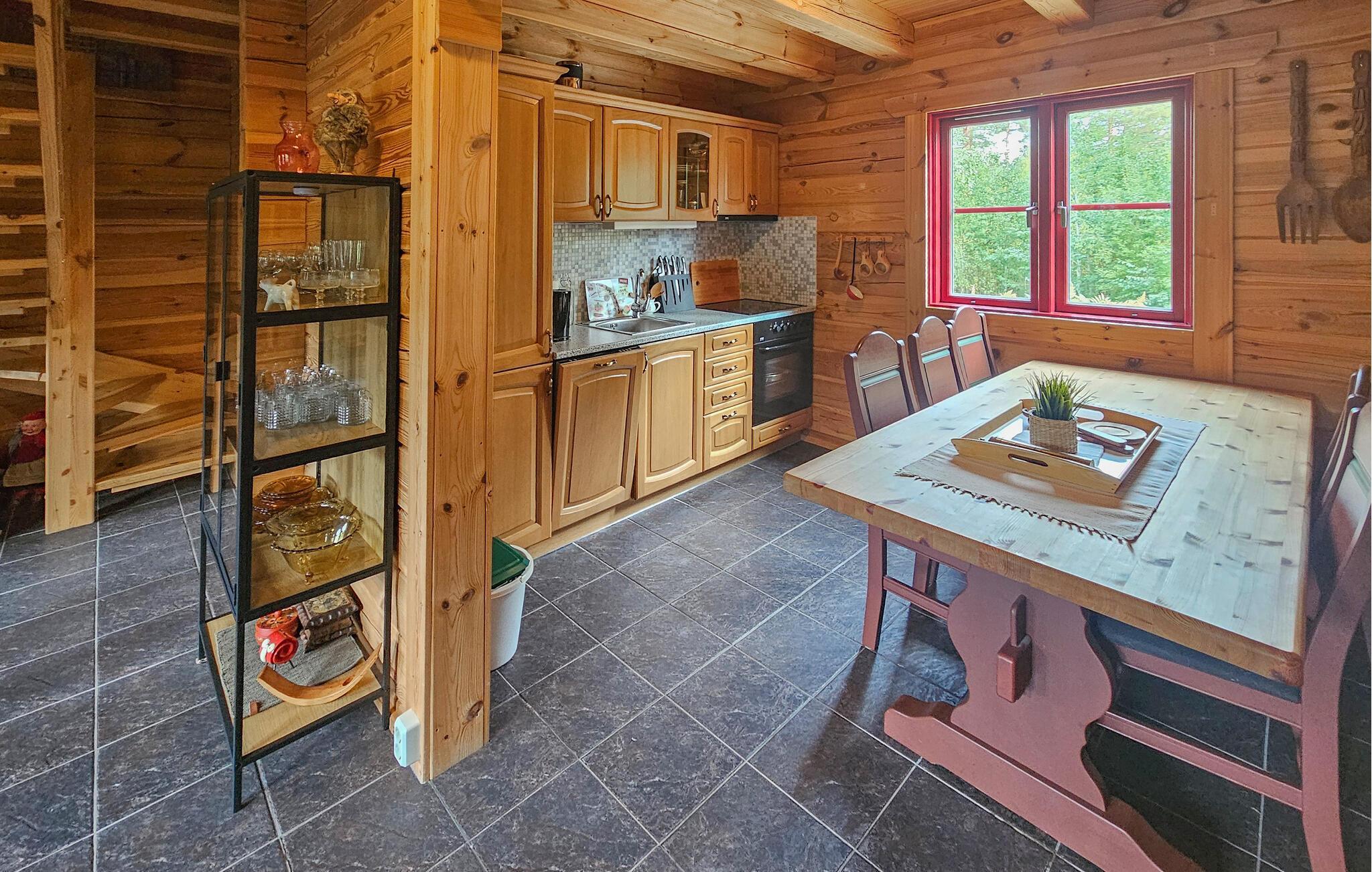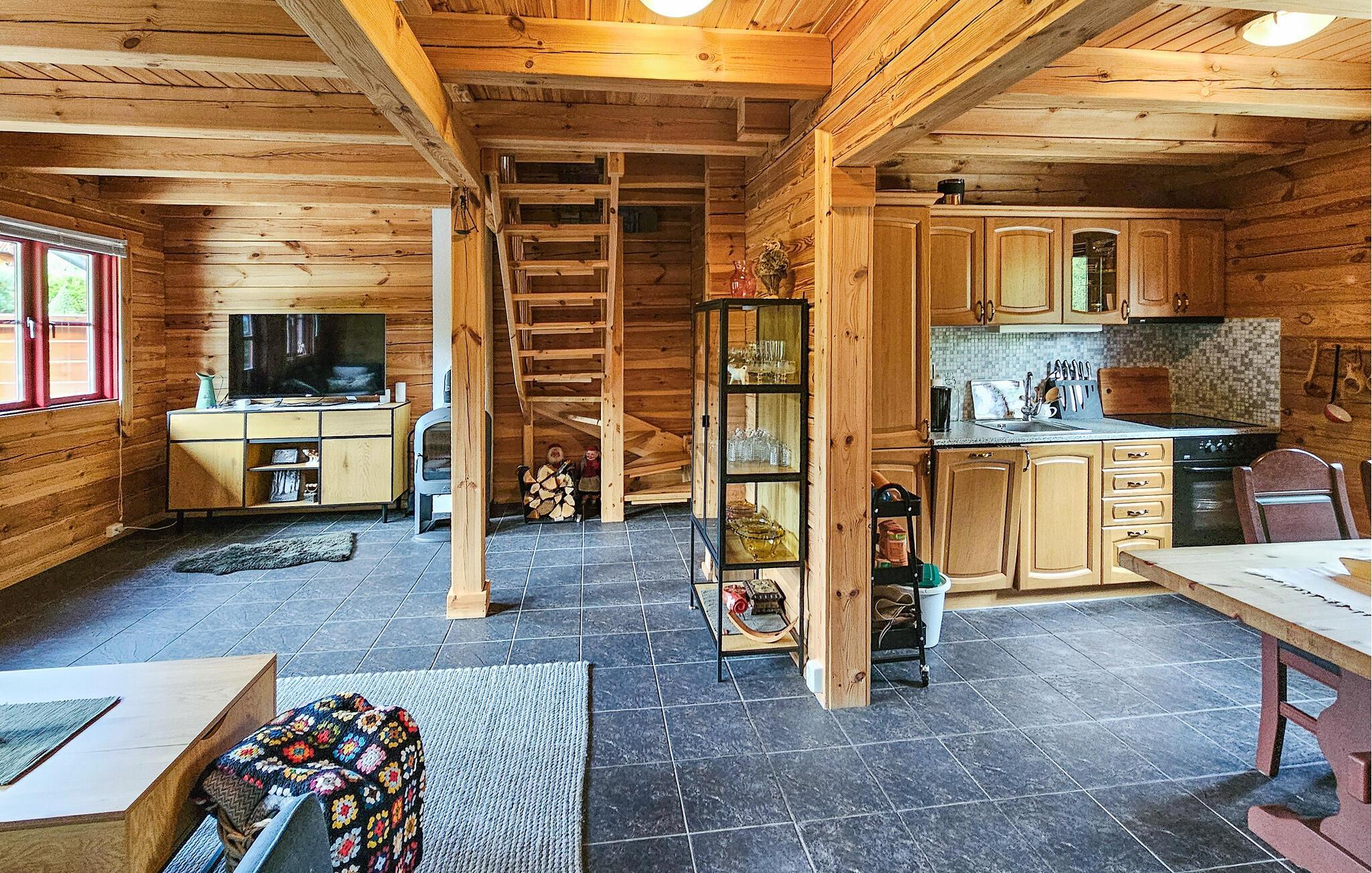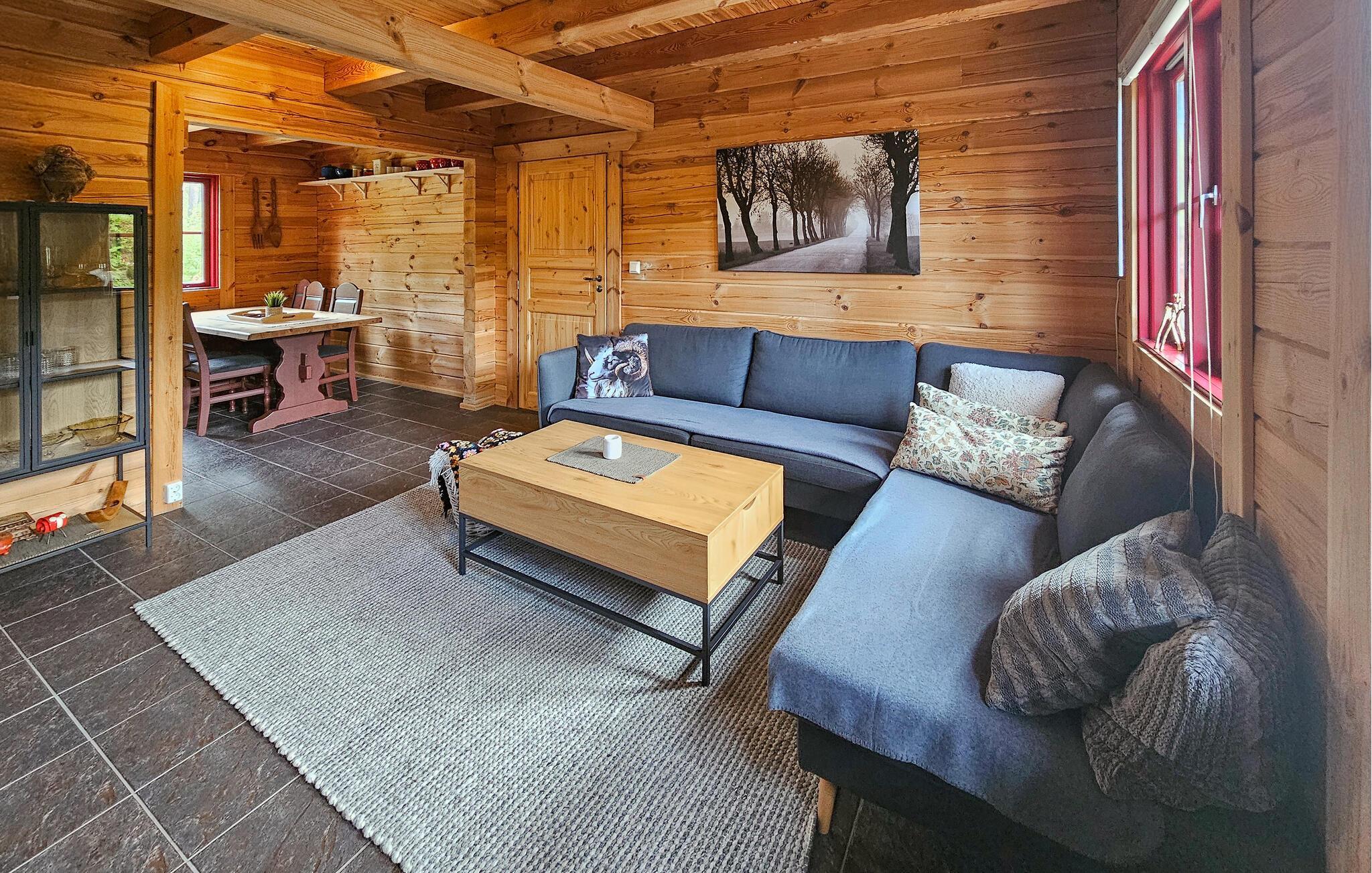 Den åbne stue har en brændeovn, der sørger for hyggelig varme på kølige dage. Læn jer tilbage i det komfortable sofahjørne og nyd afslappende timer med familie eller venner. Brug det veludstyrede køkken med spisebord til at tilberede måltider sammen og nyd den rustikke atmosfære med varmt træinteriør, der udstråler hygge.