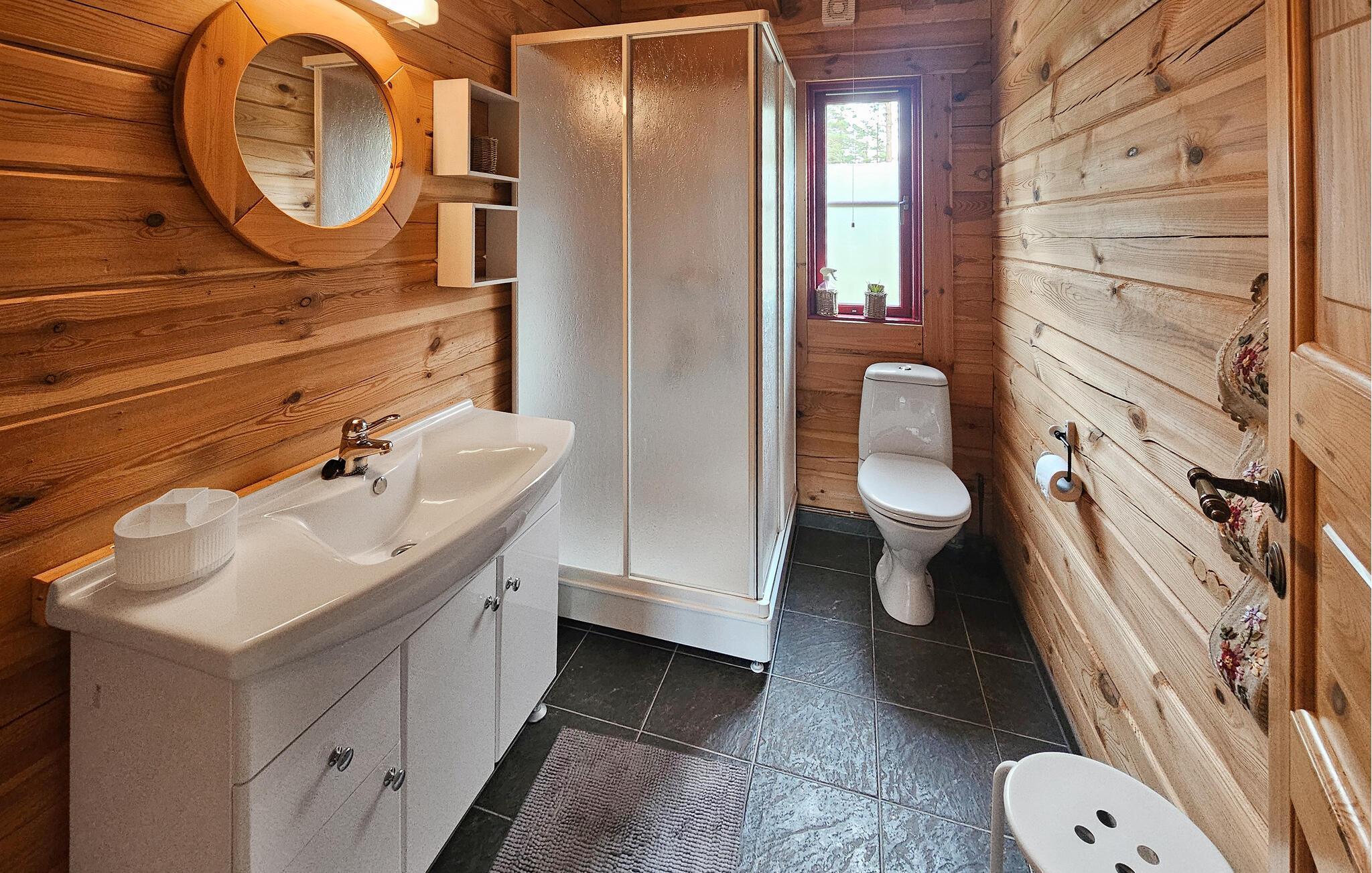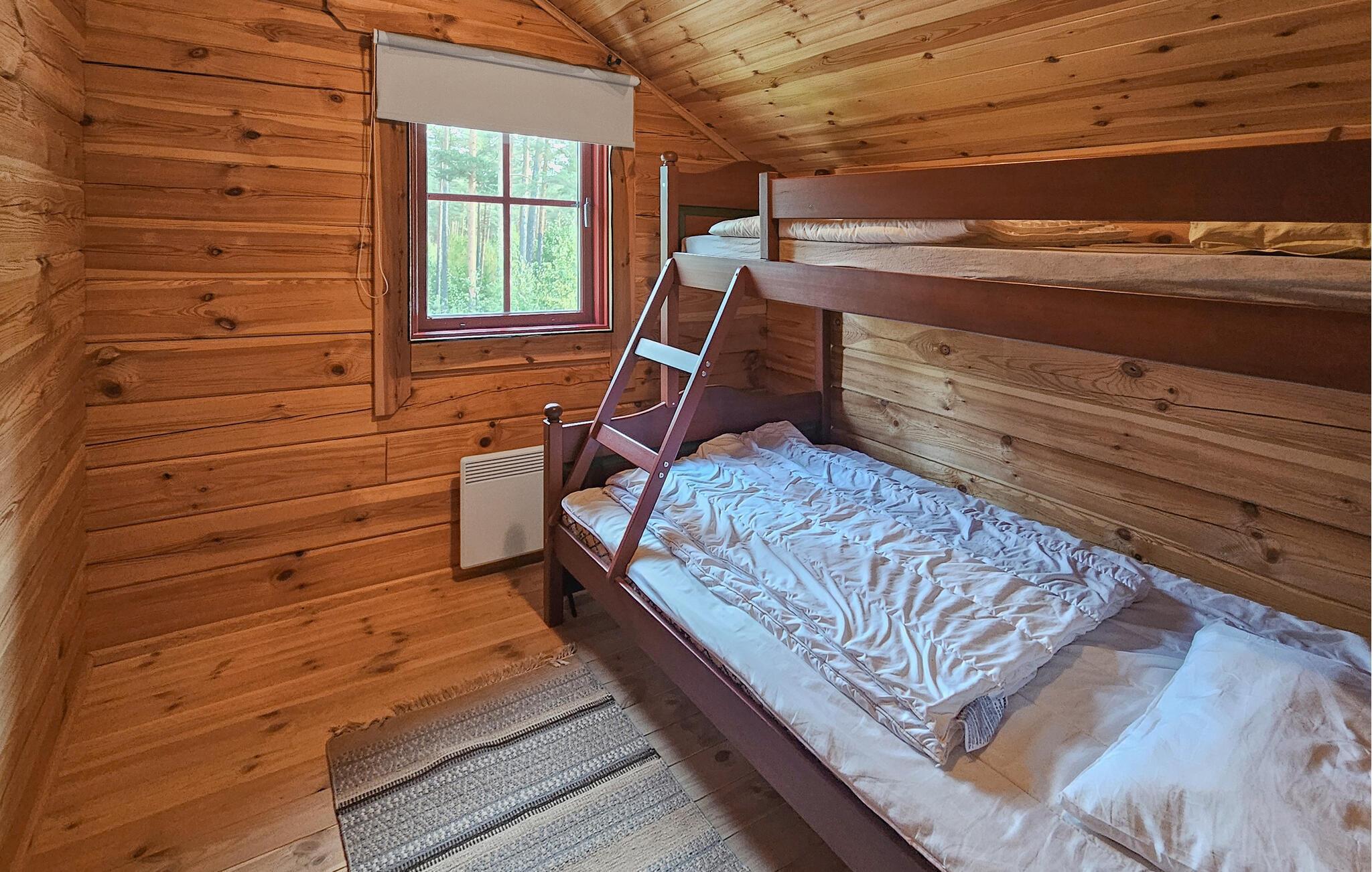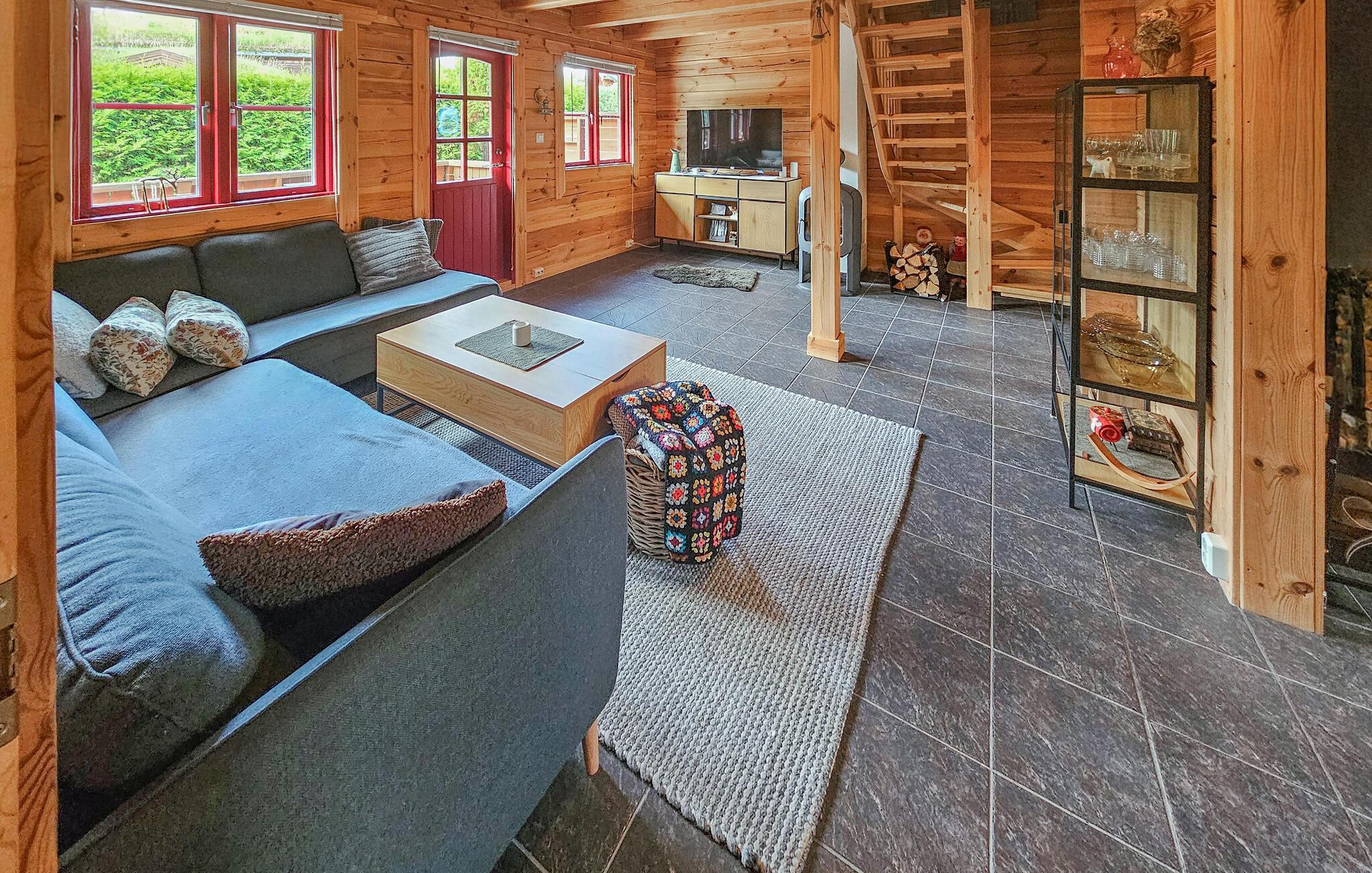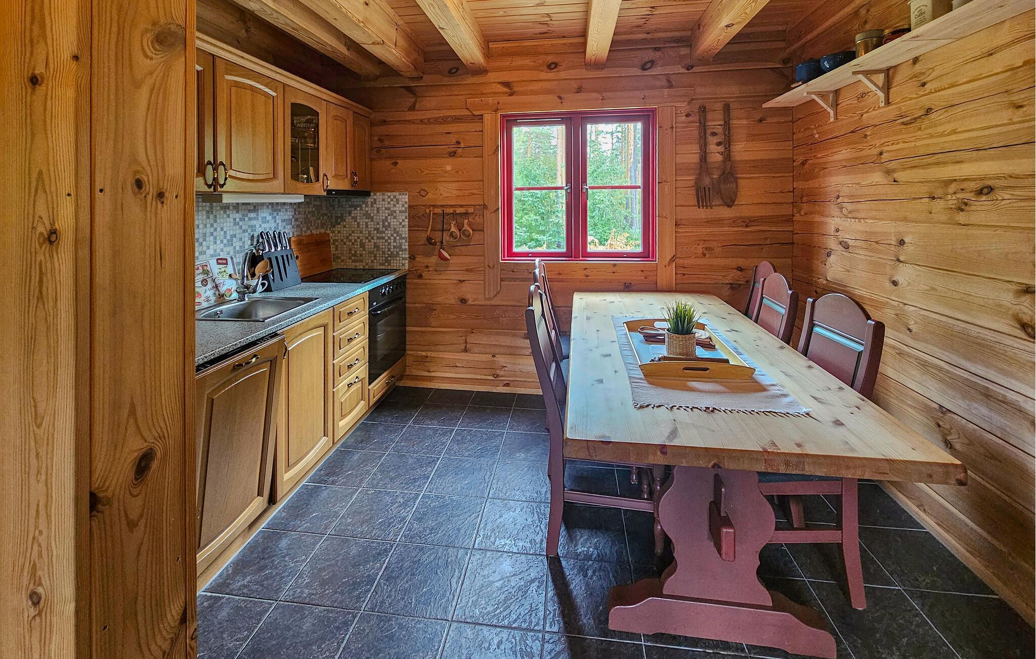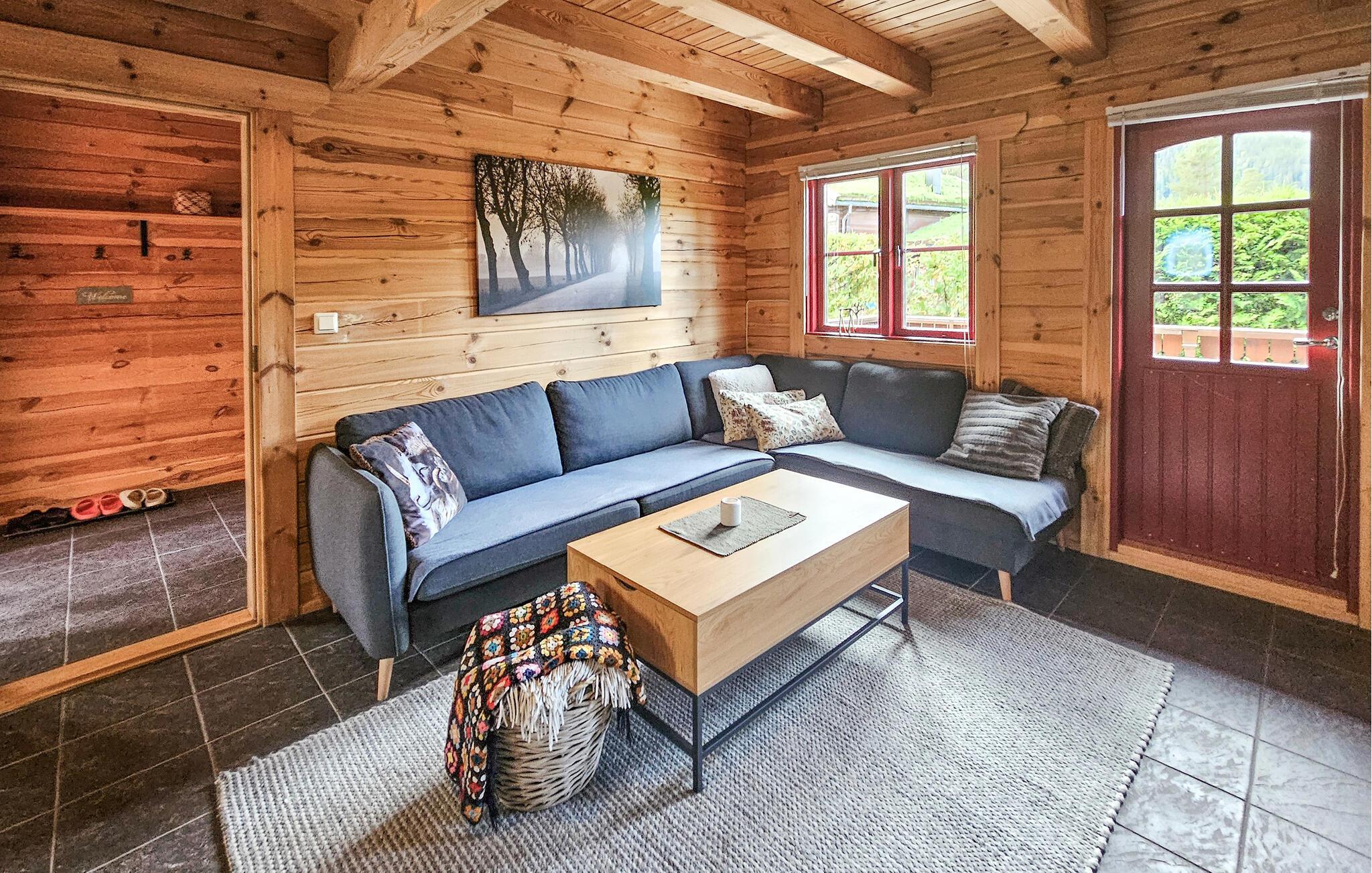 Den åbne stue har en brændeovn, der sørger for hyggelig varme på kølige dage. Læn jer tilbage i det komfortable sofahjørne og nyd afslappende timer med familie eller venner. Brug det veludstyrede køkken med spisebord til at tilberede måltider sammen og nyd den rustikke atmosfære med varmt træinteriør, der udstråler hygge.