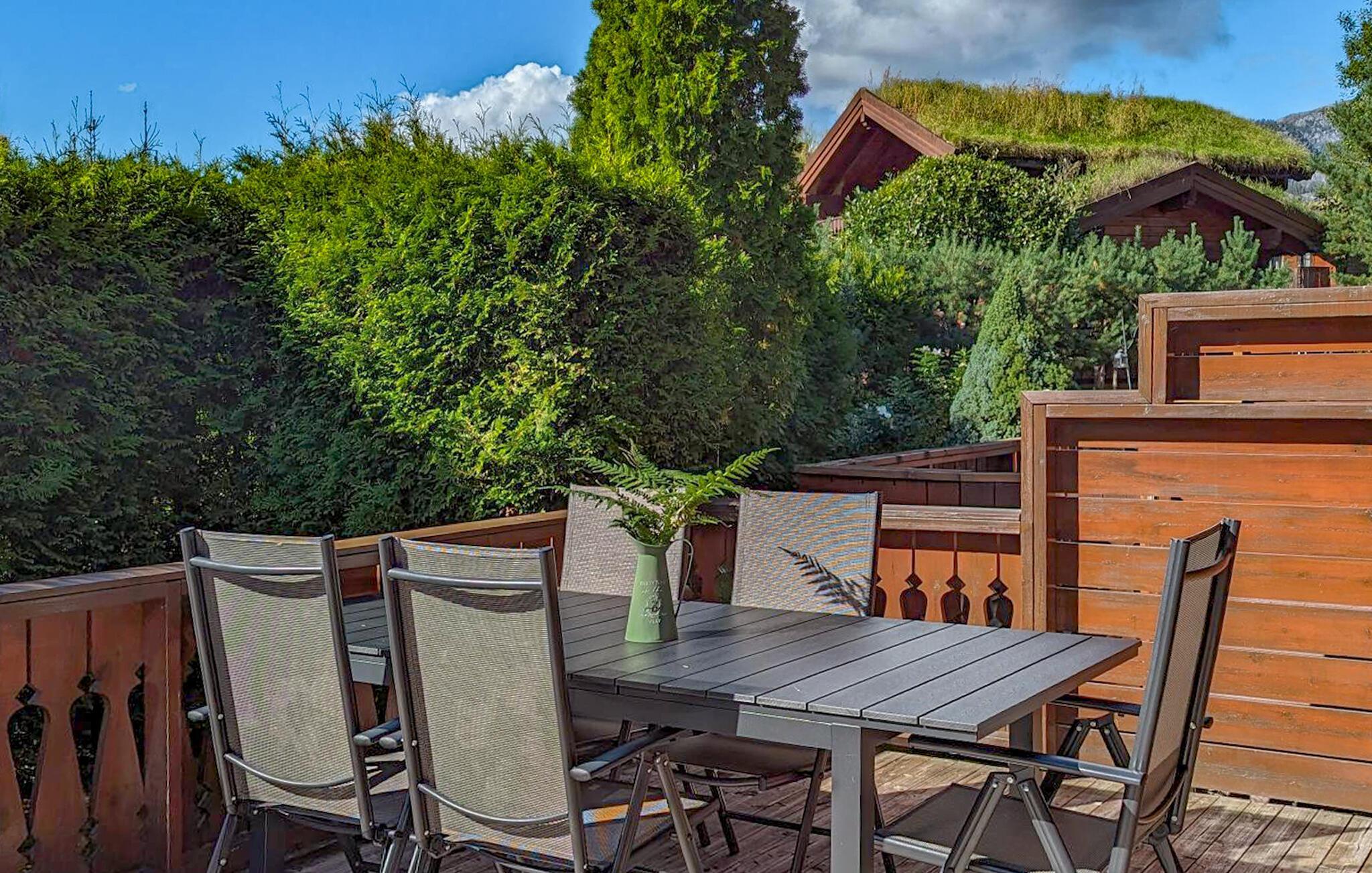 Træd ud på terrassen og sæt jer ved det udendørs siddeområde. Nyd den beskyttede beliggenhed mellem grønne hække og omgivet af en traditionel hyttekulisse. Lad udsigten vandre over den omkringliggende natur og brug terrassen til solrige timer eller hyggelige aftener.