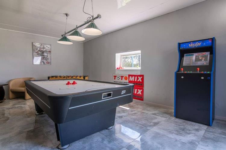 Vi tilbyder et moderne og komfortabelt enfamiliehus beliggende på en rummelig, indhegnet grund på 6.000 m². Det er det perfekte sted for dem, der værdsætter privatliv, afslapning og aktiv fritid. Ejendommen har en 25 m² swimmingpool med en dybde på 160 til 160 cm, der er sæsonbestemt tilgængelig fra 1. maj til 30. september. For sportsentusiaster er der en volleyballbane, bordtennisbord og en volleyballbane til rådighed. Der er også en trampolin, grill og parkeringsplads. Der er en ladestation til elbiler på stedet. For fiskeentusiaster er der mulighed for fiskeri (tilladelse kræves). Landbrugsprodukter kan også købes på gården, så I kan nyde friske, lokale specialiteter. For vores yngste gæster er der et legehus i haven, der tilbyder sikker og engagerende leg. Underholdningsentusiaster vil finde et 25 m² stort elektronisk spille- og arkadespilrum udstyret med dart, en spillehal og bordfodbold.