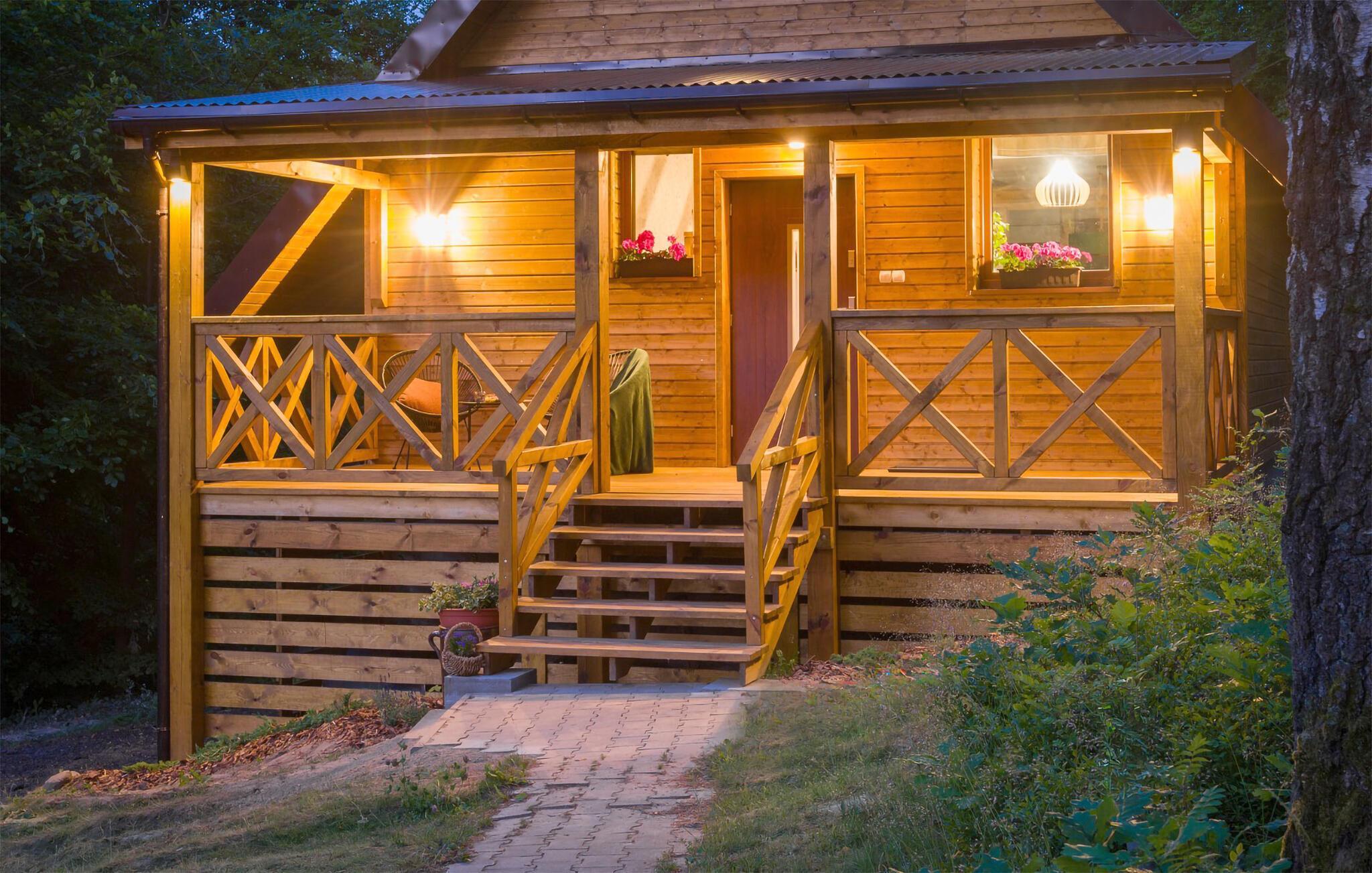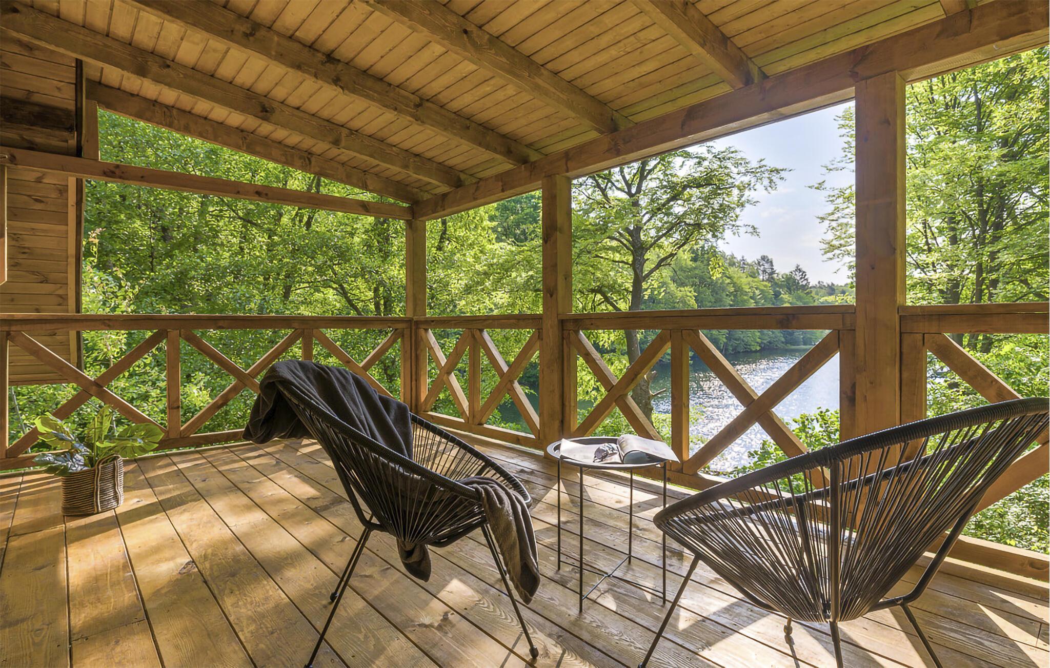 Dette skønne træhus med stor veranda har en idyllisk beliggenhed ved søen.