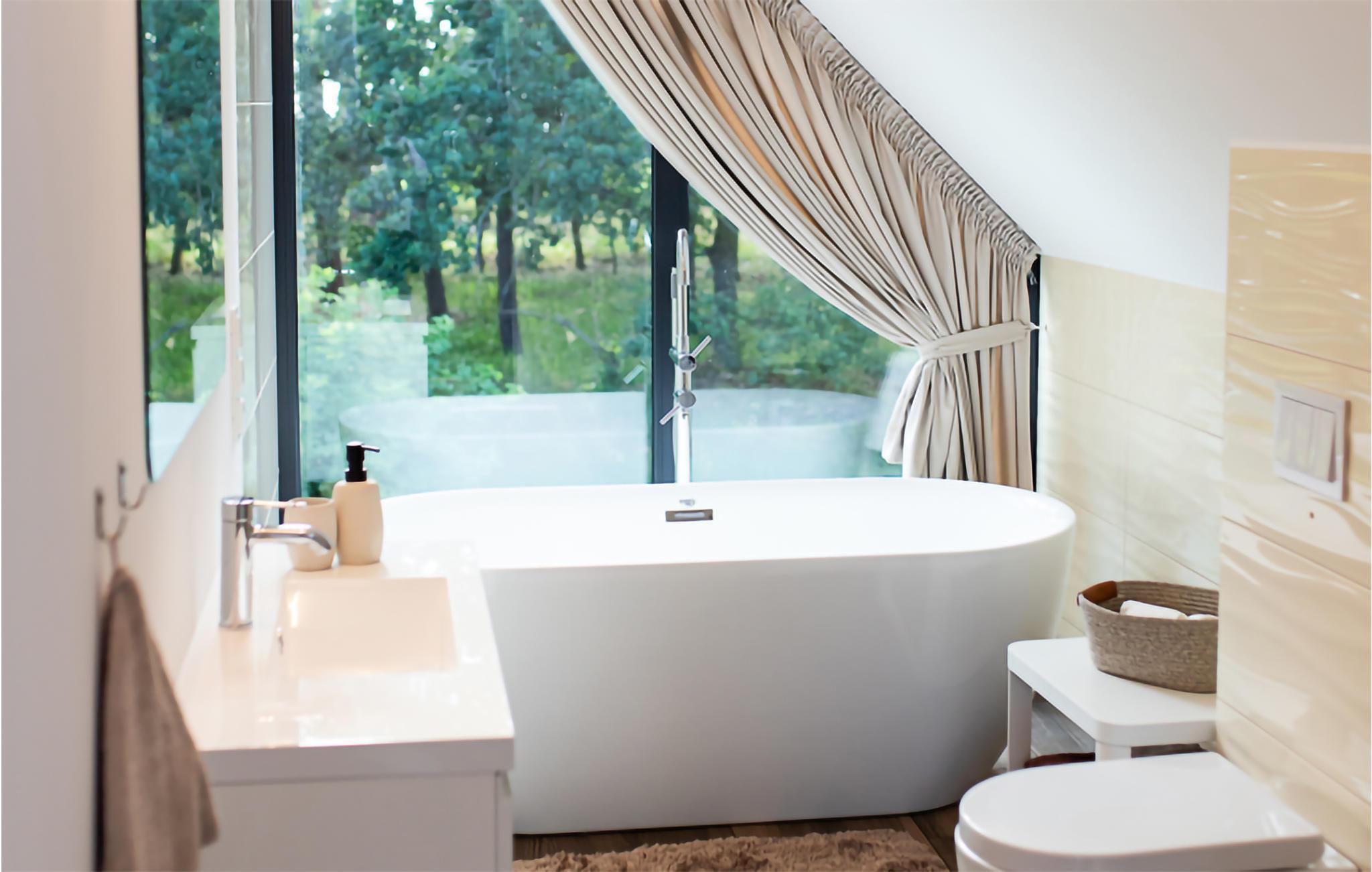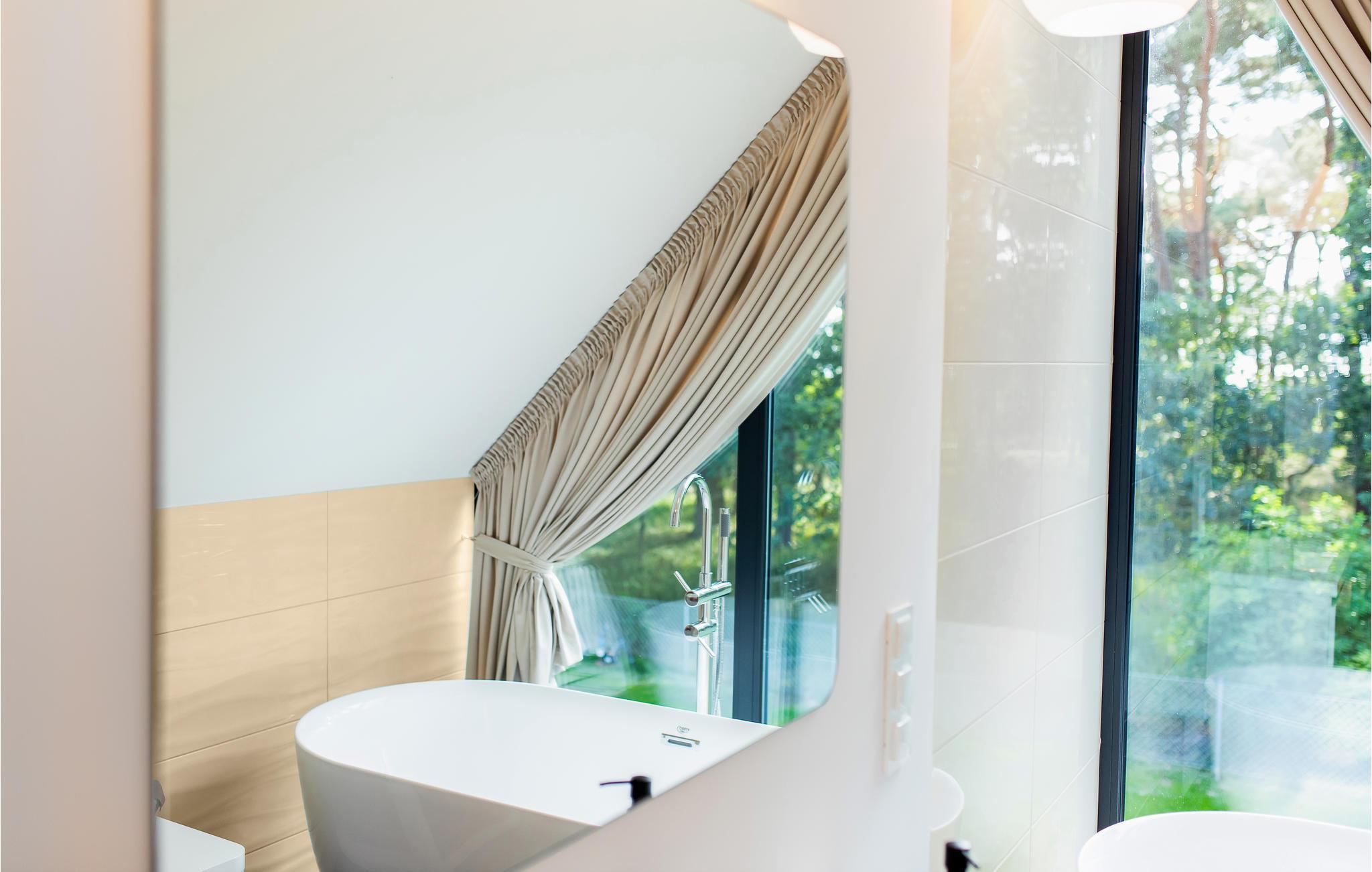 Dette skønne feriehus ligger på en grund med flere feriehuse. Her får I en dejlig base i de moderne, smagfulde moderne lokaler, som giver jer gode rammer til at slappe af. De store vinduespartier lukker det naturlige lys ind i rummene, og skulle I trænge til lidt ekstra forkælelse oven på en lang dag, kan I læne jer tilbage i badekarret.
