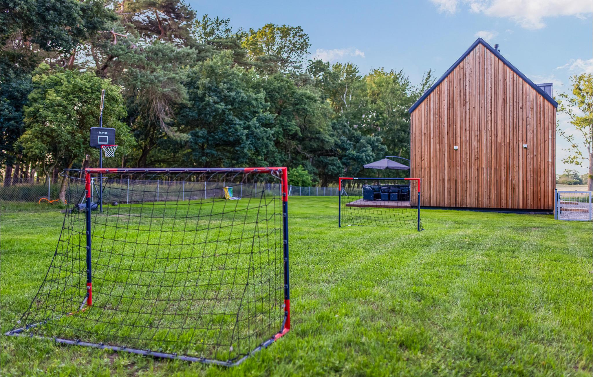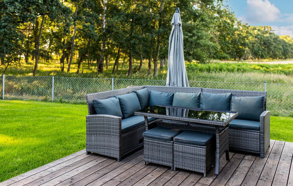 Dette skønne feriehus ligger på en grund med flere feriehuse. Her får I en dejlig base i de moderne, smagfulde moderne lokaler, som giver jer gode rammer til at slappe af. De store vinduespartier lukker det naturlige lys ind i rummene, og skulle I trænge til lidt ekstra forkælelse oven på en lang dag, kan I læne jer tilbage i badekarret.