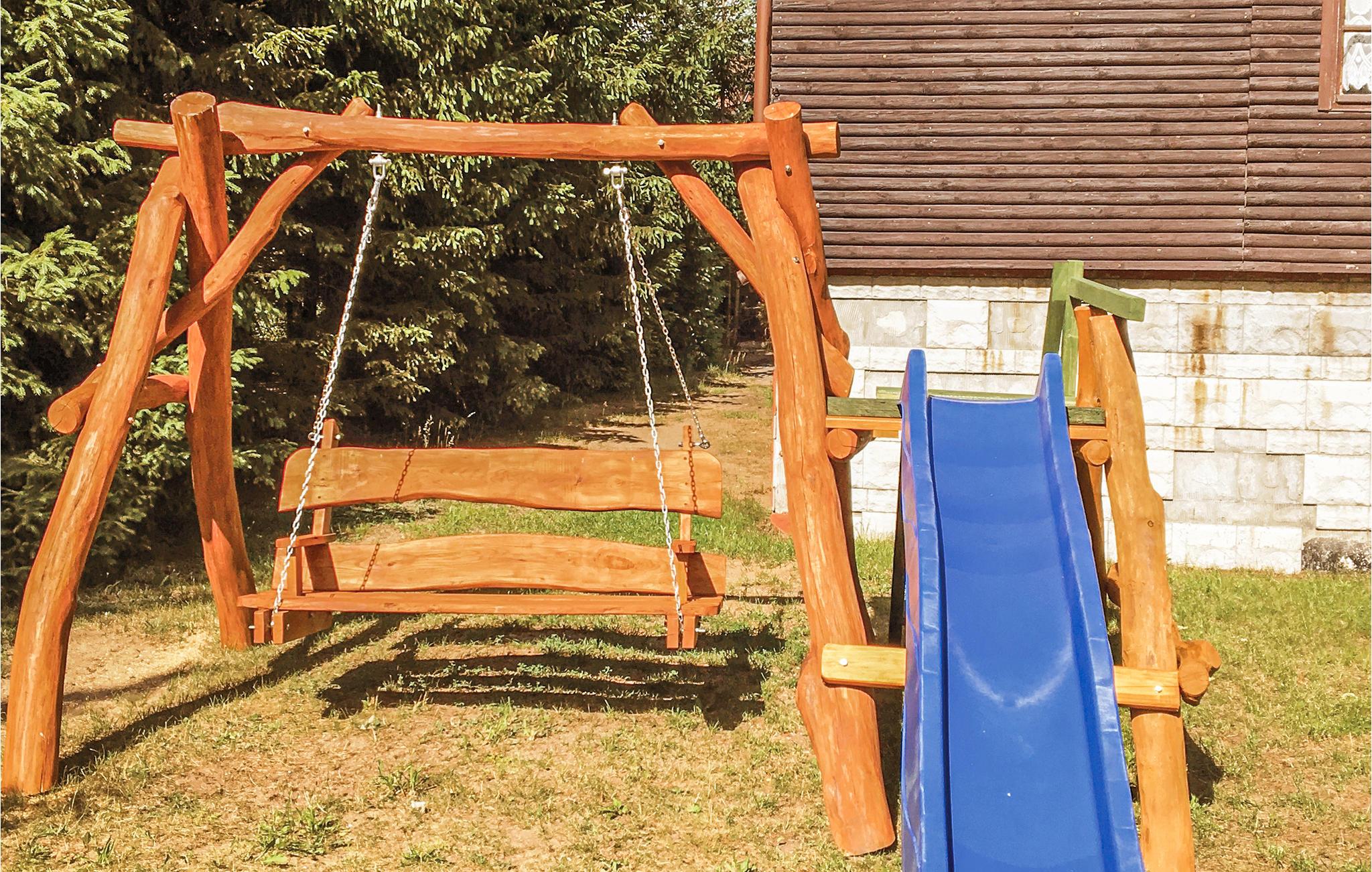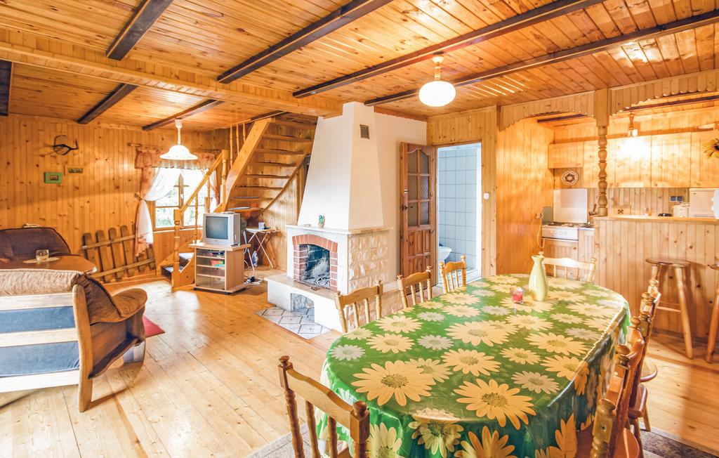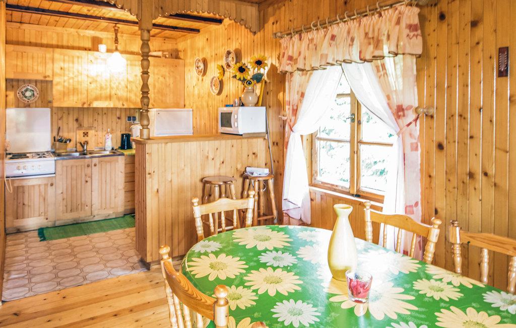 Glæd jer til panoramaudsigten fra dette feriehus af træ, der ligger omgivet af skøn frodig natur. Huset ligger på en fælles, ikke indhegnet grund. Det er indrettet enkelt med blandede møbler af forskellig alder, men med en hjemlig charme. I bor ikke langt fra en campingplads. I huset er der en stejl trappe og der er ikke døre for soveværelserne. I kan leje en vandcykel til sjove udflugter på søen. Masurien er landet med de 400 søer i et fascinerende oprindeligt landskab som er et af de mest søgte rejsemål i Polen. Vi kan anbefale jer at leje kanoer til interessante udflugter på vandet.