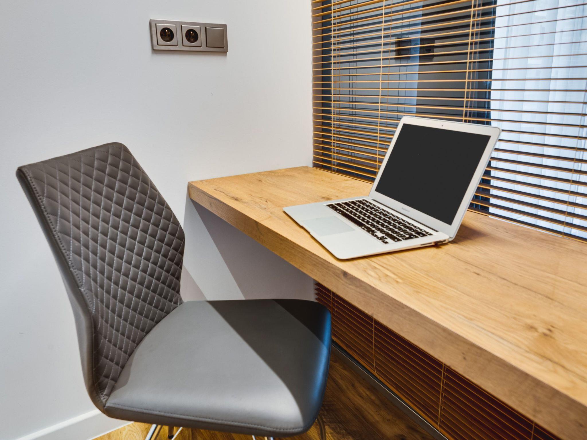 Inside, there is a spacious living room with a sofa bed and LCD TV, which connects to a fully equipped kitchenette. There is also a bedroom with a large, comfortable bed and a comfortable bathroom. The flat is equipped with two independent remote working spaces, which also makes it ideal for longer business stays.