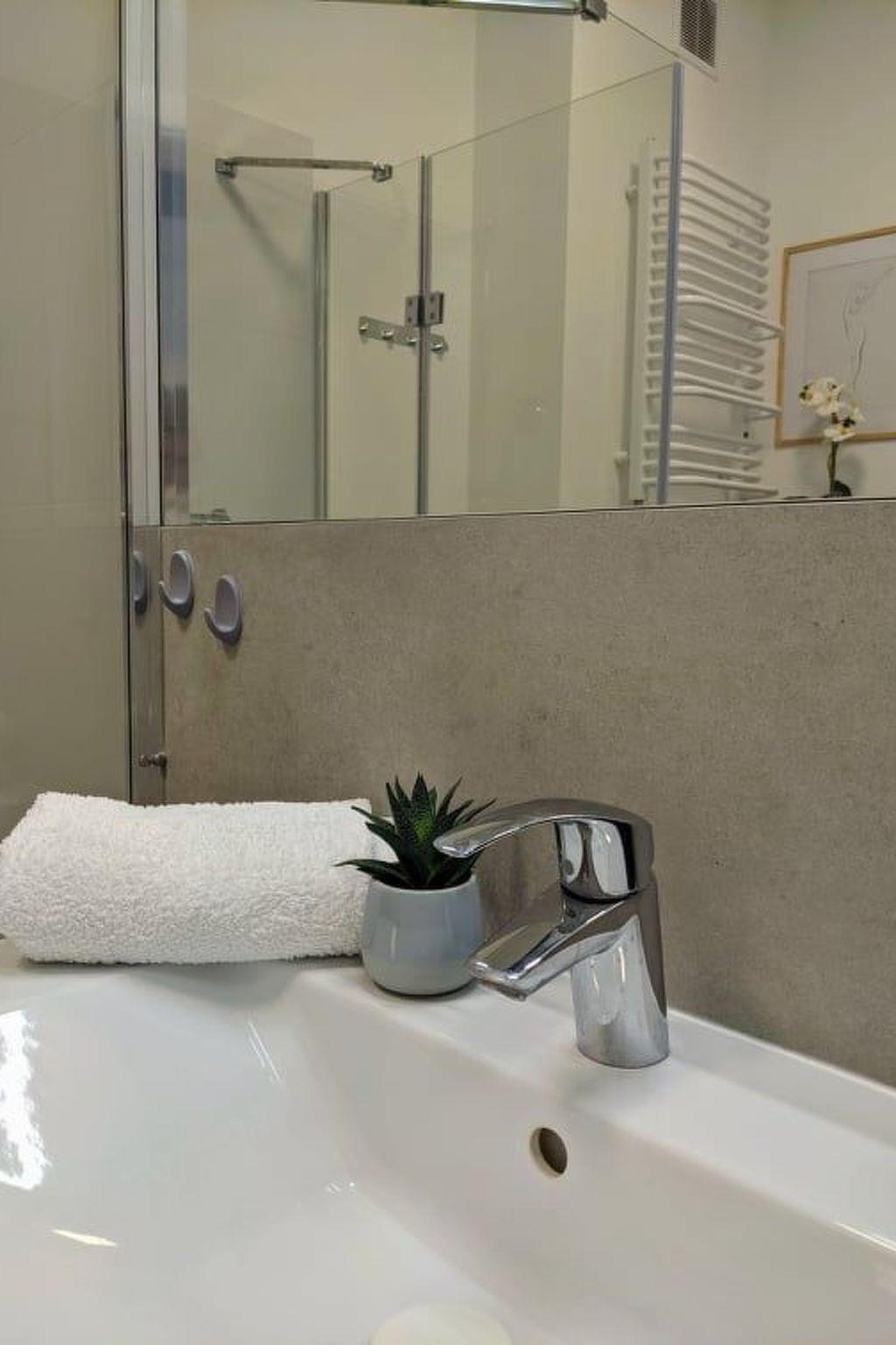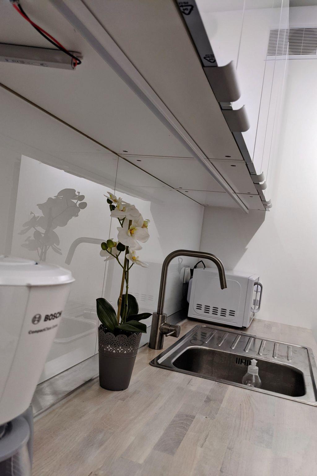 The flat has a kitchen with induction hob, microwave oven, coffee expert, kettle free of charge.