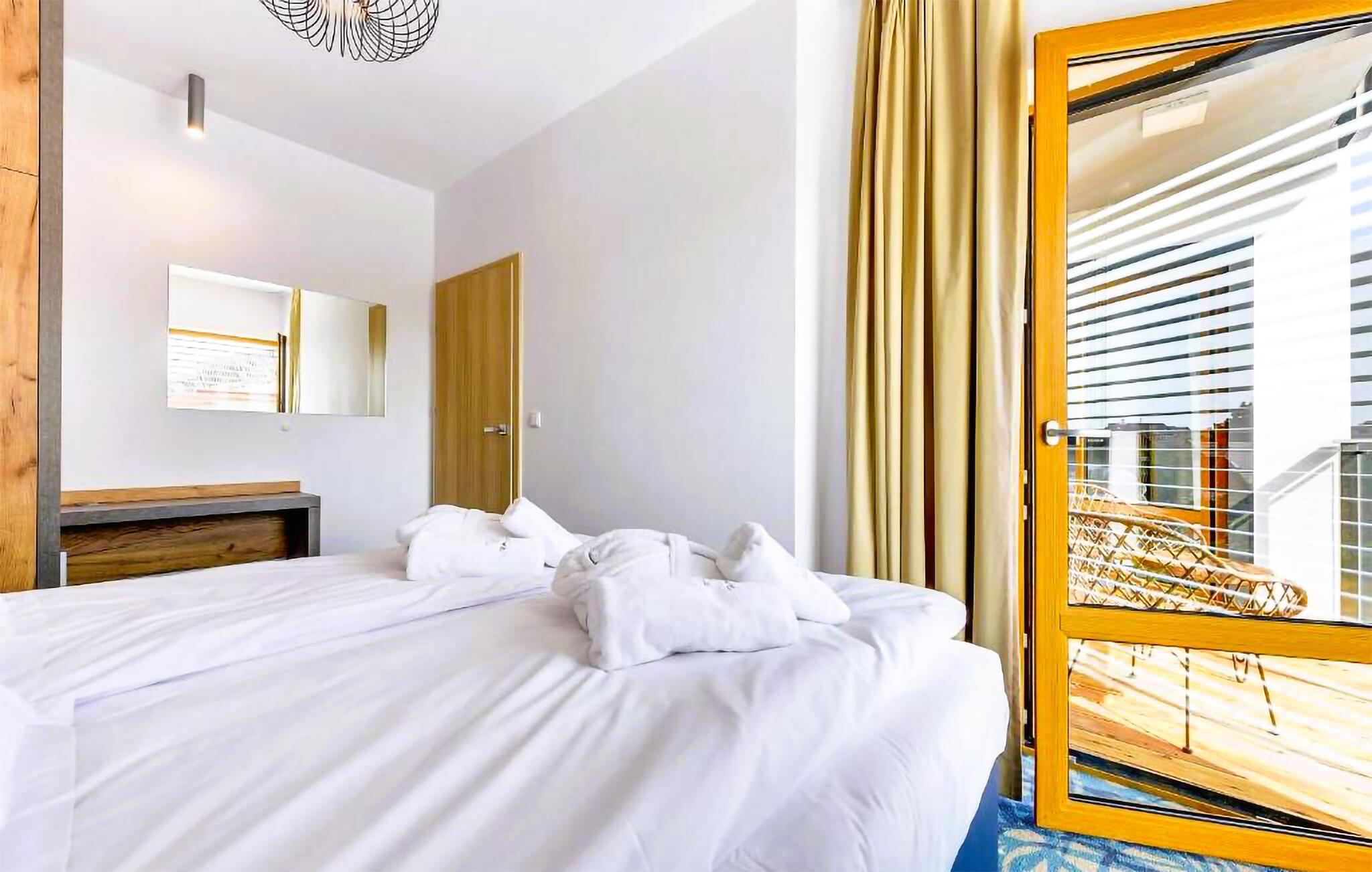 Den lange halvø Hel rager godt ud i Gdansk-bugten, og her finder I denne luftige og komfortable lejlighed, hvor I får alt, I behøver for en fremragende ferie. Tag færgen, toget eller bilen hertil fra Gdynia og glæd jer til indretning, der fremtræder lyst og lækkert med moderne faciliteter og et lækkert lysindfald gennem de store vinduespartier. Fra stuen og et af soveværelserne har I udgang til den skønne altan, hvor I kan nyde de lange, lune sommeraftener sammen over et lækkert måltid mad og et glas god vin.