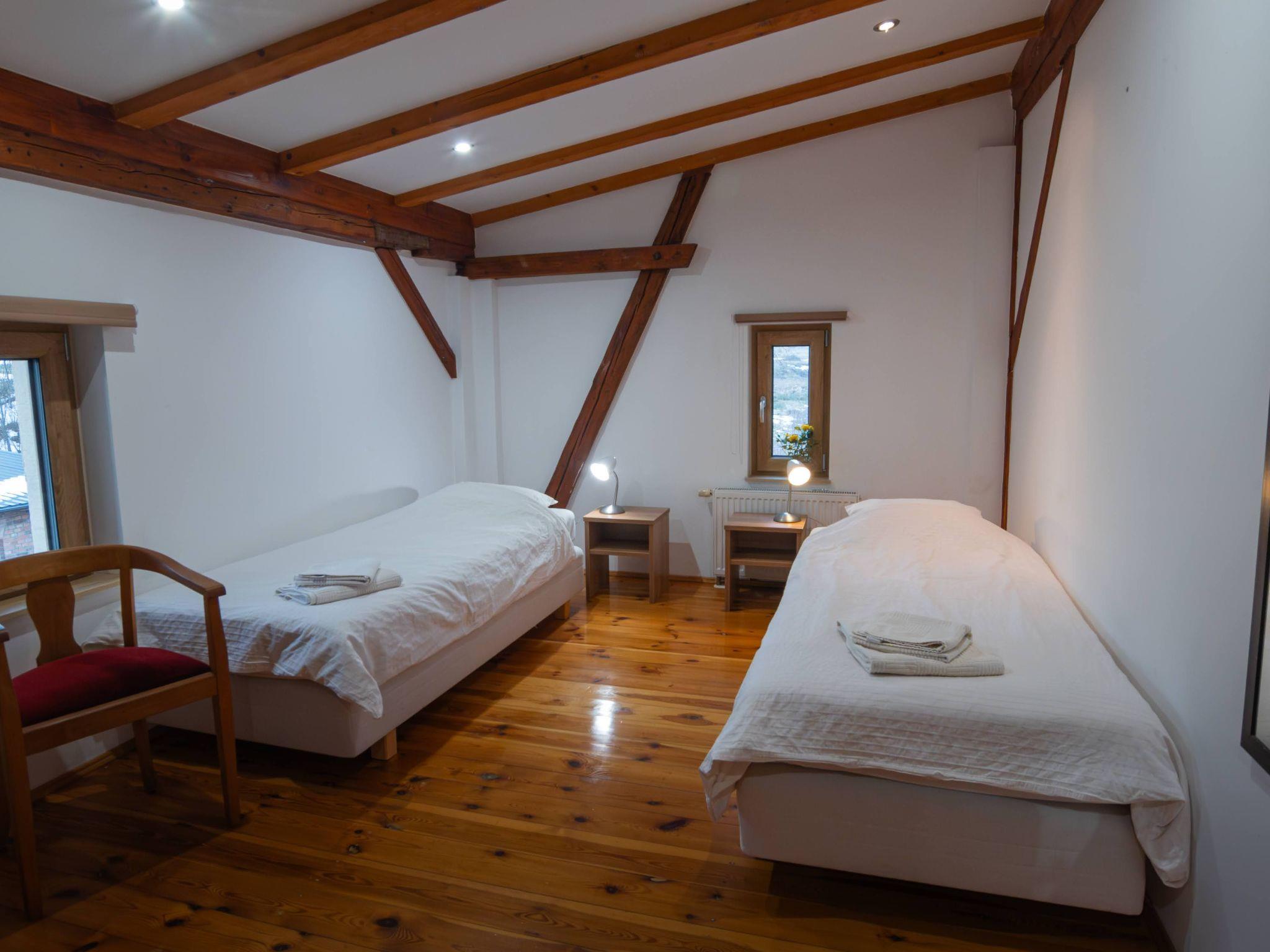 Domstolat is a historic farmhouse on the Bobr River in the village of Janowice Wielkie in Dolny Slaskie Province, former Silesia in south-west Poland. Domstolat is a double house with two fully equipped dwellings under one roof. Domstolat A is the authentic house section with 5 bedrooms. Domstolat B used to be the stable part and has been converted into a house with a yoga room and three bedrooms.