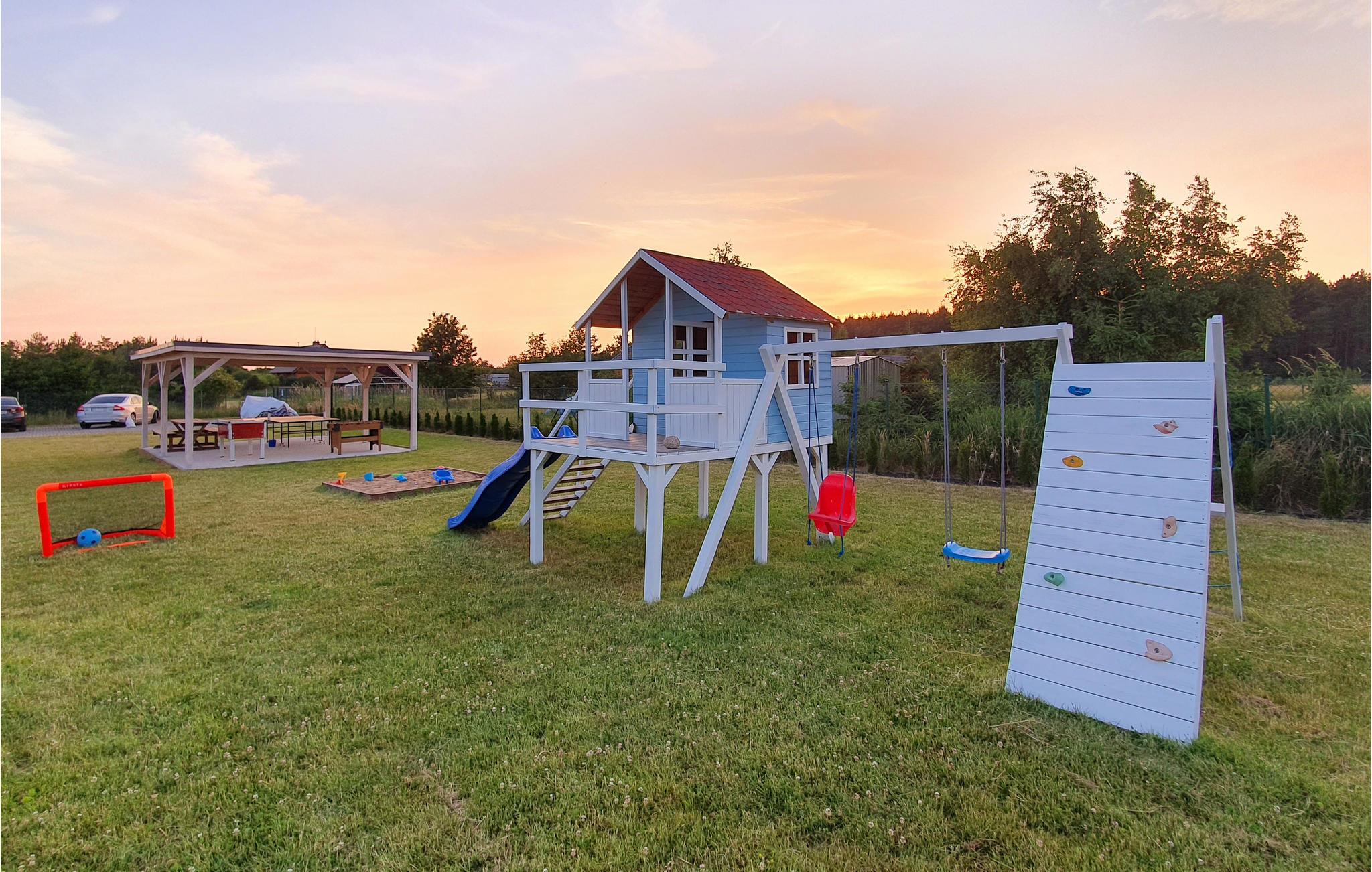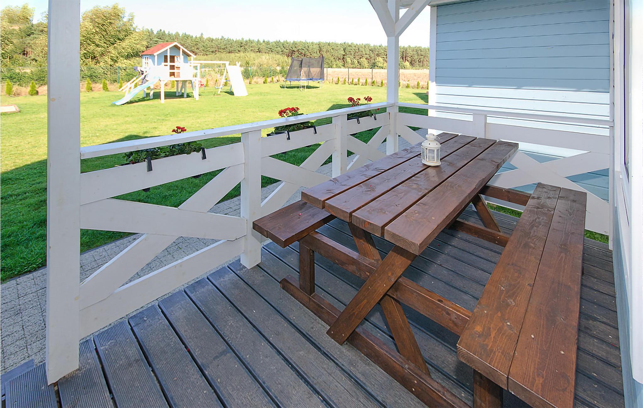 I landsbyen Radsiszkowo, kort afstand fra kystlandsbyen Jaroslawiec, byder dette børnevenlige sommerhus med røde pelargonier på terrassen, der byder jer velkommen, de ideelle rammer for en ferie med fart! I finder alt, hvad I har brug for, i den lyse sommerbolig med træflair. Lav pandekager med den søde tand til aftengildet på den overdækkede terrasse. Den store naturgrund er et sandt legeparadis! Lad børnene spille bordtennis, klatre, grave glade eller hoppe på trampolinen, indtil aftensmaden er klar.