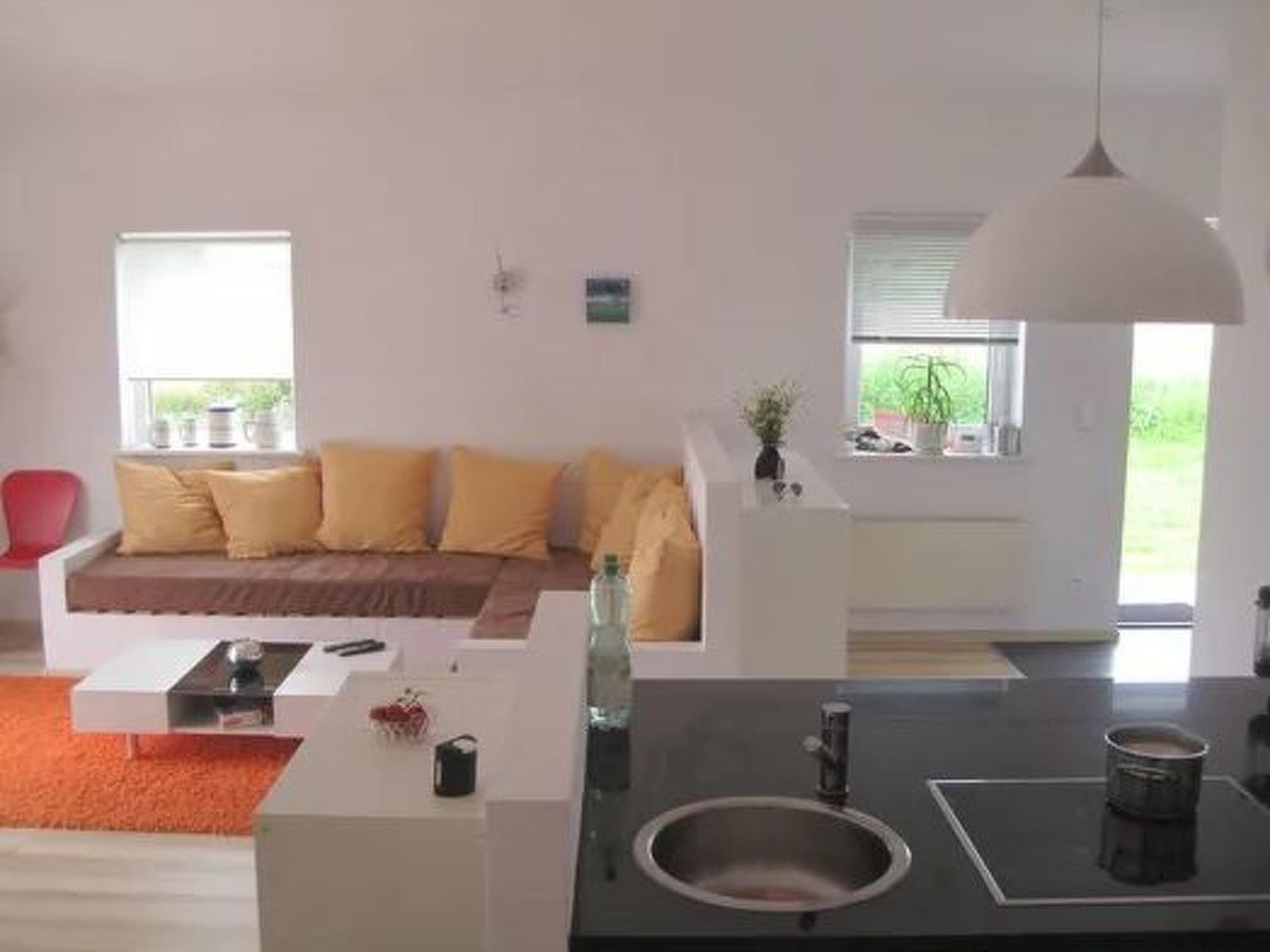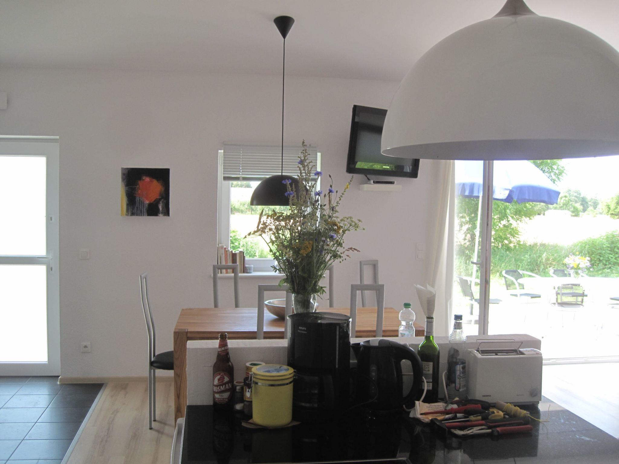 Each of the two generously proportioned flats has a beautiful terrace, which cannot even be seen by the neighbours, and from here you can gaze out over the beautiful landscape. In the summer months, storks often circle the sky or you can see pairs of cranes in the nearby fields. The modern, open-plan rooms are decorated with paintings by Berlin artist P. Lorenz and convey cosiness, warmth and a Mediterranean feeling. The large living area with kitchen block and dining table opens out onto the terrace and the green surroundings, making you feel like you are in an oasis. The special atmosphere that these rooms convey makes it easy for guests to stay at home, even when the weather is not so ideal.