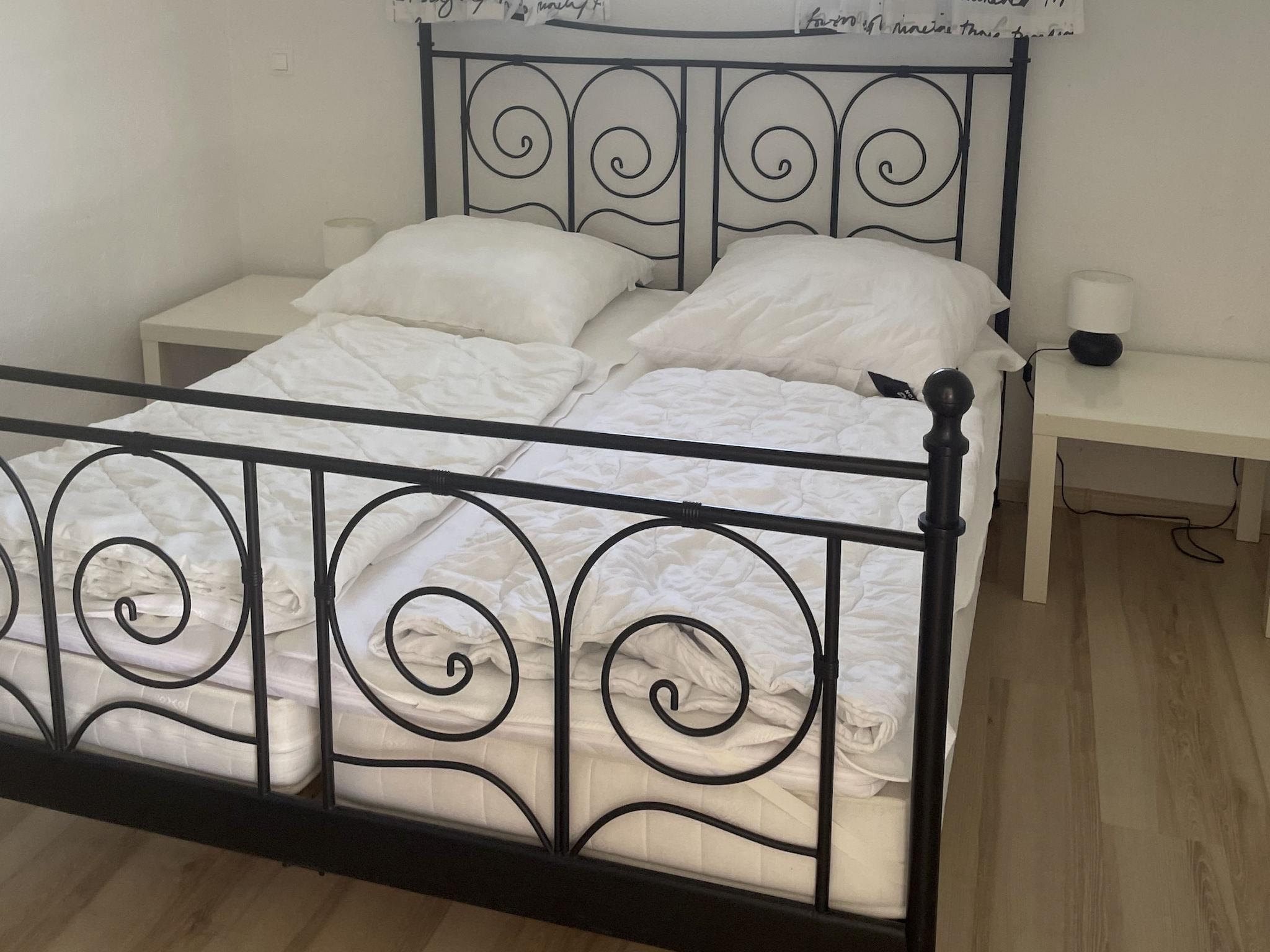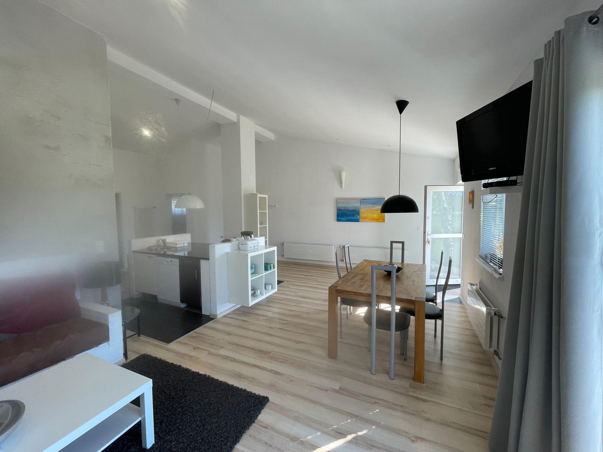 The modern, open-plan rooms are decorated with paintings by Berlin artist P. Lorenz and convey cosiness, warmth and a Mediterranean feel. The large living area with kitchen block and dining table opens out onto the terrace and the green surroundings, making you feel like you're in an oasis.