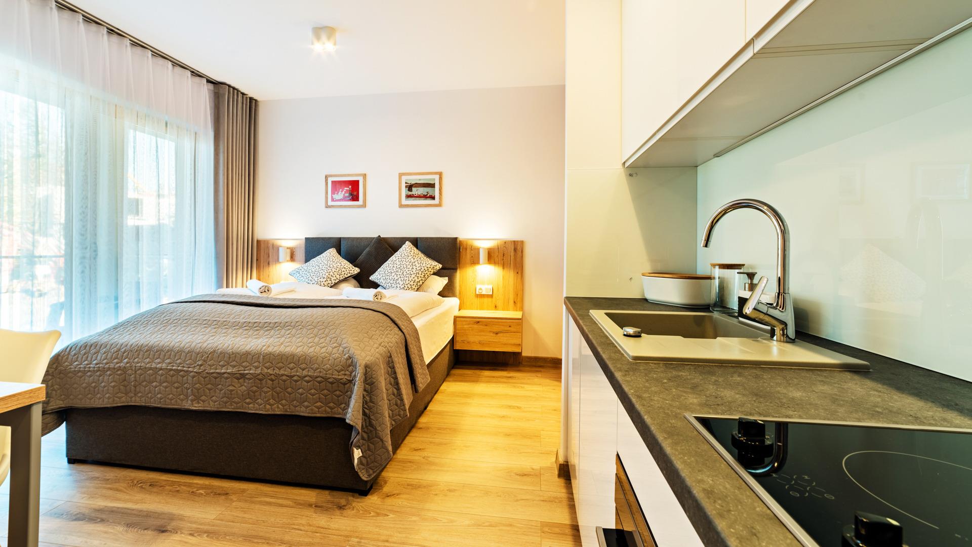 Jedes Apartment verfügt über eine gut ausgestattete Küchenzeile und Internetzugang.