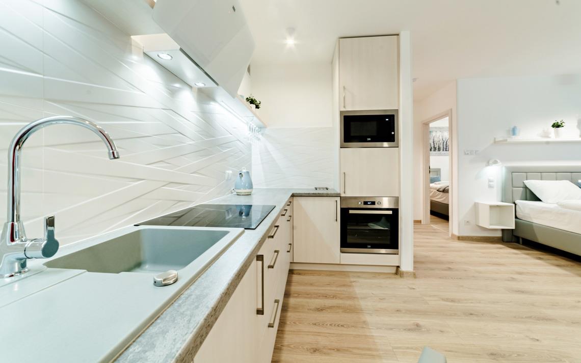 Jedes Apartment verfügt über eine gut ausgestattete Küchenzeile und Internetzugang.