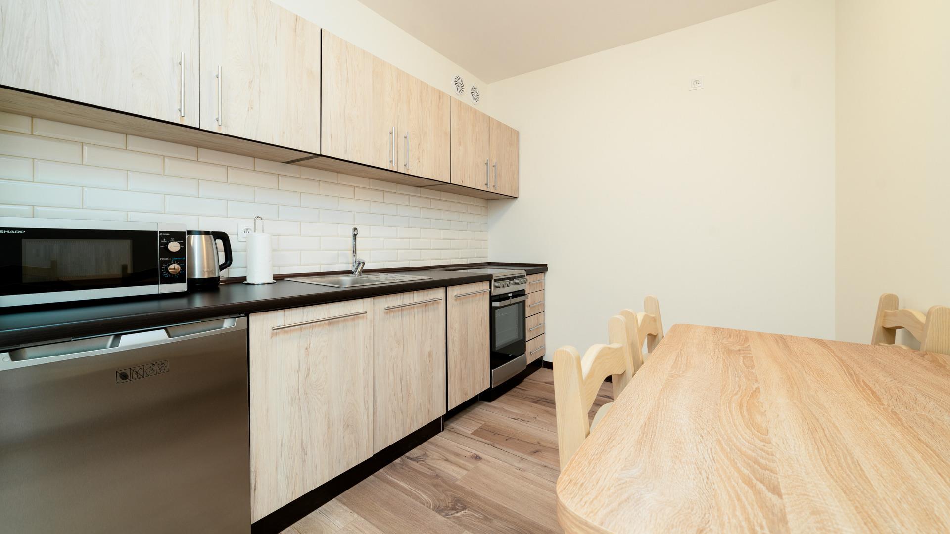 Alle angebotenen Apartments verfügen über eine voll ausgestattete Küchenzeile und ein elegantes Badezimmer mit Dusche.