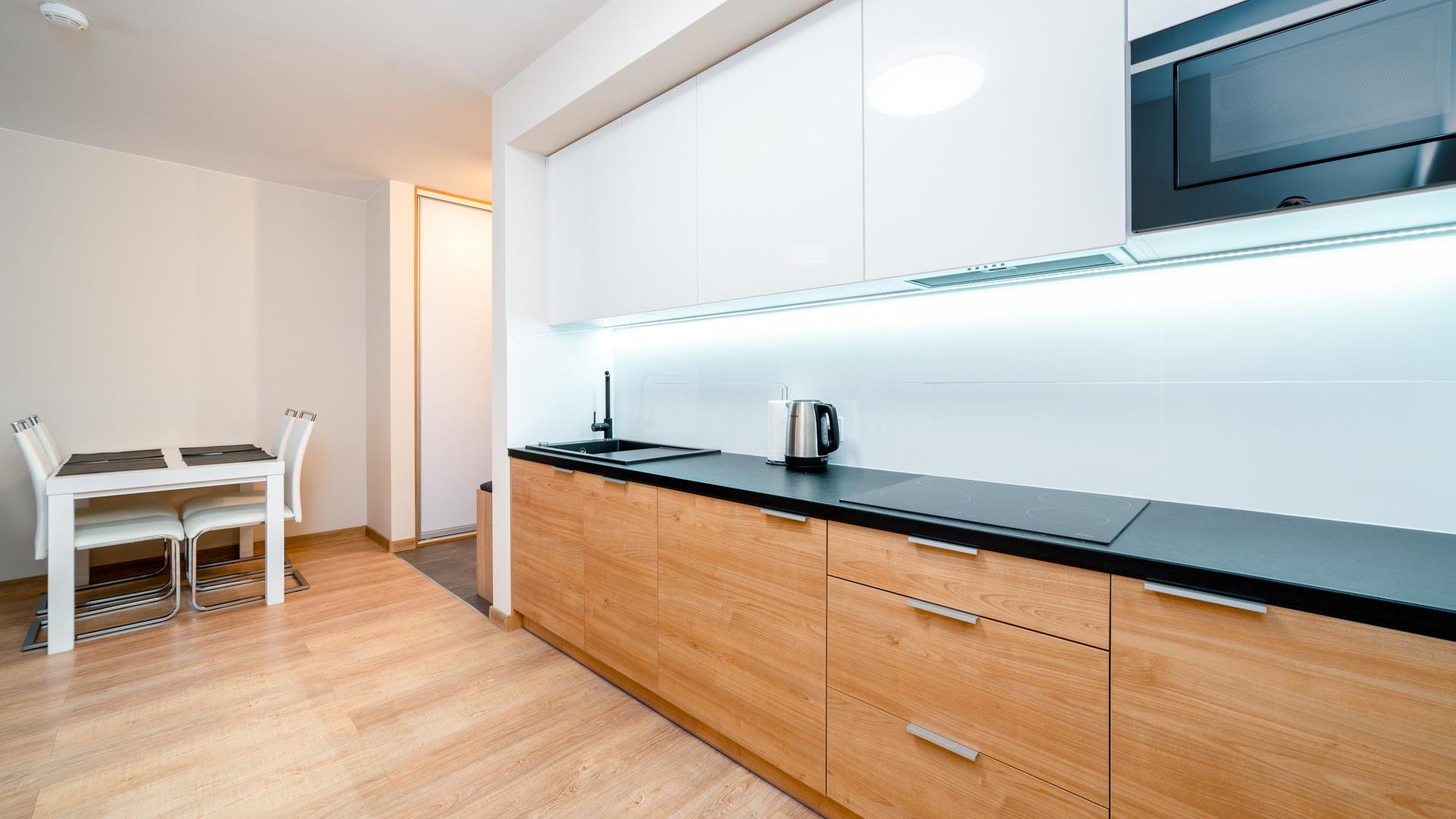 Alle angebotenen Apartments verfügen über eine voll ausgestattete Küchenzeile und ein elegantes Badezimmer mit Dusche.