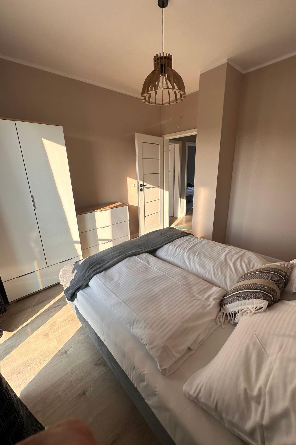 Rooms have large, comfortable 2-person beds, wardrobe, chest of drawers, bedside tables, lamps. In the living room there is a large corner sofa which can be unfolded.