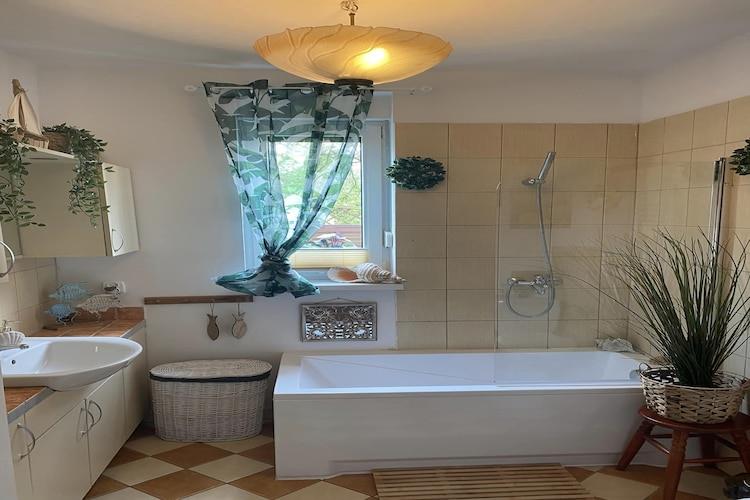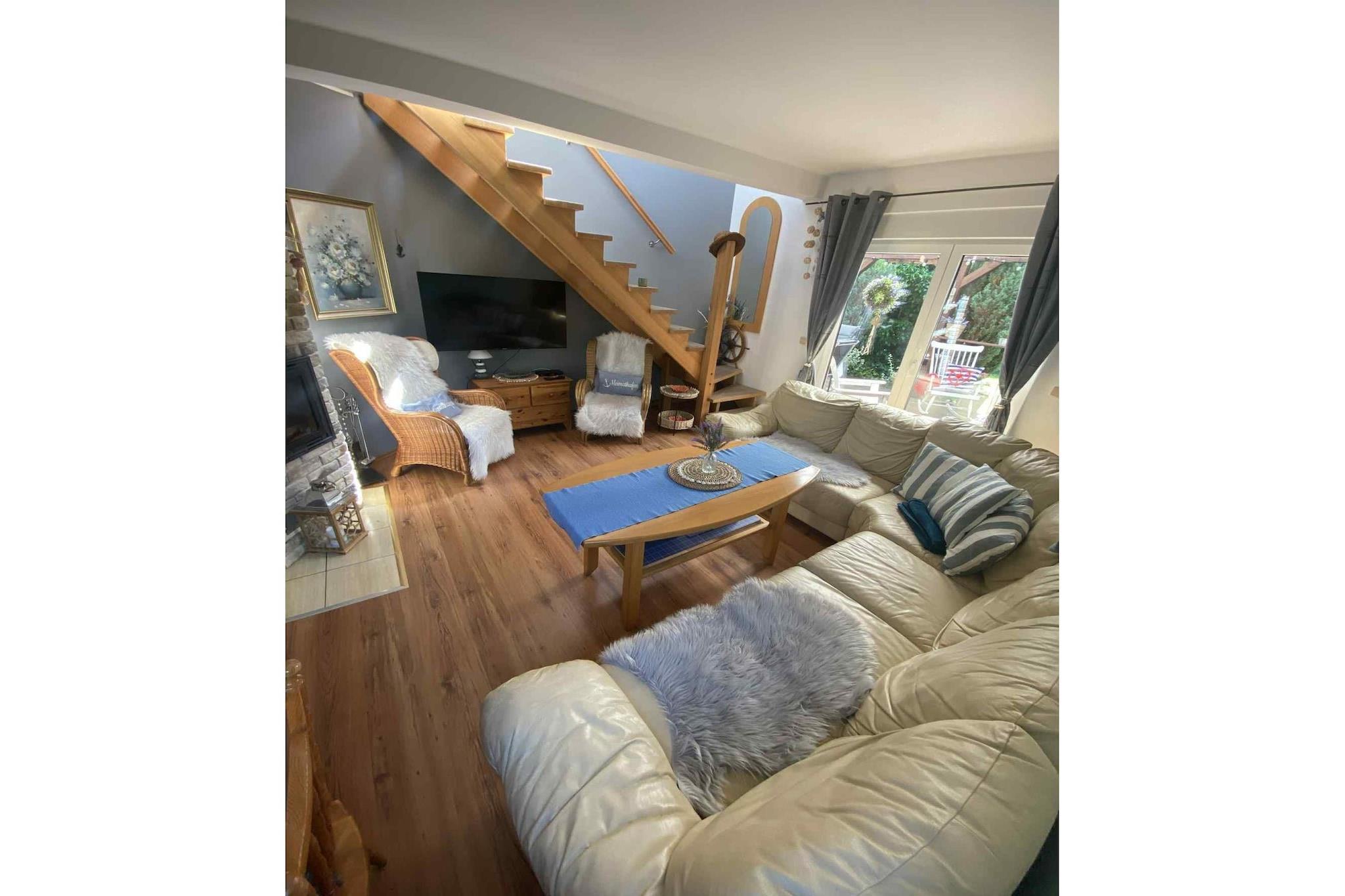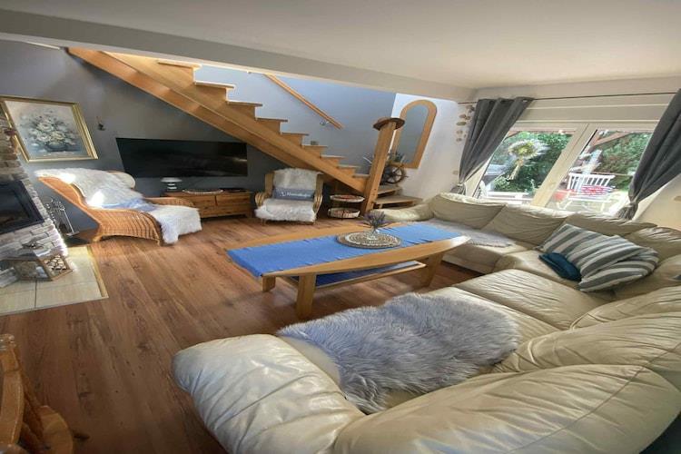 Stueetage: (Stue(Fjernsyn(Tyske TV-kanaler), spisebord, pejs, sofahjørne), åbent køkken(elkedel, cooker, brødrister, emhætte, espressomaskine, ovn, mikrobølgeovn, opvaskemaskine , køle-fryseskab, Blender, elektriske kogeplader), soveværelse(dobbeltseng), badeværelse(badekar, håndvask, toilet), veranda) På 1. etage: (soveværelse(enkeltseng, dobbeltseng), soveværelse(enkeltseng, dobbeltseng), badeværelse(bruser, håndvask, toilet), badeværelse(bruser, håndvask, toilet)) Internetadgang, have(privat, indhegnet, anlagt have, 600 m2), havemøbler, solstole, grill, parkering, Parasol, legeredskaber, bordtennisbord, hængekøje