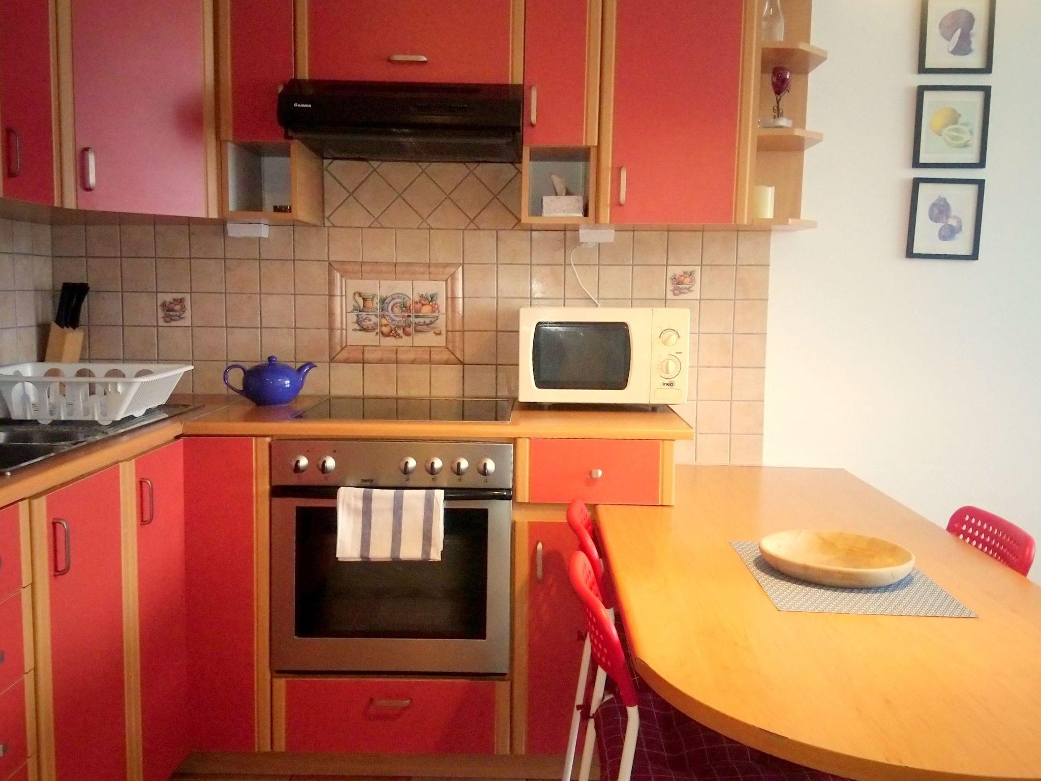 Kitchenette, fully equipped with oven, fridge with freezer, electric hob, electric kettle, microwave, cutlery, pots, pans etc.. In addition, hoover, iron, ironing board, hairdryer, stand.