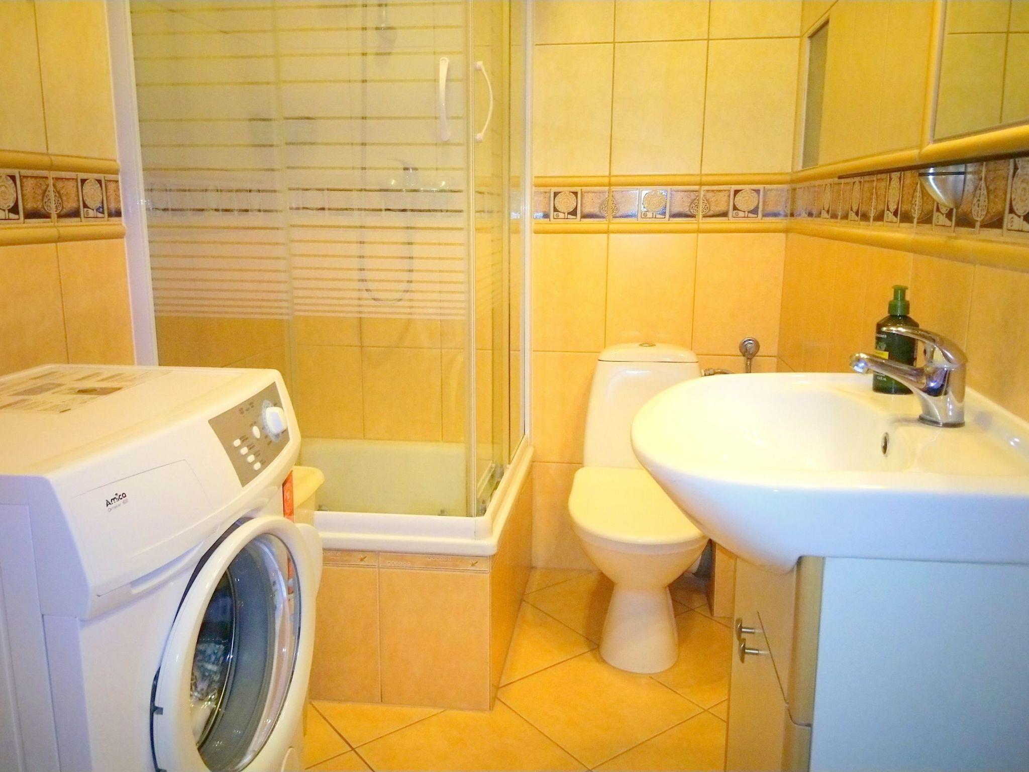 Bathroom with shower cubicle, toilet, washbasin, washing machine, hairdryer. Towels provided.