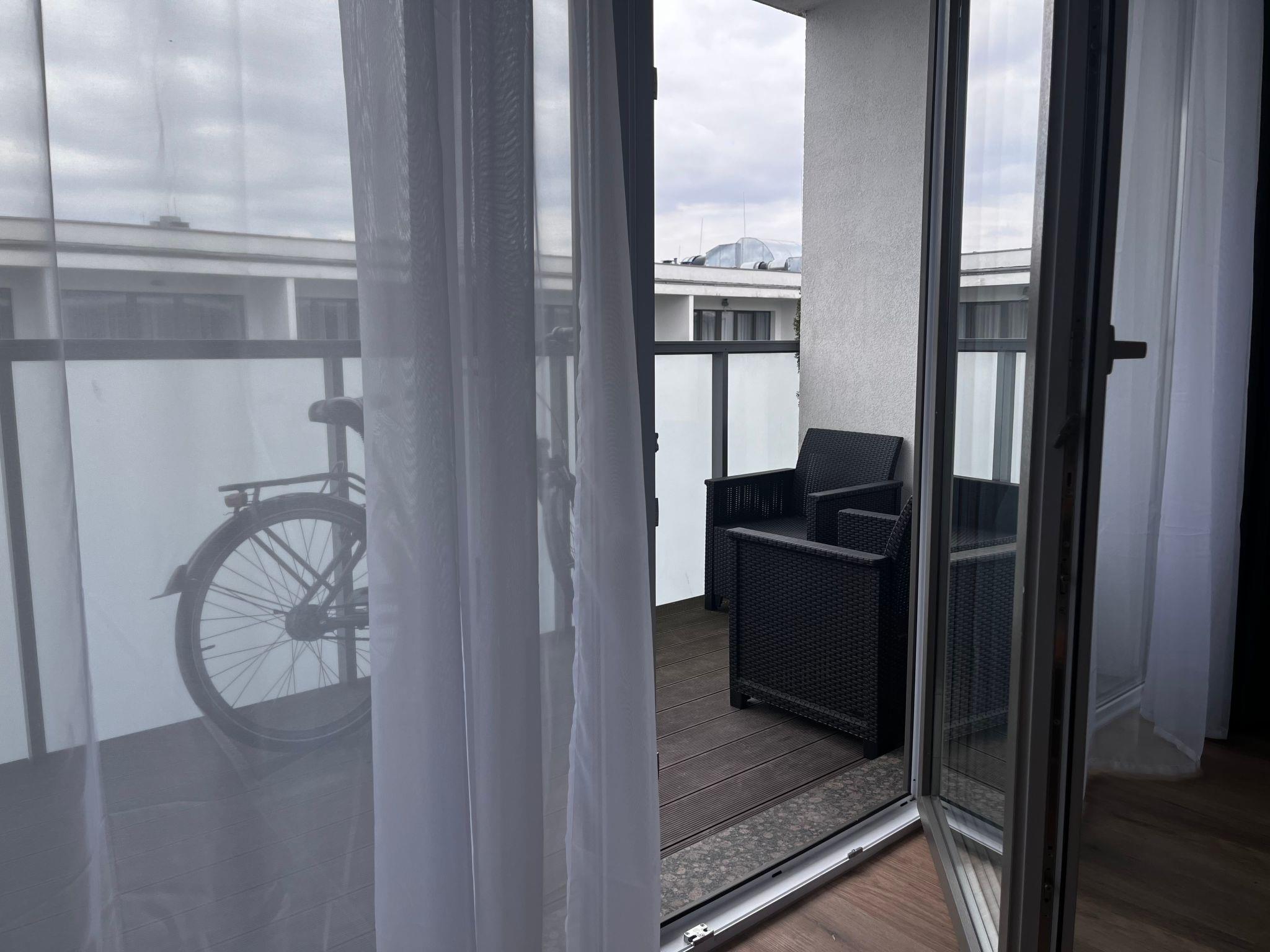 Outside, the flat has a charming balcony, which is furnished with comfortable furniture. This is the perfect place to start the day with a cup of coffee or relax in the evening, enjoying the fresh air.