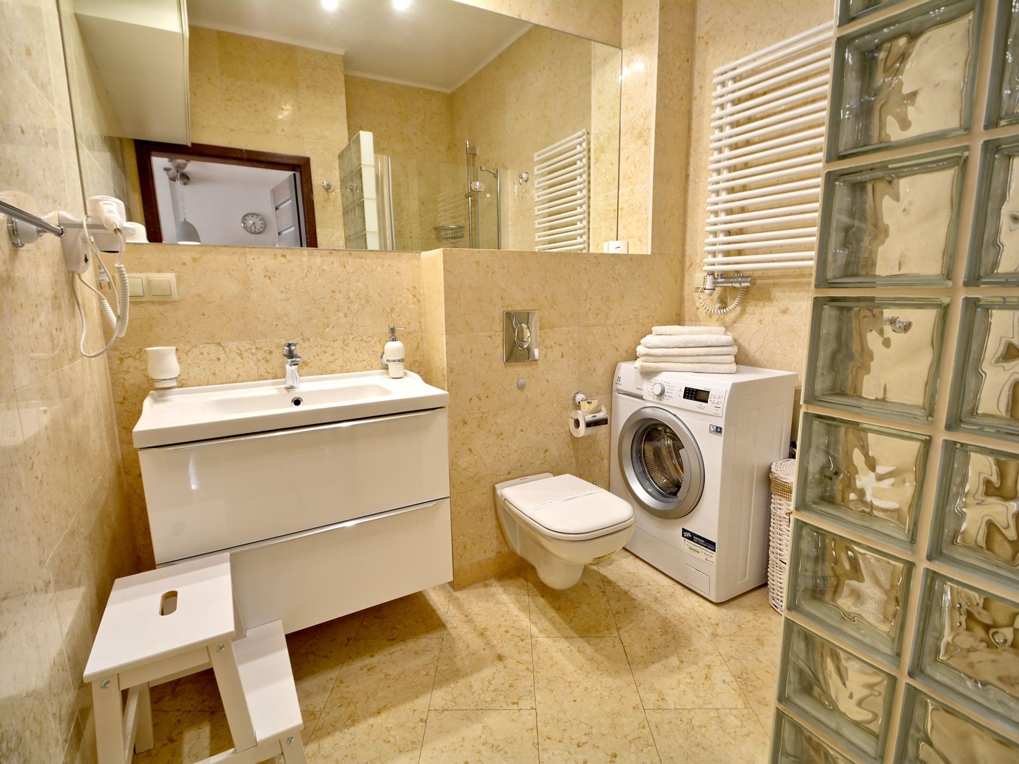 - the bathroom, which has a shower cubicle, washbasin, toilet, hairdryer, cotton towels and washing machine;
