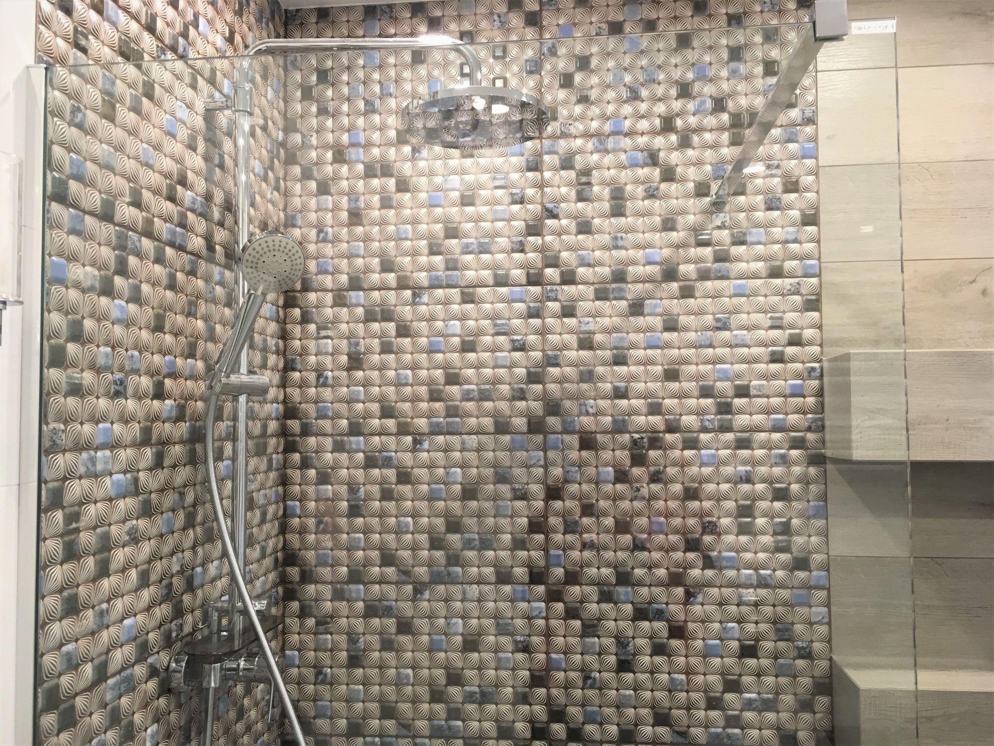 In the bathroom, shower with rain shower, hairdryer, towels.