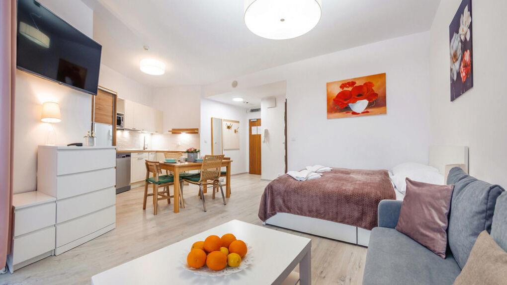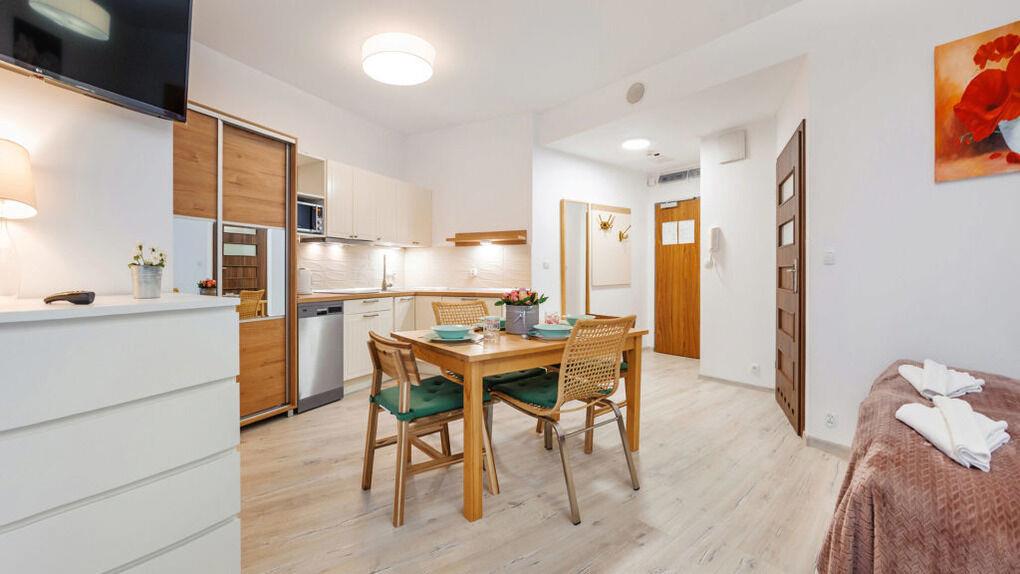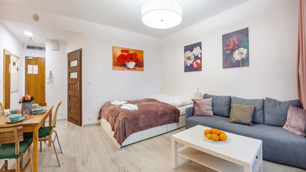 • Haustiere sind in der ausgewählten Wohnung erlaubt. Die Kosten für den Aufenthalt mit einem Haustier betragen 40 PLN pro Tag.