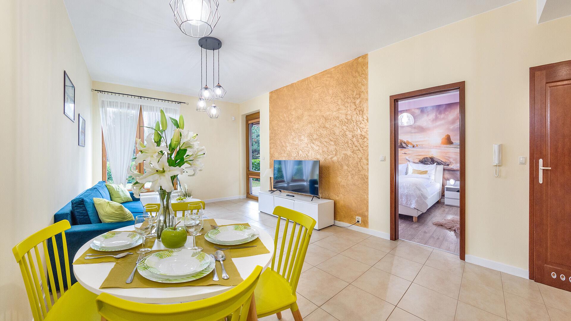 • Haustiere sind in der ausgewählten Wohnung erlaubt. Die Kosten für den Aufenthalt mit einem Haustier betragen 40 PLN pro Tag.