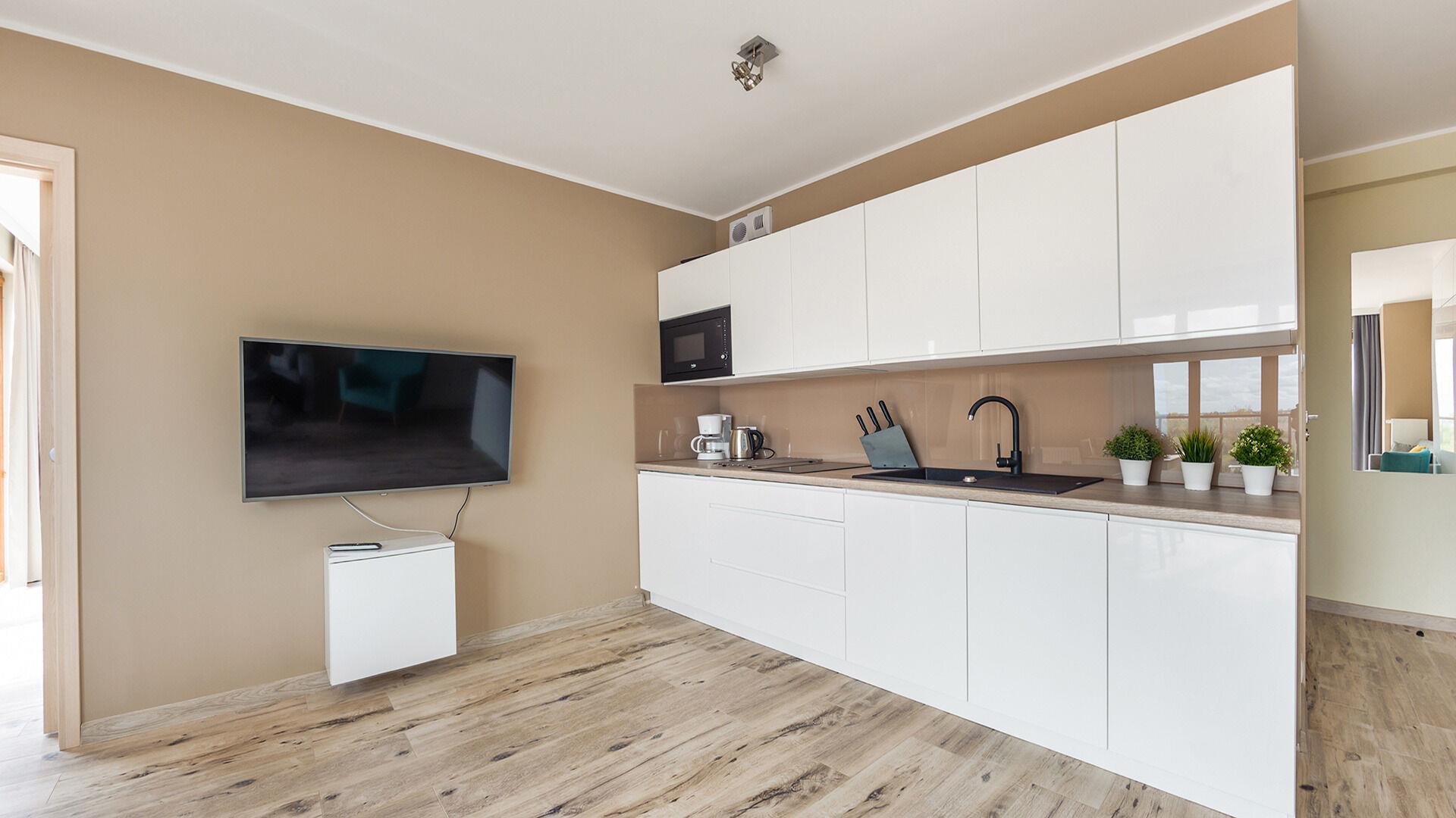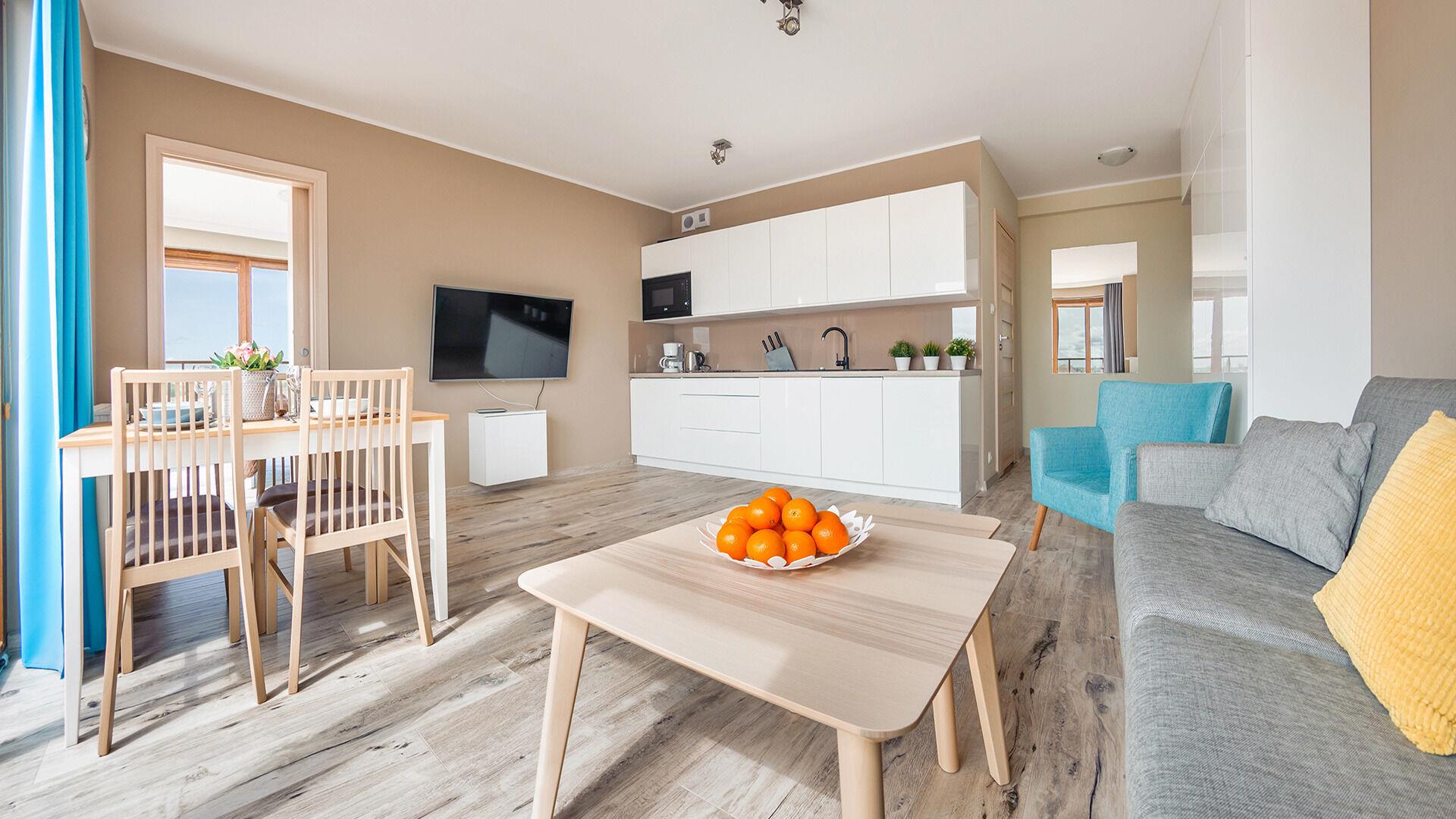 Die Apartments im Objekt Resorts Kolobrzeg befinden sich im westlichen Teil von Kolobrzeg, abseits des städtischen Trubels, umgeben vom Grün des NATURA-2000-Parks. Diese Lage garantiert saubere Luft, malerische Ausblicke und direkten Kontakt zur Natur. Die Plazowa-Straße mit ihren breiten Gehwegen und Radwegen ist ein Teil der R10-Fahrradroute. Ein fünfminütiger Spaziergang über einen direkten Zugang zum Meer reicht aus, um den breiten, sandigen „Weststrand” zu erreichen; ganz in der Nähe befindet sich auch ein Hundestrand. Alle Apartments sind hochwertig ausgestattet und verfügen über funktionale, voll ausgestattete Küchenzeilen sowie geräumige Terrassen mit Blick auf den Innenhof oder das Grün des NATURA-2000-Parks. Vor dem Gebäude gibt es einen öffentlichen, kostenpflichtigen Stadtparkplatz (begrenzte Anzahl an Stellplätzen). Auf dem Gelände stehen ein nummerierter Außenparkplatz sowie Parkplätze in der Tiefgarage zur Verfügung, die den meisten Apartments zugeordnet sind und gegen Aufpreis genutzt werden können. Im Objekt befindet sich ein Schwimmbad, das täglich von 10:00 bis 21:00 Uhr geöffnet ist, sowie eine Sauna, die täglich von 16:00 bis 21:00 Uhr geöffnet ist. Der Pool befindet sich im Gebäude A; aus Gebäude B gibt es keinen direkten Zugang zu Gebäude A.
