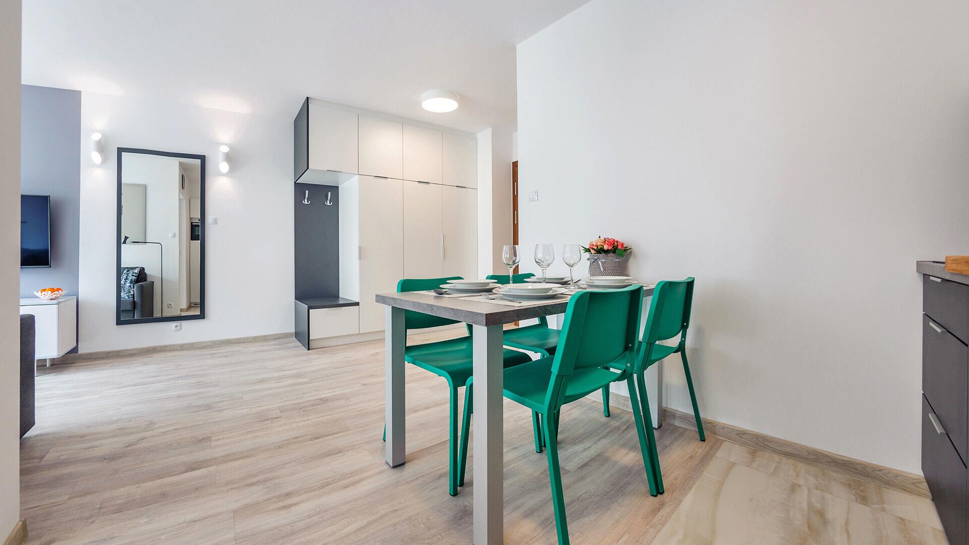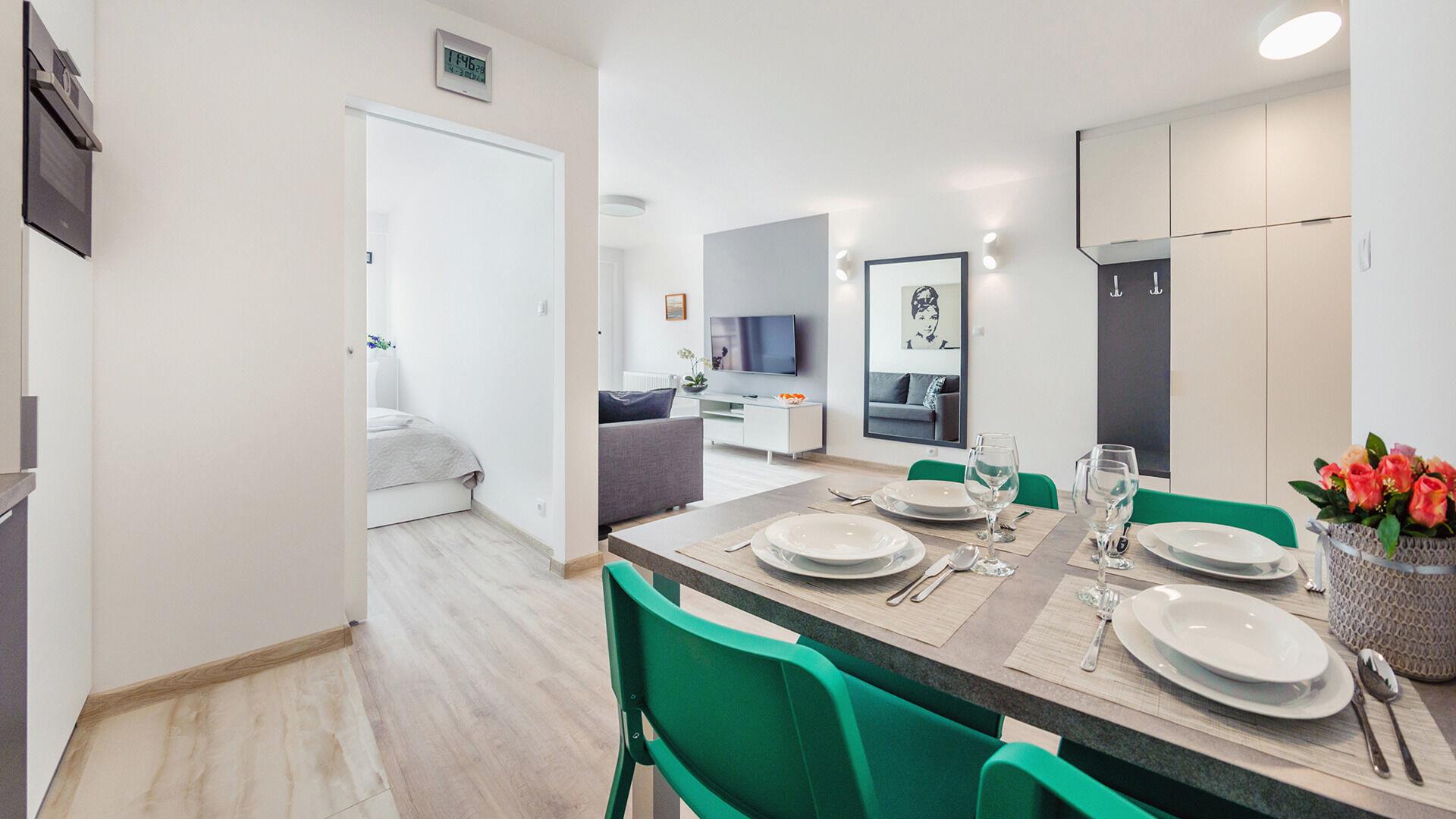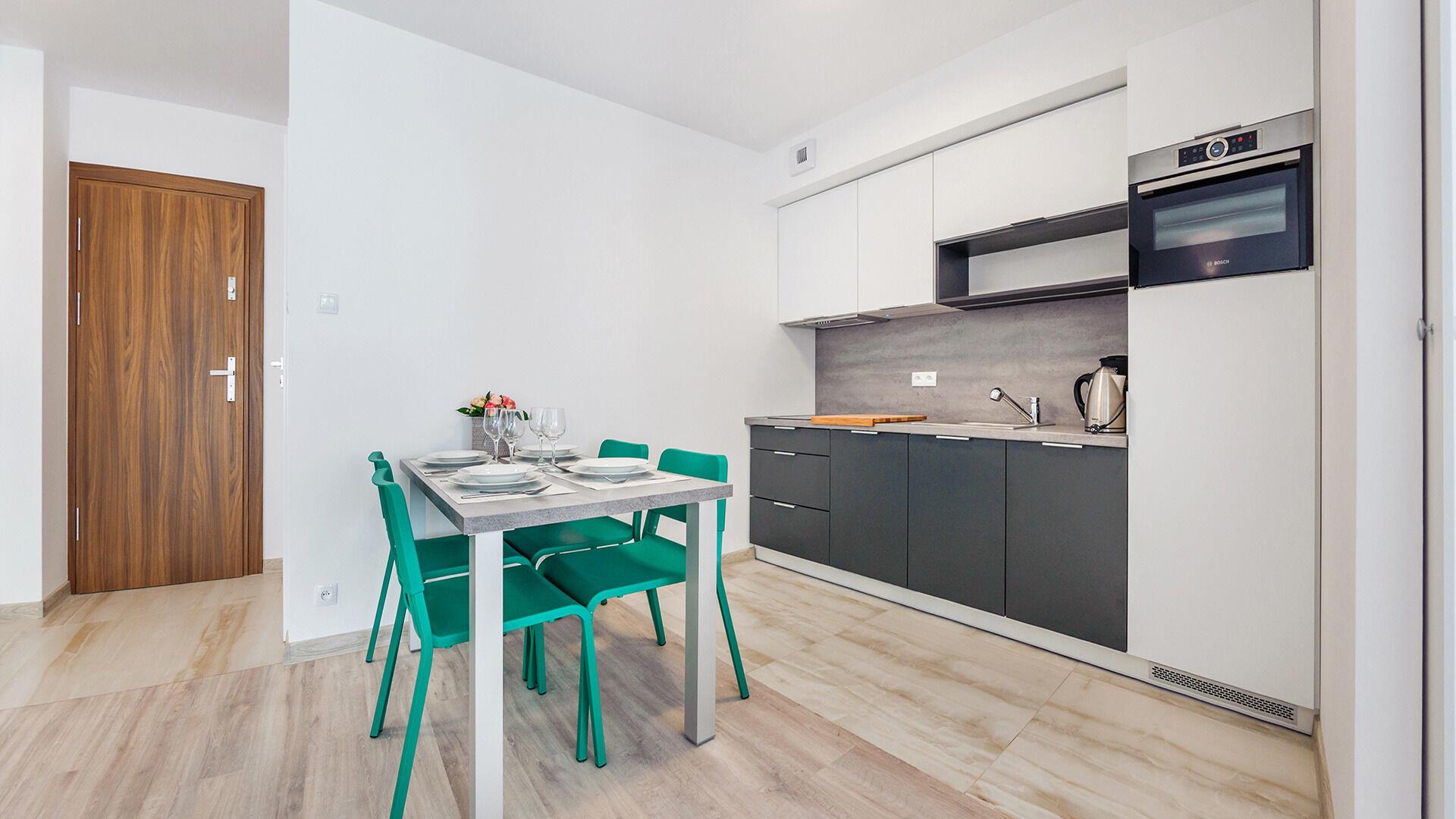 • Haustiere sind in der ausgewählten Wohnung erlaubt. Die Kosten für den Aufenthalt mit einem Haustier betragen 40 PLN pro Tag.